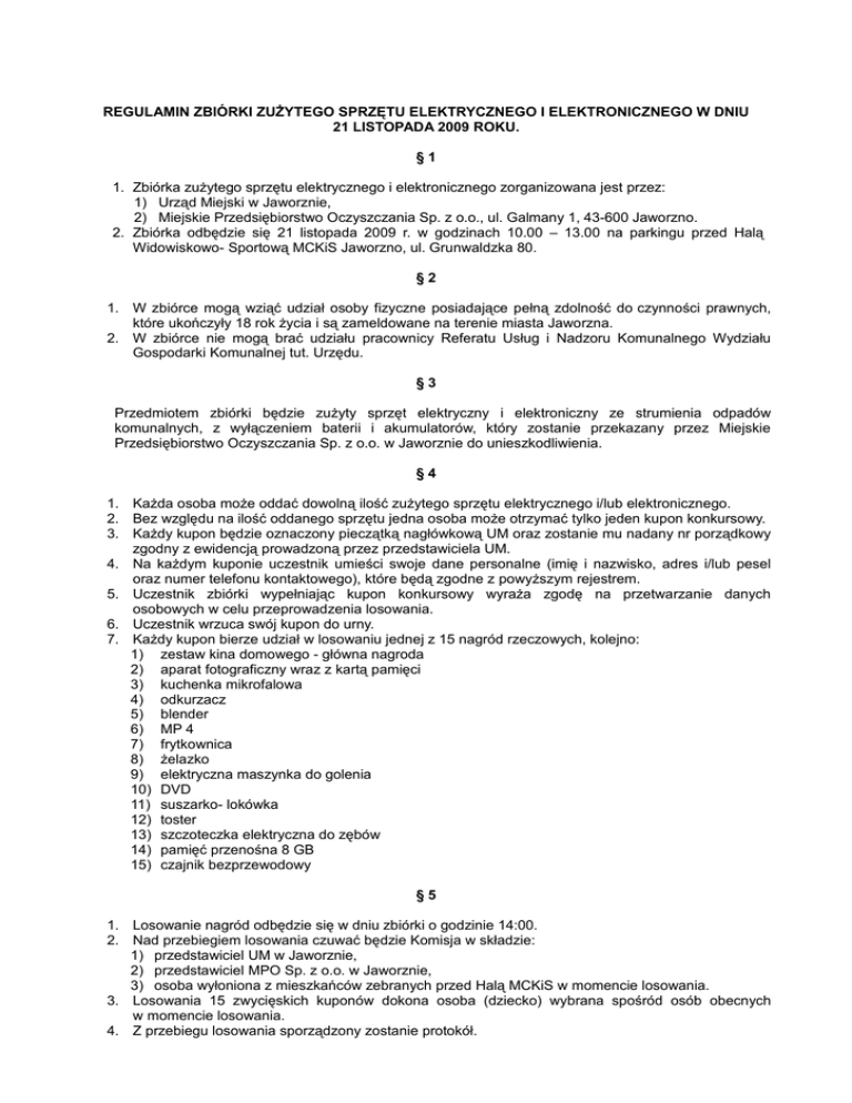 REGULAMIN ZBIÓRKI ZUŻYTEGO SPRZĘTU ELEKTRYCZNEGO I ELEKTRONICZNEGO W DNIU 21 LISTOPADA 2009 ROKU. §1 1. Zbiórka zużytego sprzętu elektrycznego i elektronicznego zorganizowana jest przez: 1) Urząd Miejski w Jaworznie, 2) Miejskie Przedsiębiorstwo Oczyszczania Sp. z o.o., ul. Galmany 1, 43-600 Jaworzno. 2. Zbiórka odbędzie się 21 listopada 2009 r. w godzinach 10.00 – 13.00 na parkingu przed Halą Widowiskowo- Sportową MCKiS Jaworzno, ul. Grunwaldzka 80. §2 1. W zbiórce mogą wziąć udział osoby fizyczne posiadające pełną zdolność do czynności prawnych, które ukończyły 18 rok życia i są zameldowane na terenie miasta Jaworzna. 2. W zbiórce nie mogą brać udziału pracownicy Referatu Usług i Nadzoru Komunalnego Wydziału Gospodarki Komunalnej tut. Urzędu. §3 Przedmiotem zbiórki będzie zużyty sprzęt elektryczny i elektroniczny ze strumienia odpadów komunalnych, z wyłączeniem baterii i akumulatorów, który zostanie przekazany przez Miejskie Przedsiębiorstwo Oczyszczania Sp. z o.o. w Jaworznie do unieszkodliwienia. §4 1. Każda osoba może oddać dowolną ilość zużytego sprzętu elektrycznego i/lub elektronicznego. 2. Bez względu na ilość oddanego sprzętu jedna osoba może otrzymać tylko jeden kupon konkursowy. 3. Każdy kupon będzie oznaczony pieczątką nagłówkową UM oraz zostanie mu nadany nr porządkowy zgodny z ewidencją prowadzoną przez przedstawiciela UM. 4. Na każdym kuponie uczestnik umieści swoje dane personalne (imię i nazwisko, adres i/lub pesel oraz numer telefonu kontaktowego), które będą zgodne z powyższym rejestrem. 5. Uczestnik zbiórki wypełniając kupon konkursowy wyraża zgodę na przetwarzanie danych osobowych w celu przeprowadzenia losowania. 6. Uczestnik wrzuca swój kupon do urny. 7. Każdy kupon bierze udział w losowaniu jednej z 15 nagród rzeczowych, kolejno: 1) zestaw kina domowego - główna nagroda 2) aparat fotograficzny wraz z kartą pamięci 3) kuchenka mikrofalowa 4) odkurzacz 5) blender 6) MP 4 7) frytkownica 8) żelazko 9) elektryczna maszynka do golenia 10) DVD 11) suszarko- lokówka 12) toster 13) szczoteczka elektryczna do zębów 14) pamięć przenośna 8 GB 15) czajnik bezprzewodowy §5 1. Losowanie nagród odbędzie się w dniu zbiórki o godzinie 14:00. 2. Nad przebiegiem losowania czuwać będzie Komisja w składzie: 1) przedstawiciel UM w Jaworznie, 2) przedstawiciel MPO Sp. z o.o. w Jaworznie, 3) osoba wyłoniona z mieszkańców zebranych przed Halą MCKiS w momencie losowania. 3. Losowania 15 zwycięskich kuponów dokona osoba (dziecko) wybrana spośród osób obecnych w momencie losowania. 4. Z przebiegu losowania sporządzony zostanie protokół. §6 1. Wyniki losowania zostaną ogłoszone bezpośrednio po losowaniu każdej z nagród oraz podane do publicznej wiadomości wraz z terminem rozdania nagród w ciągu 5 dni roboczych od daty losowania. 2. Nagrody zostaną wręczone przez Prezydenta Miasta Jaworzna lub osobę upoważnioną bezpośrednio po wylosowaniu każdego z 15 zwycięskich kuponów. 3. Odbioru nagrody dokonuje osobiście zwycięzca losowania lub osoba posiadająca pisemne upoważnienie wystawione przez zwycięzcę losowania. 4. Osoba odbierająca nagrodę powinna udokumentować swoją tożsamość dowodem osobistym i potwierdzić własnoręcznym podpisem odbiór nagrody. 5. Nagrody nieodebrane w dniu losowania, będzie można odebrać w budynku UM w Jaworznie, Wydział Gospodarki Komunalnej, ul. Dwornickiego 5 w terminie do 10 dni roboczych od dnia rozdania nagród. 6. Nieodebrane nagrody w terminie jw. zostaną przekazane do Powiatowej Placówki OpiekuńczoWychowawczej w Jaworznie, ul. Hetmańska 20.
