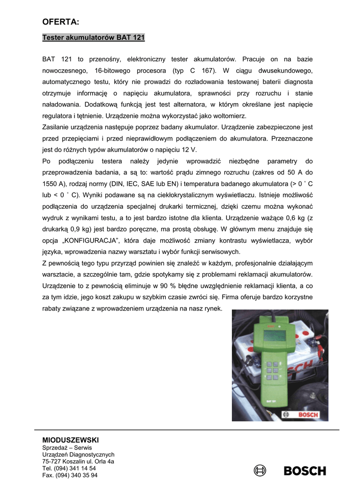 OFERTA: Tester akumulatorów BAT 121 BAT 121 to przenośny, elektroniczny tester akumulatorów. Pracuje on na bazie nowoczesnego, 16-bitowego procesora (typ C 167). W ciągu dwusekundowego, automatycznego testu, który nie prowadzi do rozładowania testowanej baterii diagnosta otrzymuje informację o napięciu akumulatora, sprawności przy rozruchu i stanie naładowania. Dodatkową funkcją jest test alternatora, w którym określane jest napięcie regulatora i tętnienie. Urządzenie można wykorzystać jako woltomierz. Zasilanie urządzenia następuje poprzez badany akumulator. Urządzenie zabezpieczone jest przed przepięciami i przed nieprawidłowym podłączeniem do akumulatora. Przeznaczone jest do różnych typów akumulatorów o napięciu 12 V. Po podłączeniu testera należy jedynie wprowadzić niezbędne parametry do przeprowadzenia badania, a są to: wartość prądu zimnego rozruchu (zakres od 50 A do 1550 A), rodzaj normy (DIN, IEC, SAE lub EN) i temperatura badanego akumulatora (> 0 ˚ C lub < 0 ˚ C). Wyniki podawane są na ciekłokrystalicznym wyświetlaczu. Istnieje możliwość podłączenia do urządzenia specjalnej drukarki termicznej, dzięki czemu można wykonać wydruk z wynikami testu, a to jest bardzo istotne dla klienta. Urządzenie ważące 0,6 kg (z drukarką 0,9 kg) jest bardzo poręczne, ma prostą obsługę. W głównym menu znajduje się opcja „KONFIGURACJA”, która daje możliwość zmiany kontrastu wyświetlacza, wybór języka, wprowadzenia nazwy warsztatu i wybór funkcji serwisowych. Z pewnością tego typu przyrząd powinien się znaleźć w każdym, profesjonalnie działającym warsztacie, a szczególnie tam, gdzie spotykamy się z problemami reklamacji akumulatorów. Urządzenie to z pewnością eliminuje w 90 % błędne uwzględnienie reklamacji klienta, a co za tym idzie, jego koszt zakupu w szybkim czasie zwróci się. Firma oferuje bardzo korzystne rabaty związane z wprowadzeniem urządzenia na nasz rynek. MIODUSZEWSKI Sprzedaż – Serwis Urządzeń Diagnostycznych 75-727 Koszalin ul. Orla 4a Tel. (094) 341 14 54 Fax. (094) 340 35 94