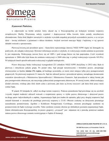 Szanowni Państwo, w odpowiedzi na krótki artykuł, który ukazał się w Rzeczpospolitej po kolejnym terminie rozprawy związkowców Służby Więziennej, należy wyjaśnić i doprecyzować kilka kwestii, które zostały niewłaściwie sformułowane. Duża ilość błędów zawartych w artykule wywołała niepokój przyszłych uczestników pozwu, a co za tym idzie – lawinę telefonów z pytaniami o dalsze działania. Artykuł zawierał znaczące błędy i będziemy w tej sprawie składali wniosek o sprostowanie. Pierwszą kwestią jest przedmiot sporu – Kancelaria reprezentując interesy NSZZ FiPW nigdy nie domagała się podwyżek, ale zaległej waloryzacji. Również informacja zawarta w artykule, że waloryzacja została ustalona na poziomie 0, jest nieprawdą. Waloryzację zawsze liczy się od 100% i pod uwagę bierze się lata poprzednie. Czyli wysokość uposażenia w 2008 roku była brana do ustalenia waloryzacji w 2009 roku (np. w policji waloryzacja wynosiła 103,9%). W kolejnych latach sposób naliczania waloryzacji wyglądał analogicznie. Pozew dotyczący braku waloryzacji wynagrodzeń 221 członków NSZZ FiPW złożyliśmy w 2012 roku. Była to pierwsza i dotychczas jedyna grupa. Po ponad roku, Sąd przyjął merytorycznie i formalnie pozew, przyjmując równocześnie co bardzo istotne 2% wpisu, od każdego uczestnika, co może mieć miejsce tylko przy postępowaniach grupowych. Na pierwszej rozprawie 21 marca br. Sąd nie odrzucił pozwu i procedował sprawę, zarządzając dostarczenie wniosków dowodowych z Ministerstwa Sprawiedliwości i Ministerstwa Finansów. Sąd procedował w takiej formie jak przy postępowaniu zbiorowym, nie nazywając jednocześnie postępowania zbiorowym. W naszej ocenie, skład orzekający działał ostrożnie, wiedząc jaka ilość służb czeka z pozwami, jaki duże są kwoty roszczeń i jak duża ilość pracy może czekać Sądy. W piątek 28 listopada br. odbył się drugi termin rozprawy. Podczas posiedzenia Sąd powołując się na zawiłość i wysoki stopień trudności odrzucił wniosek o rozpatrzenie sprawy w trybie pozwu zbiorowego i skierował pozew na drogę spraw indywidualnych o zapłatę. Argumentacja Sądu jest trudna do opisania, gdyż przy drugiej rozprawie Sąd zmienił kierunek w stosunku do przebiegu pierwszej rozprawy z 21.03. Obecnie czekamy na doręczenie pisemnego uzasadnienia postanowienia. Zgodnie z Kodeksem Postępowania Cywilnego, stronom przysługuje zażalenie na postanowienie do Sądu wyższego szczebla. Takie zażalenie zostanie złożone po dokładnym poznaniu argumentacji Sądu. Zatem sformułowanie Rzeczpospolitej, że pozew grupowy „przepadł” jest mijaniem się z prawdą, ponieważ nadanie statusu pozwu zbiorowego zostanie rozstrzygnięte w Sądzie II Instancji. OMEGA KANCELARIE PRAWNE SP. Z O .O. 1 00-680 Warszawa, ul. Poznańska 3 lok.18 Tel. (22) 462 31 66, 600-185-900 [email protected] www.omega-kancelaria.pl Obecnie Sąd skierował pozew na drogę spraw indywidualnych, które jednak nie wchodzą w grę na tym etapie z racji kosztów przypadających na każdą osobę. Problemem jest także aspekt techniczno – organizacyjny. Niewykonalna jest bowiem obsługa kilku tysięcy spraw w jednym czasie np. 2-3 miesięcy. Temat formy postępowania zatem nie jest rozstrzygnięty. Spodziewamy się, że o orzeczeniu Sądu II Instancji dowiemy się w przeciągu roku z uwagi na odległe terminy. Od początku liczyliśmy się z tym, że sprawa jest trudna i ma charakter wyjątkowy. Sądy nigdy nie spotkały się z tak wielką skalą roszczeń. Jednak co najważniejsze, Sąd zmieniając formę postępowania, nie zakwestionował podstawy prawnej roszczeń i ich zasadności. Dzisiaj mamy więcej podstaw ku temu by twierdzić, że roszczenia są słuszne. Odrzucenie nie odbyło się na podstawie obowiązujących przepisów prawa. Nie tracimy zatem przekonania, pracujemy dalej nad pozwani kolejnych Związków Zawodowych, które się do nas zgłosiły. W Polsce obowiązuje porządek kontynentalny, nie ma zastosowania zasada precedensu, istnieje więc realna szansa, że kolejne pozwy będą procedowane w postępowaniu grupowym, ponieważ Sądy nie są zobowiązane orzekać analogicznie. Już dziś warto zatem wiedzieć i pamiętać, że będzie to bardzo trudna walka każdego Związku na wszystkich etapach postępowania. W imieniu Zarządu Kancelarii jeszcze raz proszę wszystkich o nie poddawanie się złym emocjom. Cały przekaz medialny jak i obecna argumentacja z która spotkaliśmy się służy temu by wywołać postawę zniechęcenia i rezygnacji z dochodzenia swoich praw i roszczeń. Pamiętajmy, że sprawa jest bardzo trudna, a siłą zbiorowych roszczeń jest charakter społeczny mający wydźwięk w jak największej liczbie uczestników. Zarząd Omega Kancelarie Prawne Sp. z o. o. OMEGA KANCELARIE PRAWNE SP. Z O .O. 2 00-680 Warszawa, ul. Poznańska 3 lok.18 Tel. (22) 462 31 66, 600-185-900 [email protected] www.omega-kancelaria.pl