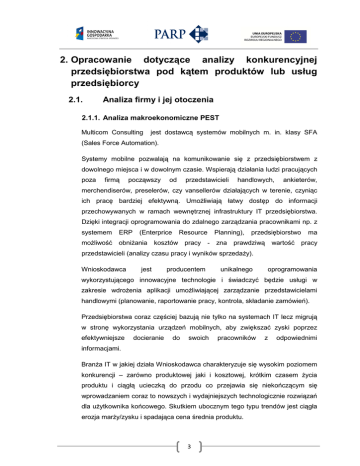 2. Opracowanie dotyczące analizy konkurencyjnej przedsiębiorstwa pod kątem produktów lub usług przedsiębiorcy 2.1. Analiza firmy i jej otoczenia 2.1.1. Analiza makroekonomiczne PEST Multicom Consulting jest dostawcą systemów mobilnych m. in. klasy SFA (Sales Force Automation). Systemy mobilne pozwalają na komunikowanie się z przedsiębiorstwem z dowolnego miejsca i w dowolnym czasie. Wspierają działania ludzi pracujących poza firmą począwszy od przedstawicieli handlowych, ankieterów, merchendiserów, preselerów, czy vansellerów działających w terenie, czyniąc ich pracę bardziej efektywną. Umożliwiają łatwy dostęp do informacji przechowywanych w ramach wewnętrznej infrastruktury IT przedsiębiorstwa. Dzięki integracji oprogramowania do zdalnego zarządzania pracownikami np. z systemem ERP (Enterprice Resource Planning), przedsiębiorstwo ma możliwość obniżania kosztów pracy - zna prawdziwą wartość pracy przedstawicieli (analizy czasu pracy i wyników sprzedaży). Wnioskodawca jest producentem unikalnego oprogramowania wykorzystującego innowacyjne technologie i świadczyć będzie usługi w zakresie wdrożenia aplikacji umożliwiającej zarządzanie przedstawicielami handlowymi (planowanie, raportowanie pracy, kontrola, składanie zamówień). Przedsiębiorstwa coraz częściej bazują nie tylko na systemach IT lecz migrują w stronę wykorzystania urządzeń mobilnych, aby zwiększać zyski poprzez efektywniejsze docieranie do swoich pracowników z odpowiednimi informacjami. Branża IT w jakiej działa Wnioskodawca charakteryzuje się wysokim poziomem konkurencji – zarówno produktowej jaki i kosztowej, krótkim czasem życia produktu i ciągłą ucieczką do przodu co przejawia się niekończącym się wprowadzaniem coraz to nowszych i wydajniejszych technologicznie rozwiązań dla użytkownika końcowego. Skutkiem ubocznym tego typu trendów jest ciągła erozja marży/zysku i spadająca cena średnia produktu. 3 Poniższe tabele zawierają spojrzenie na otoczenie dalsze PEST: 2.1.2. Czynniki polityczne i prawne Szansa Wpływ szansy na przedsiębiorstwa Polska w UE Wdrażanie Strategii zrównoważonego postrzeganie Lizbońskiej rozwoju), Polski (strategii pozytywne przez inwestorów zagranicznych staje się szansą dla firmy Dostosowujące się Częste zmiany uwarunkowania prawne konieczność wdrażania przez przedsiębiorców rozwiązań przepisów – powodujące ułatwiających prowadzenie działalności w warunkach zmieniających się wymagań; w tym też rozwiązania informatyczne. Dotacje z Unii Europejskiej Programy te przeznaczone są na wspieranie w ramach PO IG innowacyjności oraz wzrost wykorzystania technologii informatycznych w gospodarce. Zagrożenia Wpływ zagrożenia na przedsiębiorstwa Zbyt wolne tempo zmian Od wielu lat sygnalizowane jest wprowadzanie prawnych związanych z e- przepisów gospodarką szybszy prawnych, rozwój które e-biznesu. umożliwiałyby Wciąż jednak zachodzące zmiany nie są dostosowane do możliwości nowoczesnych rozwiązań IT 2.1.3. Czynniki ekonomiczne Szansa Wpływ szansy na przedsiębiorstwa Wysoki poziom inwestycji Powoduje to zagranicznych przedsiębiorstw poprawiającymi zainteresowanie rozwiązaniami wzrost efektywności zarządzania Stabilny wzrost gospodarczy na Wywiera poziomie wyższym niż w Unii inwestycji w tym również w informatykę. Europejskiej 4 to pozytywny klimat do Systematyczny wzrost rynku informatycznego Firma w 2008 roku odnotowała 4krotny wzrost przychodów, co oznacza, że Wnioskodawca dobrze wykorzystuje możliwości, które wystąpiły na rynku. Porównanie tych wyników ze średnią wzrostu (14%) pokazuje, że Wnioskodawca zdobywa lepszą pozycję rynkową. Dodatnie tempo wzrostu PKB W 2009 roku PKB wyniósł 1,7% i był najwyższym wskaźnikiem w UE. Prognozowany wzrost PKB dla 2010 r. wynosi 2,6%. Dobra koniunktura gospodarcza wpływa na rozwój Wnioskodawcy, i pozwala planować dalsze dobre wyniki na następne lata. Stosunkowo niewielki udział w wydatkach na IT w sektorze małych i średnich przedsiębiorstw (MŚP). Wydatki MŚP stanowią nieco ponad jedną ósmą wartości rynku IT w Polsce. W krajach Europy Zachodniej udział MŚP w wydatkach na IT jest co najmniej dwukrotnie wyższy. Zmiana struktury zakupów i wzrost znaczenia oprogramowania i usług. Najważniejszym trendem widocznym od kilku lat na polskim rynku IT jest stopniowe zmniejszanie się udziału sprzętu w całkowitej wartości rynku. Równolegle rośnie znaczenie usług, podczas gdy udział oprogramowania od pięciu lat pozostaje w zasadzie na tym samym poziomie. Po wyraźnym spadku udziału sprzętu, trwającym od drugiej połowy lat 90-tych aż do roku 2002, w ostatnich latach skala spadków jest minimalna – średnio o 0,25 punktu procentowego rocznie. Wpływ zagrożenia na Zagrożenia przedsiębiorstwa Globalizacja i konsolidacja W takich rozwiązanie 5 przypadkach jest wybierane często poza polskiego rynku FMCG granicami Polski i wybierane są rozwiązania korporacyjne. 2.1.4. Czynniki społeczne Szansa Wpływ szansy na przedsiębiorstwa Wzrost poziomu świadomości Coraz łatwiej sprzedaje się i wdraża technologicznej i powszechność rozwiązania informatyczne, ponieważ informatyzacji; społeczeństwo przestało bać się niezbędna jest informatyki. Niski przyrost demograficzny, Z tego względu powodujący konieczność automatyzacja realizowana zastąpienia pracy ludzkiej za zakup technologii, pomocą rozwiązań również informatycznych. nowych przez w tym informatycznych. Wpływ zagrożenia na Zagrożenia przedsiębiorstwa Duża migracja zarobkowa ludności Migracja powoduje po otwarciu rynków pracy, presją zwłaszcza wśród specjalistów IT; szczególnie w takiej dziedzinie jaką jest na informatyka, coraz podnoszenie gdzie większą zarobków, wiedza zwykle podawana jest w postaci zunifikowanej. Brak potrzeb w zakresie Tylko 12% polskich firm korzystania z rozwiązań CRM 