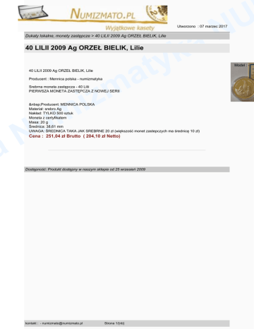 U N Utworzono : 07 marzec 2017 a k Dukaty lokalne, monety zastępcze > 40 LILII 2009 Ag ORZEŁ BIELIK, Lilie y t a 40 LILII 2009 Ag ORZEŁ BIELIK, Lilie 40 LILII 2009 Ag ORZEŁ BIELIK, Lilie m z i m u Producent : Mennica polska - numizmatyka Srebrna moneta zastępcza - 40 Lilii PIERWSZA MONETA ZASTĘPCZA Z NOWEJ SERII Producent: MENNICA POLSKA Materiał: srebro Ag Nakład: TYLKO 500 sztuk Moneta z certyfikatem Masa: 20 g Średnica: 38,61 mm UWAGA: ŚREDNICA TAKA JAK SREBRNE 20 zł (większość monet zastepczych ma średnicę 10 zł) N a Cena : 251,04 zł Brutto ( 204,10 zł Netto) Dostępność: Produkt dostępny w naszym sklepie od 25 wrzesień 2009 kontakt : - [email protected] Strona 1/{nb} Model : -