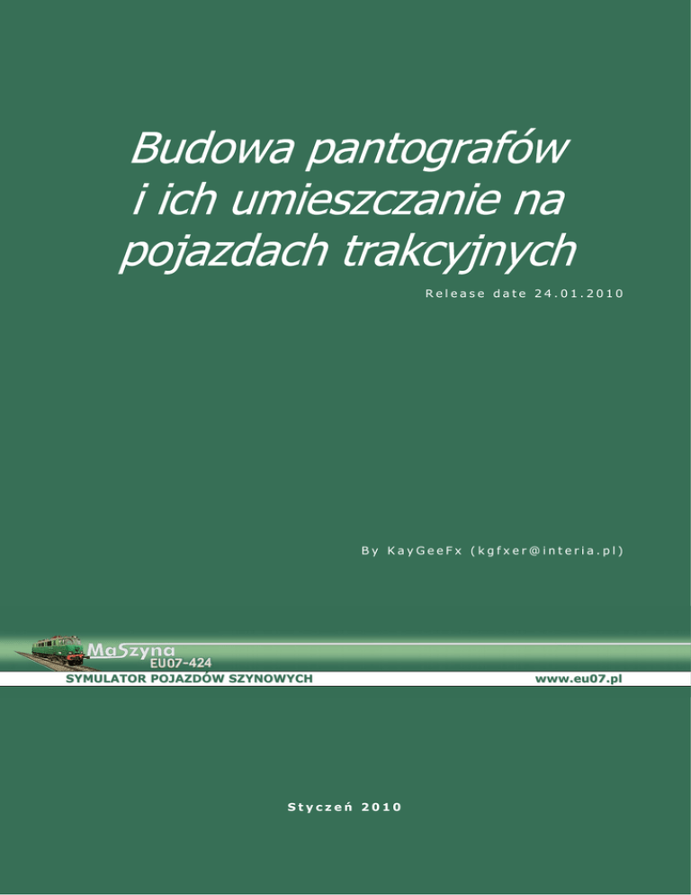 Release date 24.01.2010 By KayGeeFx ([email protected]) SYMULATOR POJAZDÓW SZYNOWYCH Styczeń 2010 www.eu07.pl SYMULATOR POJAZDÓW SZYNOWYCH www.eu07.pl Spis treści 1. 2. 3. 4. 5. 6. 7. 8. Budowa kinematyczna pantografu w symulatorze Pantograf EU07 303e.t3d/303e.mmd jako pantograf wzorcowy Umieszczanie pantografów na pojeździe Istotne zasady podczas budowy nowych pantografów Definiowanie pantografów w pliku .mmd poprzez „pantfactors” Parametry określające rozmieszczenie wzdłużne pantografów na pojeździe Parametr określający położenie ślizgu w stanie złożonym pantografu Parametr korygujący położenie ślizgu podczas pracy pantografu Budowa pantografów i ich umieszczanie na pojazdach trakcyjnych Strona 1 SYMULATOR POJAZDÓW SZYNOWYCH 1. www.eu07.pl Budowa kinematyczna pantografu w symulatorze Wzorzec pantografu w symulatorze został określony dla odbieraka nożycowego typu AKP. Do symulacji posłużyło pięć pivotów, które to tworzą siatkę kinematyczną pantografu naśladując połączenia pomiędzy poszczególnymi przegubami odbieraka. Ich rozmieszczenie jest ze sobą ściśle powiązane. Symulator odpowiednio transformuje położenie trzech pivotów (B, C i D) i obrót czterech z nich (A, B, D i E). Warto zauważyć, że ramiona dolne i górne obracają się o różne kąty. Poniżej rysunek przedstawia układ kinematyczny symulujący pantograf. Kółeczkami oznaczono pivoty. Pivoty ramion to punkty A, B, D i E, natomiast pivot ślizgu to punkt C. Rys 1. Schemat kinematyczny pantografu. 2. Pantograf EU07 303e.t3d/303e.mmd jako pantograf wzorcowy Fundamentalnym założeniem wyjściowym przy rozmieszczaniu pantografów na pojazdach trakcyjnych oraz tworzeniu nowych pantografów jest to, że wzorcowym pantografem (czyli pantografem dla którego skalibrowano kąty obrotu ramion górnych i dolnych, a co za tym idzie położenie ślizgu) jest odbierak zastosowany w modelu EU07 303e.t3d/303.mmd. Dalej będę ten odbierak nazywał pantografem wzorcowym. Poniżej przedstawiony jest schemat poglądowy z rozmieszczeniem pivotów dla pantografu z wspomnianego modelu. I tak dla tego pojazdu pivoty obrotu ramion dolnych umieszczone są na wysokości około 4,035 m (jest to tak jakby wysokość na jakiej znajduje się pantograf). Położenie pivotu ślizgu w stanie złożonym w osi Z wynosi około 4,25 m. Obie z wymienionych wartości mierzone są od z=0 wzdłuż osi pionowej pojazdu trakcyjnego. W modelu tym powierzchnia ślizgu niemalże pokrywa się z pivotem ślizgu (można przyjąć, że są na tej samej wysokości, ponieważ różnica w odległości ma wartość mniejszą niż 1 mm). Odpowiednie odległości pomiędzy pivotami pozwalają na poprawną pracę pantografu, czyli odpowiednie wychylenia jego ślizgu. Założenie odnośnie pantografu wzorcowego jest niezbędne do wyznaczenia parametrów dla pantfactors w pliku .mmd podczas umieszczania na pojeździe trakcyjnym tradycyjnego pantografu dostępnego w symulatorze lub przy tworzeniu i umieszczaniu nowego pantografu. Rys 2. Rozmieszczenie pivotów pantografu wzorcowego. Budowa pantografów i ich umieszczanie na pojazdach trakcyjnych Strona 2 SYMULATOR POJAZDÓW SZYNOWYCH 3. www.eu07.pl Umieszczanie pantografów na pojeździe Pantograf zastosowany w modelu 303e.t3d/303e.mmd unosi się odpowiednio w zależności od wysokości na jakiej znajduje się sieć trakcyjna nad nim, a konkretniej przewód jezdny. Pantograf ten można wykorzystać w innych pojazdach trakcyjnych, lecz należy pamiętać dla jakiego położenia został on zaprojektowany. Pamiętajmy, że oryginalnie przy wyznaczaniu parametrów kinematycznych znajdował się on na pojeździe EU07 na wysokości około 4,035 m (wysokość tą mierzymy od główki szyny do pivotów ramion dolnych). Przypuśćmy, że chcemy go zastosować w innej lokomotywie. Wysokość, na jakiej będziemy mogli go zamontować wyniesie 4,1 m. A więc ustawiamy w modelu .t3d pantograf na tej wysokości. Pantograf oczywiście będzie działał, lecz niestety błędnie. Jego ślizg zawsze będzie się unosił wyżej o pewną stałą wartość. Wartość tę możemy wyznaczyć odejmując wysokość zamontowania pantografu wzorcowego od wysokości zamontowania naszego pantografu. A więc w tym przypadku nasz pantograf będzie się unosił o 4,1 - 4,035 = 0,065 m wyżej niż powinien. Co teraz… można by zapytać. Jest na to rada. Trzeba skorygować zakres działania pantografu o odpowiednią wartość. Ta wartość to nasze wyliczone 0,065m. Korekcję tą przeprowadzamy ustawiając odpowiednio czwarty parametr pantfactors w pliku .mmd. Podobnie postępujemy w przypadkach, gdy umieszczany przez nas pantograf znajdzie się poniżej poziomu, na którym umieszczony jest pantograf wzorcowy. W takim przypadku parametr korekcyjny dla pantfactors przyjmie wartość ujemną (poprzednio była ona dodatnia). Dodatkowo w pliku .mmd musimy odpowiednio zwiększyć lub zmniejszyć trzeci parametr pantfactors. Zmiany tej dokonujemy oczywiście o naszą wyliczoną różnicę w położeniu pionowym pantografów. Dla zwiększenia wysokości zamontowania dodajemy wyliczoną wartość, a dla zmniejszenia odejmujemy. Poniżej przedstawiono jak zmiana położenia pantografu wpływa na położenie jego ślizgu (zakres pracy pantografu bez korekcji parametrów pantfactors w pliku .mmd). Dodatkowe informacje o korekcji położenia ślizgu w rozdziałach 7 i 8. Rys 3. Położenia ślizgu w zależności od wysokości umiejscowienia pantografu w modelu (bez korekcji). 4. Istotne zasady podczas budowy nowych pantografów Tutaj wymienione zostają spostrzeżenia ujmujące, co jest ważne przy tworzeniu nowego pantografu. Aby nowo tworzony odbierak działał poprawnie pod względem kinematycznym w symulatorze (tzn. nie oddalał się od przewodu jezdnego do góry lub w dół podczas jazdy przy zmianie wysokości na jakiej znajduje się przewód jezdny) musi być spełniony zasadniczy warunek. A mianowicie, powin