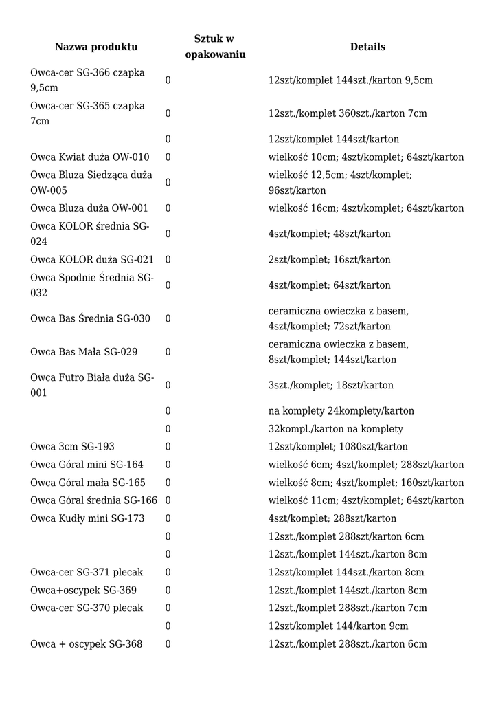Sztuk w Nazwa produktu Owca-cer SG-366 czapka 9,5cm Owca-cer SG-365 czapka 7cm Owca Kwiat duża OW-010 Owca Bluza Siedząca duża OW-005 Owca Bluza duża OW-001 Owca KOLOR średnia SG024 Owca KOLOR duża SG-021 Owca Spodnie Średnia SG032 0 12szt/komplet 144szt./karton 9,5cm 0 12szt./komplet 360szt./karton 7cm 0 12szt/komplet 144szt/karton 0 wielkość 10cm; 4szt/komplet; 64szt/karton 0 wielkość 12,5cm; 4szt/komplet; 96szt/karton 0 wielkość 16cm; 4szt/komplet; 64szt/karton 0 4szt/komplet; 48szt/karton 0 2szt/komplet; 16szt/karton 0 4szt/komplet; 64szt/karton Owca Bas Średnia SG-030 0 Owca Bas Mała SG-029 0 Owca Futro Biała duża SG- Details opakowaniu ceramiczna owieczka z basem, 4szt/komplet; 72szt/karton ceramiczna owieczka z basem, 8szt/komplet; 144szt/karton 0 3szt./komplet; 18szt/karton 0 na komplety 24komplety/karton 0 32kompl./karton na komplety Owca 3cm SG-193 0 12szt/komplet; 1080szt/karton Owca Góral mini SG-164 0 wielkość 6cm; 4szt/komplet; 288szt/karton Owca Góral mała SG-165 0 wielkość 8cm; 4szt/komplet; 160szt/karton Owca Góral średnia SG-166 0 wielkość 11cm; 4szt/komplet; 64szt/karton Owca Kudły mini SG-173 0 4szt/komplet; 288szt/karton 0 12szt./komplet 288szt/karton 6cm 0 12szt./komplet 144szt./karton 8cm Owca-cer SG-371 plecak 0 12szt/komplet 144szt./karton 8cm Owca+oscypek SG-369 0 12szt./komplet 144szt./karton 8cm Owca-cer SG-370 plecak 0 12szt./komplet 288szt./karton 7cm 0 12szt/komplet 144/karton 9cm 0 12szt./komplet 288szt./karton 6cm 001 Owca + oscypek SG-368 Sztuk w Nazwa produktu Bell 0 Ceramiczny dzwonek Owca 4 szt./komplet 72 szt./karton 0 24kompl./karton na komplety 0 192szt/karton 12szt/komplet 0 144szt/karton 12szt/komplet 0 24szt./komplet 288/karton wys.4 cm 0 2szt./komplet 36szt./karton wys.11 cm 0 na sztuki 12szt./karton wys.14 cm 0 na sztuki 36szt./karton wys.13cm 0 na komplety 24komplety/karton 0 Owca SG-259 Mała Czarna Details opakowaniu na komplety 18kompletów/karton wys.4 cm 0 4szt./komplet 120szt./karton wys.7cm 0 4szt./komplet 48szt./karton wys.11cm 0 3szt./komplet 18szt./karton 15cm 0 8szt./komplet 512szt./karton 4cm 0 64szt/karton 4szt/komplet 0 48szt/karton 2szt/komplet 0 96szt/karton 8szt/komplet 0 24kompl./karton na komplety 0 24kompl./karton na komplety 0 24kompl./karton na komplety 0 24kompl./karton na komplety 0 16kompl./karton na komplety 0 9kompl./karton na komplety 0 4 szt./ komplet, 64 szt./ karton Owca SG-377 Serce 9cm 0 12szt./komplet 144szt./karton 9cm Owca SG-378 Serce 6cm 0 12szt./komplet 288szt./karton 6cm Owca SG-385 Kreda 0 12szt./komplet 96szt./karton 0 12szt./komplet 144szt./karton Owca SG-254 Mini Biała Owca Zagroda Kolor 4 cm SG-305 Owca Płotek Cz/B 6,5 cm SG-297 Owca SG-375 duza+mała 9cm Sztuk w Nazwa produktu Owca SG-376 duza+mała opakowaniu Details 0 12szt./komplet 288szt./karton 6cm Owca SG-379 Patyk 7,5cm 0 6szt./komplet 144szt./karton Owca SG-380 +Baran 0 6szt./komplet 144szt./karton 0 4szt./komplet 48szt./karton 0 4szt./komplet 48szt./karton 0 96szt/kart 8szt/komplet 0 12szt./komplet 288szt./karton 20 1 kg/opak. 20 kg/karton 12 2 kg/opakowanie, 24 kg/karton 6cm Owca SG-405 Dzwięk Kapelusz Owca SG-406 Dzwięk Owca-Poli MAL-B362 na Trawie Owca MAL-C406 Futerko 5cm Seashell Murex Turifactus waga Seashell Voluta Nobiles waga