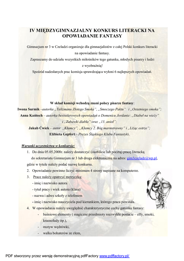 IV MIĘDZYGIMNAZJALNY KONKURS LITERACKI NA OPOWIADANIE FANTASY Gimnazjum nr 3 w Czeladzi organizuje dla gimnazjalistów z całej Polski konkurs literacki na opowiadanie fantasy. Zapraszamy do udziału wszystkich miłośników tego gatunku, młodych pisarzy i ludzi z wyobraźnią! Spośród nadesłanych prac komisja sprawdzająca wyłoni 6 najlepszych opowiadań. W skład komisji wchodzą znani polscy pisarze fantasy: Iwona Surmik –autorka „Talizmanu Złotego Smoka”, „Smoczego Paktu” i „Ostatniego smoka”; Anna Kańtoch – autorka bestselerowych opowiadań o Domenicu Jordanie: „Diabeł na wieży” i „Zabawki diabła” oraz „13. anioł”; Jakub Ćwiek – autor „Kłamcy”, „Kłamcy 2. Bóg marnotrawny” i „Liżąc ostrze”; Elżbieta Gepfert – Prezes Śląskiego Klubu Fantastyki. Warunki uczestnictwa w konkursie: 1. Do dnia 05.05.2008r. należy dostarczyć (osobiście lub pocztą) pracę literacką do sekretariatu Gimnazjum nr 3 lub droga elektroniczną na adres: [email protected], gdzie w tytule należy podać nazwę konkursu. 2. Opowiadanie powinno liczyć minimum 4 strony napisane na komputerze. 3. Prace należy opatrzyć metryczką: - imię i nazwisko autora - tytuł pracy i wiek autora (klasa) - nazwa i adres szkoły z telefonem - imię i nazwisko nauczyciela pod kierunkiem, którego praca powstała. 4. W opowiadaniu należy uwzględnić charakterystyczne cechy gatunku fantasy: - baśniowe elementy ( magiczne przedmioty niezwykłe postacie – elfy, smoki, krasnoludy itp.), - motyw wędrówki, - walka bohaterów ze złem, PDF stworzony przez wersję demonstracyjną pdfFactory www.pdffactory.pl/ - posługiwanie się magią, - wyraźne rozgraniczenie na dobre i złe rasy, gatunki istot. 5. Pod uwagę będą brane prace autorów, którzy wykażą się oryginalnością, wrażliwością i świeżością pomysłów. 6. Wyniki ogłoszone zostaną w maju 2008 roku. O dokładnym terminie finału szkoły zostaną powiadomione telefonicznie. 7. Głównym sponsorem nagród jest Urząd Miasta Czeladź i Rada Rodziców Gimnazjum nr 3 w Czeladzi. Serdecznie zapraszamy młodzież do udziału w konkursie. Organizator konkursu: Gimnazjum nr 3, ul. Lwowska 2 41 - 253 Czeladź tel. 269 – 66 – 95 komisarz konkursu : mgr Dorota Strączek Konkurs pod patronatem Śląskiego Klubu Fantastyki w Katowicach Urzędu Miasta Czeladź PDF stworzony przez wersję demonstracyjną pdfFactory www.pdffactory.pl/