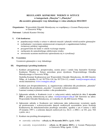REGULAMIN KONKURSU WIEDZY O SZTUCE w kategoriach „Muzyka” i „Plastyka” dla uczniów gimnazjów woj. lubuskiego w roku szkolnym 2014/2015 Organizator: Wojewódzki Ośrodek Metodyczny we współpracy z Liceum Plastycznym w Gorzowie Wlkp. Patronat: Lubuski Kurator Oświaty I. Cele konkursu: popularyzacja wiedzy o sztuce w zakresie muzyki i plastyki wśród uczniów gimnazjów rozbudzanie i rozwijanie zainteresowań związanych z zagadnieniami kultury światowej, polskiej, regionalnej przygotowanie do nauki w szkole wyższego stopnia zachęcanie do samodzielnego zdobywania wiedzy stworzenie uczniom możliwości sprawdzenia się w rywalizacji II. Uczestnicy Uczniowie gimnazjów z woj. lubuskiego III. Organizacja i przebieg konkursu 1. Konkurs przygotowuje, przeprowadza, ocenia prace i ustala listę laureatów Komisja Konkursu Wiedzy o Sztuce powołana przez dyrektora Wojewódzkiego Ośrodka Metodycznego w Gorzowie Wlkp. Siedzibą Komisji Konkursowej jest Wojewódzki Ośrodek Metodyczny, 66-400 Gorzów Wlkp., ul. Łokietka 23, tel. 95/7216-110, fax 95/7216-112, e-mail: [email protected], strona internetowa: www.womgorz.edu.pl. 2. Konkurs jest dwuprzedmiotowy, tj. organizowany oddzielnie dla przedmiotu „plastyka” i oddzielnie dla przedmiotu „muzyka”. Uczestnik wybiera przedmiot. Laureaci zostaną wyłonieni osobno z obu przedmiotów. 3. Zgłoszenie udziału w Konkursie (wzór w załączeniu) należy nadsyłać do dnia 2 stycznia 2015 r. pocztą elektroniczną na adres: [email protected] lub listownie na adres: Wojewódzki Ośrodek Metodyczny, ul. Łokietka 23, 66-400 Gorzów Wlkp. 4. Zgłoszenie udziału w Konkursie jest traktowane jako jednoczesne wyrażenie zgody na przetwarzanie i wykorzystywanie danych osobowych uczestników przez Komisję Konkursową do dokumentowania przebiegu zawodów, zgodnie z art. 6 ustawy z dnia 29 sierpnia 1997 r. o ochronie danych osobowych (t.j. Dz.U. z 2002 r. nr 101, poz. 926 z późn. zm.). 5. Konkurs ma przebieg dwustopniowy: z a w o d y s z k o l n e – odbędą się 30 stycznia 2015 r. (godz. 8.00) z a w o d y w o j e w ó d z k i e – odbędą się 28 marca 2015 r. w Liceum Plastycznym w Gorzowie Wlkp. (godz. 12.00). 6. Zawody szkolne Zawody szkolne przeprowadza Szkolna Komisja Konkursowa powołana przez dyrektora szkoły. Zawody polegają na wykonaniu testu, na co przeznacza się 45 minut. Wykonane przez uczniów testy wraz z protokołem zawodów (wzór w załączeniu) szkoła przesyła do Wojewódzkiego Ośrodka Metodycznego w terminie 7 dni od daty przeprowadzenia zawodów szkolnych. Aby zakwalifikować się do finału wojewódzkiego, uczeń musi uzyskać 75% punktów możliwych do zdobycia. Lista uczniów zakwalifikowanych do zawodów wojewódzkich zostanie opublikowana na stronie internetowej Wojewódzkiego Ośrodka Metodycznego w terminie 14 dni od dnia zawodów szkolnych. 7. Zawody wojewódzkie Składają się z dwóch części: teoretycznej i praktycznej 1) 2) część teoretyczna: test z wiedzy (60 minut) część praktyczna: z muzyki – rozpoznawanie utworów muzycznych, podanie autora i tytułu dzieła (45 minut), z plastyki – rozpoznawanie dzieł plastycznych, podanie autora, tytułu, określenie czasu, miejsca (45 minut). 8. Ogłoszenie wyników Konkursu następuje w ciągu dziesięciu dni od dnia przeprowadzenia zawodów finałowych na stronie internetowej Wojewódzkiego Ośrodka Metodycznego oraz Kuratorium Oświaty w Gorzowie Wielkopolskim. Ogłoszone wyniki są ostateczne. 9. Laureatom i finalistom Konkursu Lubuski Kurator Oświaty przyznaje punkty uwzględniane w procedurze rekrutacji do szkół ponadgimnazjalnych: 7 punktów – laureatom, 4 punkty – finalistom. Zaświadczenia o uzyskaniu tytułu laureata lub finalisty wydaje Kuratorium Oświaty w Gorzowie Wlkp. ZAGADNIENIA Z PLASTYKI 1. Pojęcia i terminy plastyczne. 2. Zagadnienia z dziejów sztuki: sztuka prehistoryczna, starożytna, średniowieczna, nowożytna, nowoczesna – zjawiska w sztuce XX i XXI wieku. 3. Wielcy artyści, ich życie i twórczość. 4. Analiza dzieła sztuki. 5. Rozpoznawanie i nazywanie wybitnych dzieł sztuki. Literatura: podręczniki do plastyki dla szkoły podstawowej i gimnazjum ZAGADNIENIA Z MUZYKI 1. 2. 3. 4. 5. 6. 7. Pojęcia i terminy muzyczne. Zasady notacji muzycznej. Zagadnienia z historii muzyki i od hipotez na temat powstawania muzyki do współczesności. Nowe gatunki muzyki. Wielcy kompozytorzy – życie i twórczość. Polska muzyka ludowa, zwyczaje, obrzędy. Rozpoznawanie i nazywanie słyszanych dzieł muzycznych. Literatura: podręczniki do muzyki dla szkoły podstawowej i gimnazjum Informacji szczegółowych udziela Danuta Przybysz; tel. kom. 696-044-260;