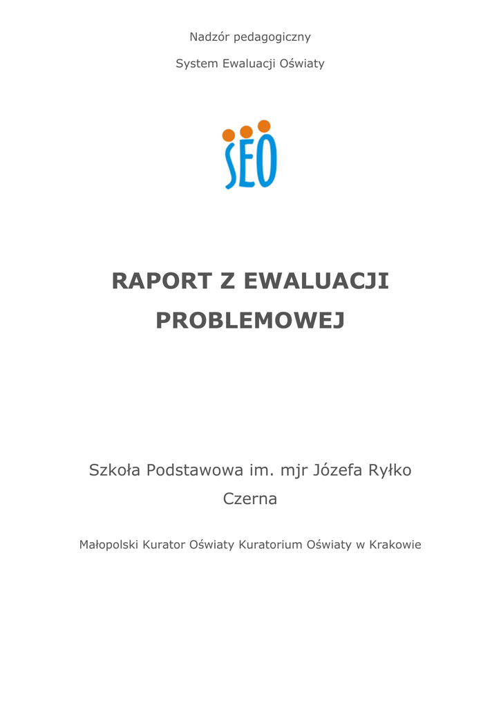 Nadzór pedagogiczny System Ewaluacji Oświaty RAPORT Z EWALUACJI PROBLEMOWEJ Szkoła Podstawowa im. mjr Józefa Ryłko Czerna Małopolski Kurator Oświaty Kuratorium Oświaty w Krakowie Wstęp Prezentowany raport jest rezultatem ewaluacji zewnętrznej przeprowadzonej w szkole przez wizytatorów do spraw ewaluacji. Raport z ewaluacji problemowej dotyczy jednego lub kilku z przedstawionych poniżej wymagań państwa. Ewaluacja zewnętrzna polega na zbieraniu i analizowaniu informacji na temat funkcjonowania szkoły w obszarach wyznaczonych przez wymagania państwa: 1. Szkoła lub placówka realizuje koncepcję pracy ukierunkowaną na rozwój uczniów. 2. Procesy edukacyjne są zorganizowane w sposób sprzyjający uczeniu się. 3. Uczniowie nabywają wiadomości i umiejętności określone w podstawie programowej. 4. Uczniowie są aktywni. 5. Respektowane są normy społeczne. 6. Szkoła lub placówka wspomaga rozwój uczniów, z uwzględnieniem ich indywidualnej sytuacji. 7. Nauczyciele współpracują w planowaniu i realizowaniu procesów edukacyjnych. 8. Promowana jest wartość edukacji. 9. Rodzice są partnerami szkoły lub placówki. 10. Wykorzystywane są zasoby szkoły lub placówki oraz środowiska lokalnego na rzecz wzajemnego rozwoju. 11. Szkoła lub placówka, organizując procesy edukacyjne, uwzględnia wnioski z analizy wyników sprawdzianu, egzaminu gimnazjalnego, egzaminu maturalnego, egzaminu potwierdzającego kwalifikacje zawodowe i egzaminu potwierdzającego kwalifikacje w zawodzie oraz innych badań zewnętrznych i wewnętrznych. 12. Zarządzanie szkołą lub placówką służy jej rozwojowi. Ewaluacja ma także na celu ustalenie poziomu spełniania przez szkołę wymagań zawartych w załączniku do Rozporządzenia Ministra Edukacji Narodowej w sprawie nadzoru pedagogicznego z dnia 7 października 2009 r. wraz z nowelizacją z dnia 10.05.2013r.Szkoła może spełniać te wymagania na pięciu poziomach: ● Poziom E - oznaczający niski stopień wypełniania wymagania przez szkołę. ● Poziom D - oznaczający podstawowy stopień wypełniania wymagania przez szkołę. ● Poziom C - oznaczający średni stopień wypełniania wymagania przez szkołę. ● Poziom B - oznaczający wysoki stopień wypełniania wymagania przez szkołę. ● Poziom A - oznaczający bardzo wysoki stopień wypełniania wymagania przez szkołę. 2/20 Opis metodologii Badanie zostało zrealizowane w dniach 17-09-2013 - 30-09-2013 przez zespół wizytatorów ds. ewaluacji, w skład którego weszli: Jolanta Knapik, Ewa Kowar-Pogoń. Badaniem objęto 27 uczniów (ankieta i wywiad grupowy), 21 rodziców - ankieta i 7- wywiad grupowy i 11 nauczycieli (ankieta i wywiad grupowy). Przeprowadzono wywiad indywidualny z dyrektorem szkoły, grupowy z przedstawicielami samorządu lokalnego i partnerów szkoły, grupowy z pracownikami niepedagogicznymi, a także obserwacje lekcji i analizę dokumentacji. Na podstawie zebranych danych został sporządzony raport, który obejmuje podstawowe obszary działania szkoły. 3/20 Obraz placówki Szkoła Podstawowa im. mjr. Józefa Ryłko w Czernej to jedna ze szkół, dla której organem prowadzącym jest Gmina Krzeszowice. Mieści się w dwóch odrębnych budynkach. W jednym odbywają się zajęcia dla uczniów klas I-III oraz zajęcia komputerowe, w drugim zajęcia dla uczniów klas IV - VI. Baza lokalowa i dydaktyczna jaką dysponuje szkoła zapewnia uczniom warunki do nauki, a nauczycielom warunki do pracy. Szkoła współpracuje z wieloma instytucjami i organizacjami, między innymi: Stowarzyszenie Inicjatyw Społecznych Wsi Czerna, Ochotniczą Strażą Pożarną, Urzędem Miasta Krzeszowice, Klasztorem Karmelitów Bosych w Czernej oraz Poradnią Psychologiczno-Pedagogiczną w Krzeszowicach, które wspierają ją w realizacji jej zadań. Nauczyciele pracują zespołowo, wspólnie analizują wyniki sprawdzianu, prowadzą ewaluację wewnętrzną, planują pracę dydaktyczno-wychowawczą. Nie zawsze jednak sformułowane, w wyniku prowadzonych analiz, wnioski przekładają się na konkretne działania, które poddawane są monitoringowi. Uczniowie szkoły mają tworzone warunki dla rozwoju. Nauczyciele organizują koła zainteresowań, np.: koło popularno-naukowe, językowe, artystyczne, sportowe. Nie wszystkie jednak spełniają oczekiwania uczniów. W roku szkolnym 2012/2013 szkoła przystąpiła do projektu "Rozwiń skrzydła" - wyrównywanie szans edukacyjnych oraz rozwijanie pasji szansą na lepszą przyszłość. W ramach tego projektu, uczniowie klas I-III mogą uczestniczyć w zajęciach rozwijających ich uzdolnienia matematyczno-przyrodnicze oraz w zajęciach logopedycznych i wspomagających w zakresie czytania i pisania. 4/20 Informacja o placówce Nazwa placówki Patron Szkoła Podstawowa im. mjr Józefa Ryłko mjr Józef Ryłko Typ placówki Szkoła podstawowa Miejscowość Czerna Ulica Numer 274 Kod pocztowy 32-065 Urząd pocztowy Krzeszowice Telefon 0122821469 Fax 0122821469 Www www.sp.czerna.w.interia.pl Regon 35132824300000 Publiczność publiczna Kategoria uczniów Dzieci lub młodzież Charakter brak specyfiki Uczniowie, wychow., słuchacze 72 Oddziały 7 Nauczyciele pełnozatrudnieni 7 Nauczyciele niepełnozat. (stos.pracy) 12 Nauczyciele niepełnozat._(w etatach) 4 Średnia liczba uczących się w oddziale 10.29 Liczba uczniów przypadających na jednego pełnozatrudnionego nauczyciela 10.29 Województwo MAŁOPOLSKIE Powiat krakowski Gmina Krzeszowice Typ gminy gmina miejsko-wiejska 5/20 Poziom spełniania wymagań państwa Szkoła lub placówka wspomaga rozwój uczniów uwzględniając ich indywidualną sytuację C W szkole lub placówce rozpoznaje się możliwości psychofizyczne i potrzeby rozwojowe, sposoby uczenia się oraz sytuację społeczną każdego ucznia (D) Zajęcia rozwijające zainteresowania i uzdolnienia, zajęcia dydaktyczno-wyrównawcze i specjalistyczne organizowane dla uczniów wymagających szczególnego wsparcia w rozwoju 