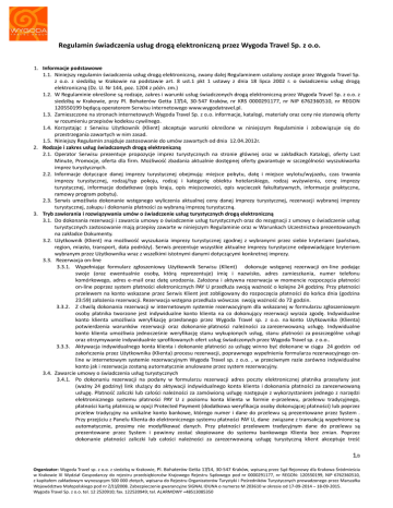 Regulamin świadczenia usług drogą elektroniczną przez Wygoda Travel Sp. z o.o. 1. Informacje podstawowe 1.1. Niniejszy regulamin świadczenia usług drogą elektroniczną, zwany dalej Regulaminem ustalony zostaje przez Wygoda Travel Sp. z o.o. z siedzibą w Krakowie na podstawie art. 8 ust.1 pkt 1 ustawy z dnia 18 lipca 2002 r. o świadczeniu usług drogą elektroniczną (Dz. U. Nr 144, poz. 1204 z późn. zm.) 1.2. W Regulaminie określone są rodzaje, zakres i warunki usług świadczonych drogą elektroniczną przez Wygoda Travel Sp. z o.o. z siedzibą w Krakowie, przy Pl. Bohaterów Getta 17/14, 30-547 Kraków, nr KRS 0000291177, nr NIP 6762360510, nr REGON 120550199 będącą operatorem Serwisu internetowego www.wygodatravel.pl. 1.3. Zamieszczone na stronach internetowych Wygoda Travel Sp. z o.o. informacje, katalogi, materiały oraz ceny nie stanowią oferty w rozumieniu przepisów kodeksu cywilnego. 1.4. Korzystając z Serwisu Użytkownik (Klient) akceptuje warunki określone w niniejszym Regulaminie i zobowiązuje się do przestrzegania zawartych w nim zasad. 1.5. Niniejszy Regulamin znajduje zastosowanie do umów zawartych od dnia 12.04.2012r. 2. Rodzaje i zakres usług świadczonych drogą elektroniczną 2.1. Operator Serwisu prezentuje propozycje imprez turystycznych na stronie głównej oraz w zakładkach Katalogi, oferty Last Minute, Promocje, oferta dla firm. Możliwość zbadania aktualnie dostępnej oferty gwarantuje w szczególności wyszukiwarka imprez turystycznych. 2.2. Informacje dotyczące danej imprezy turystycznej obejmują: miejsce pobytu, datę i miejsce wylotu/wyjazdu, czas trwania imprezy turystycznej, rodzaj/typ pokoju, rodzaj i kategorię obiektu hotelarskiego, rodzaj wyżywienia, cenę imprezy turystycznej, informacje dodatkowe (opis kraju, opis miejscowości, opis wycieczek fakultatywnych, informacje praktyczne, ramowy program pobytu). 2.3. Serwis umożliwia dokonanie wstępnego wyliczenia aktualnej ceny danej imprezy turystycznej, rezerwacji wybranej imprezy turystycznej, zakupu i dokonania płatności za wybraną imprezę turystyczną. 3. Tryb zawierania i rozwiązywania umów o świadczenie usług turystycznych drogą elektroniczną 3.1. Do dokonania rezerwacji i zawarcia umowy o świadczenie usług turystycznych oraz do rezygnacji z umowy o świadczenie usług turystycznych zastosowanie mają przepisy zawarte w niniejszym Regulaminie oraz w Warunkach Uczestnictwa prezentowanych na zakładce Dokumenty. 3.2. Użytkownik (Klient) ma możliwość wyszukania imprezy turystycznej zgodnej z wybranymi przez siebie kryteriami (państwo, region, miasto, transport, data podróży). Serwis prezentuje wszystkie aktualne imprezy turystyczne odpowiadające kryteriom wybranym przez Użytkownika wraz z wszelkimi istotnymi danymi dotyczącymi konkretnej imprezy. 3.3. Rezerwacja on-line 3.3.1. Wypełniając formularz zgłoszeniowy Użytkownik Serwisu (Klient) dokonuje wstępnej rezerwacji on-line podając swoje (oraz ewentualnie osoby, którą reprezentuje) imię i nazwisko, adres zamieszkania, numer telefonu komórkowego, adres e-mail oraz datę urodzenia. Założona i aktywna rezerwacja w momencie rozpoczęcia płatności on-line poprzez system płatności elektronicznych PAY U przedłuża swoją ważność o kolejne 24 godziny. Przy płatności przelewem na konto wskazane przez Serwis Klient jest zobligowany do rozpoczęcia płatności do końca dnia (godzina 23:59) założenia rezerwacji. Rezerwacja wstępna przedłuża wówczas swoją ważność do 72 godzin. 3.3.2. Z chwilą dokonania rezerwacji w internetowym systemie rezerwacyjnym dla wskazanej w formularzu zgłoszeniowym osoby płatnika tworzone jest indywidualne konto klienta na co dokonujący rezerwacji wyraża zgodę. Indywidualne konto klienta umożliwia weryfikację przesłanego przez Wygoda Travel sp. z o.o. na konto Użytkownika (Klienta) potwierdzenia warunków rezerwacji oraz dokonanie płatności należności za zarezerwowaną usługę. Indywidualne konto klienta umożliwia jednocześnie weryfikację stanu wykupionych usług, stanu płatności za poszczególne usługi oraz otrzymywanie indywidualnie sprofilowanych ofert usług świadczonych przez Wygoda Travel sp. z o.o.. 3.3.3. Aktywacja indywidualnego konta klienta i dokonanie płatności za usługę winno być dokonane w ciągu 24 godzin od zakończenia przez Użytkownika (Klienta) procesu rezerwacji, poprawnego wypełnienia formularza rezerwacyjnego online w internetowym systemie rezerwacyjnym Wygoda Travel sp. z o.o. , w przeciwnym razie zarówno indywidualne konto jak i rezerwacja zostaną automatycznie anulowane przez system rezerwacyjny. 3.4. Zawarcie umowy o świadczenia usług turystycznych 3.4.1. Po dokonaniu rezerwacji na podany w formularzu rezerwacji adres poczty elektronicznej płatnika przesyłany jest (ważny 24 godziny) link służący do aktywacji indywidualnego konta klienta i dokonania płatności za zarezerwowaną usługę. Płatność zaliczki lub całości należności za zamówioną usługę następuje z wykorzystaniem jednego z narzędzi elektronicznego systemu płatności PAY U z poziomu konta klienta w formie e-przelewu, przelewu tradycyjnego, płatności kartą płatniczą w opcji Protected Payment (dodatkowa weryfikacja osoby dokonującej płatności) lub poprzez przelew tradycyjny na unikalne konto bankowe, którego numer i dane do przelewu są prezentowane przez System . Przy przejściu z Panelu Klienta do elektronicznego systemu płatności PAY U, dane związane z transakcją wypełnione są automatycznie, prosimy nie modyfikować danych. Przy płatności przelewem tradycyjnym dane do przelewu są prezentowane przez System i powinny zostać skopiowane do systemu bankowego Klienta bez zmian. Poprzez dokonanie płatności zaliczki lub całości należności za zarezerwowaną usługę turystyczną klient akceptuje treść 1/3 Organizator: Wygoda Travel sp. z o.o. z siedzibą w Krakowie, Pl. Bohaterów Getta 17/14, 30-54
