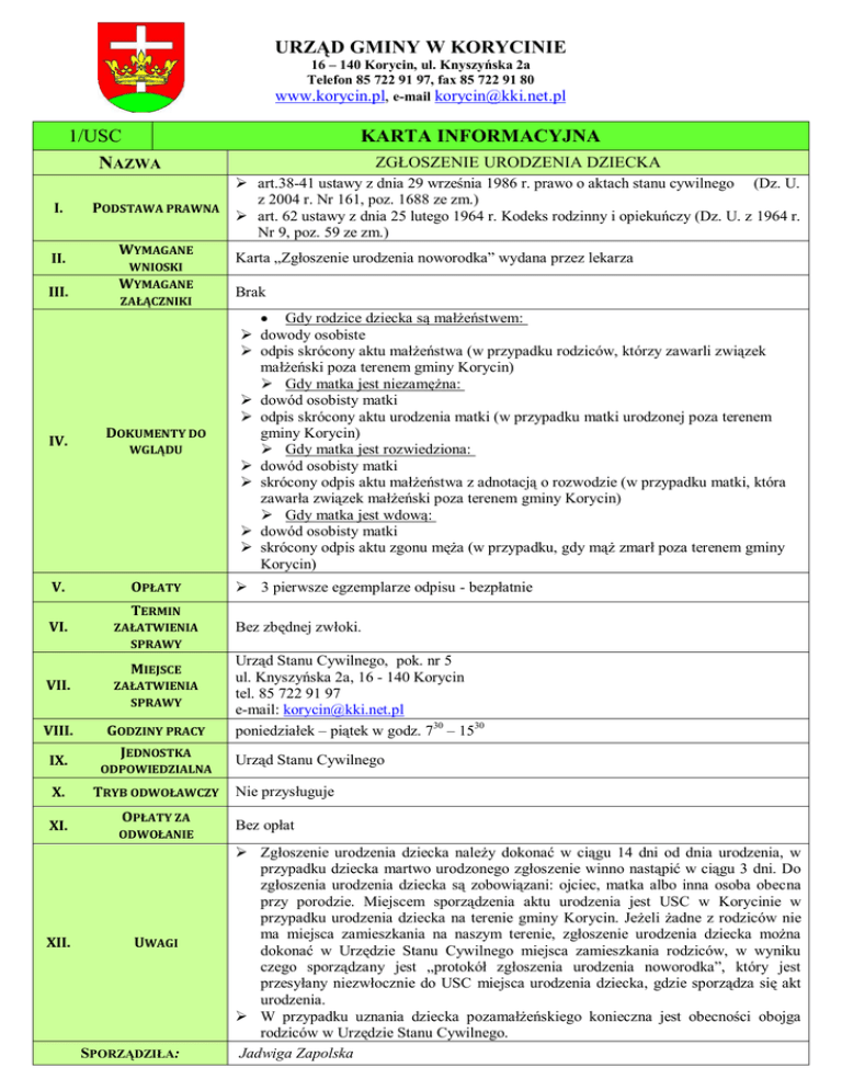 URZĄD GMINY W KORYCINIE 16 – 140 Korycin, ul. Knyszyńska 2a Telefon 85 722 91 97, fax 85 722 91 80 www.korycin.pl, e-mail [email protected] 1/USC KARTA INFORMACYJNA ZGŁOSZENIE URODZENIA DZIECKA NAZWA I. II. III. IV. V. VI. PODSTAWA PRAWNA WYMAGANE WNIOSKI WYMAGANE ZAŁĄCZNIKI DOKUMENTY DO WGLĄDU OPŁATY ZAŁATWIENIA SPRAWY MIEJSCE ZAŁATWIENIA SPRAWY VIII. GODZINY PRACY JEDNOSTKA ODPOWIEDZIALNA X. TRYB ODWOŁAWCZY XI. OPŁATY ZA ODWOŁANIE XII. Karta „Zgłoszenie urodzenia noworodka” wydana przez lekarza Brak Gdy rodzice dziecka są małżeństwem: dowody osobiste odpis skrócony aktu małżeństwa (w przypadku rodziców, którzy zawarli związek małżeński poza terenem gminy Korycin) Gdy matka jest niezamężna: dowód osobisty matki odpis skrócony aktu urodzenia matki (w przypadku matki urodzonej poza terenem gminy Korycin) Gdy matka jest rozwiedziona: dowód osobisty matki skrócony odpis aktu małżeństwa z adnotacją o rozwodzie (w przypadku matki, która zawarła związek małżeński poza terenem gminy Korycin) Gdy matka jest wdową: dowód osobisty matki skrócony odpis aktu zgonu męża (w przypadku, gdy mąż zmarł poza terenem gminy Korycin) 3 pierwsze egzemplarze odpisu - bezpłatnie TERMIN VII. IX. art.38-41 ustawy z dnia 29 września 1986 r. prawo o aktach stanu cywilnego (Dz. U. z 2004 r. Nr 161, poz. 1688 ze zm.) art. 62 ustawy z dnia 25 lutego 1964 r. Kodeks rodzinny i opiekuńczy (Dz. U. z 1964 r. Nr 9, poz. 59 ze zm.) UWAGI SPORZĄDZIŁA: Bez zbędnej zwłoki. Urząd Stanu Cywilnego, pok. nr 5 ul. Knyszyńska 2a, 16 - 140 Korycin tel. 85 722 91 97 e-mail: [email protected] poniedziałek – piątek w godz. 730 – 1530 Urząd Stanu Cywilnego Nie przysługuje Bez opłat Zgłoszenie urodzenia dziecka należy dokonać w ciągu 14 dni od dnia urodzenia, w przypadku dziecka martwo urodzonego zgłoszenie winno nastąpić w ciągu 3 dni. Do zgłoszenia urodzenia dziecka są zobowiązani: ojciec, matka albo inna osoba obecna przy porodzie. Miejscem sporządzenia aktu urodzenia jest USC w Korycinie w przypadku urodzenia dziecka na terenie gminy Korycin. Jeżeli żadne z rodziców nie ma miejsca zamieszkania na naszym terenie, zgłoszenie urodzenia dziecka można dokonać w Urzędzie Stanu Cywilnego miejsca zamieszkania rodziców, w wyniku czego sporządzany jest „protokół zgłoszenia urodzenia noworodka”, który jest przesyłany niezwłocznie do USC miejsca urodzenia dziecka, gdzie sporządza się akt urodzenia. W przypadku uznania dziecka pozamałżeńskiego konieczna jest obecności obojga rodziców w Urzędzie Stanu Cywilnego. Jadwiga Zapolska