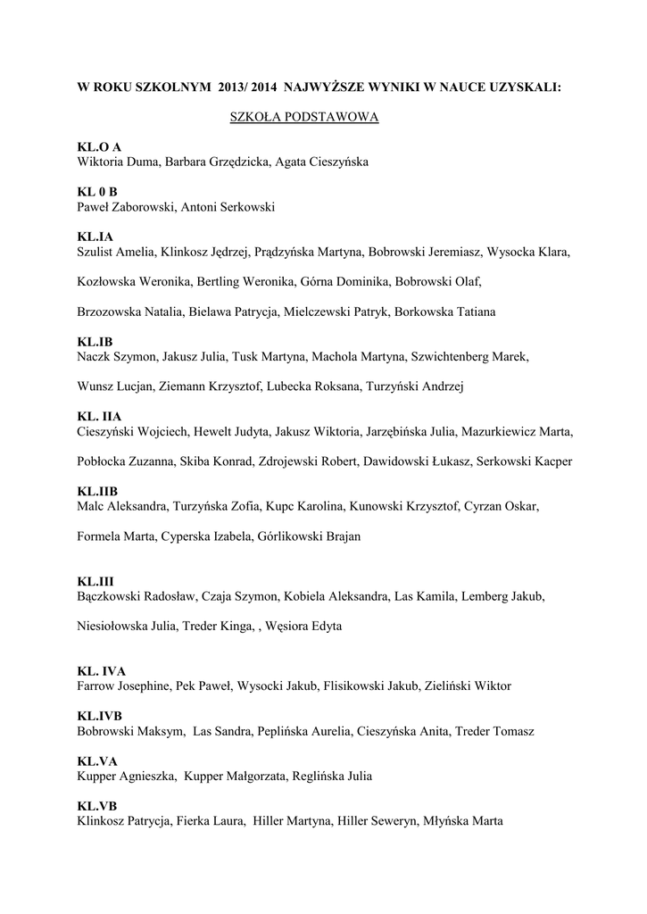 W ROKU SZKOLNYM 2013/ 2014 NAJWYŻSZE WYNIKI W NAUCE UZYSKALI: SZKOŁA PODSTAWOWA KL.O A Wiktoria Duma, Barbara Grzędzicka, Agata Cieszyńska KL 0 B Paweł Zaborowski, Antoni Serkowski KL.IA Szulist Amelia, Klinkosz Jędrzej, Prądzyńska Martyna, Bobrowski Jeremiasz, Wysocka Klara, Kozłowska Weronika, Bertling Weronika, Górna Dominika, Bobrowski Olaf, Brzozowska Natalia, Bielawa Patrycja, Mielczewski Patryk, Borkowska Tatiana KL.IB Naczk Szymon, Jakusz Julia, Tusk Martyna, Machola Martyna, Szwichtenberg Marek, Wunsz Lucjan, Ziemann Krzysztof, Lubecka Roksana, Turzyński Andrzej KL. IIA Cieszyński Wojciech, Hewelt Judyta, Jakusz Wiktoria, Jarzębińska Julia, Mazurkiewicz Marta, Pobłocka Zuzanna, Skiba Konrad, Zdrojewski Robert, Dawidowski Łukasz, Serkowski Kacper KL.IIB Malc Aleksandra, Turzyńska Zofia, Kupc Karolina, Kunowski Krzysztof, Cyrzan Oskar, Formela Marta, Cyperska Izabela, Górlikowski Brajan KL.III Bączkowski Radosław, Czaja Szymon, Kobiela Aleksandra, Las Kamila, Lemberg Jakub, Niesiołowska Julia, Treder Kinga, , Węsiora Edyta KL. IVA Farrow Josephine, Pek Paweł, Wysocki Jakub, Flisikowski Jakub, Zieliński Wiktor KL.IVB Bobrowski Maksym, Las Sandra, Peplińska Aurelia, Cieszyńska Anita, Treder Tomasz KL.VA Kupper Agnieszka, Kupper Małgorzata, Reglińska Julia KL.VB Klinkosz Patrycja, Fierka Laura, Hiller Martyna, Hiller Seweryn, Młyńska Marta KL.VIA Kruszyńska Paulina, Farrow Victoria, Wierzba Karolina, Ziemann Anastazja, Szwaba Aleksandra, Piszka Jakub, Cyrzan Filip KL. VIB Miąskowska Agnieszka, Ramczykowska Paulina, Kurszewska Marta, Hopa Marta, Hirsz Agnieszka, Lindstedt Barbara, Sikorska Dominika, Ropel Klaudia, Dawidowski Andrzej GIMNAZJUM KL.I Bączkowska Wiktoria, Szlas Agnieszka KL.IIA Bida Agata, Sikorska Zuzanna, Hiller Daniel KL.IIB Hewelt Zuzanna, Wysocki Wojciech, Lindstedt Małgorzata, Hopa Adrian KL.IIIA Piszka Zofia, Nastały Bartosz KL.IIIB Hirsz Marcin, Hiller Krystian, Dera Paulina, Kołtonowska Klaudia Gratulujemy sukcesów i życzymy powodzenia w dalszej edukacji! Oprac. K. Pek