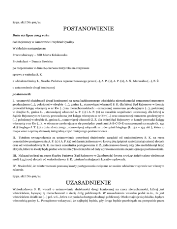 Sygn. akt I Ns 401/14 POSTANOWIENIE Dnia 02 lipca 2015 roku Sad Rejonowy w Zambrowie I Wydział Cywilny W składzie następującym Przewodniczący – SSR Marta Kołakowska Protokolant – Danuta Sawicka po rozpoznaniu w dniu 24 czerwca 2015 roku na rozprawie sprawy z wniosku S. K. z udziałem Gminy Ł., Skarbu Państwa reprezentowanego przez (...), A. P. (1), A. P. (2), A. Ś., Marszałka (...), Z. Ż. o ustanowienie drogi koniecznej postanowił: I. ustanowić służebność drogi koniecznej na rzecz każdoczesnego właściciela nieruchomości oznaczonej numerem geodezyjnym (...), położonej w obrębie (...), gmina Ł., stanowiącej własność S. K. dla której Sąd Rejonowy w Łomży prowadzi księgę wieczystą o nr Kw (...) na nieruchomościach: - oznaczonej numerem geodezyjnym (...), położonej w obrębie S., gmina Ł. , stanowiącej własność A. P. (1) i A. P. (2) na zasadzie wspólności ustawowej, dla której w Sądzie Rejonowym w Łomży prowadzona jest księga wieczysta o nr Kw (...) oraz oznaczonej numerem geodezyjnym (...) położonej w obrębie S., gmina Ł., stanowiącej własność Z. Ż. dla której Sąd Rejonowy w Łomży prowadzi księgę wieczystą o nr Kw (...) , w obszarze zawierającym się pomiędzy punktami A-B-C-D-E oznaczonymi na mapie (k. 135 akt) biegłego J. T. (1) z dnia 16.02.2015r., stanowiącej załącznik nr 1 do opinii biegłego (k. 132 – 134 akt ), która to mapa wraz z opinią stanowią integralną część niniejszego postanowienia . II. Tytułem wynagrodzenia za ustanowienie powyższej służebności zasądzić od wnioskodawcy S. K. na rzecz uczestników postępowania A. P. (1) i A. P. (2) solidarnie jednorazowo kwotę 564 (pięćset sześćdziesiąt cztery) złotych oraz od wnioskodawcy S. K. na rzecz uczestnika postępowania Z. Ż. jednorazowo kwotę 163 (sto sześćdziesiąt trzy) złotych, które to kwoty będą płatne w terminie 7 (siedem) dni od daty uprawomocnienia się niniejszego postanowienia. III. Nakazać pobrać na rzecz Skarbu Państwa (Sąd Rejonowy w Zambrowie) kwotę 5706,35 (pięć tysięcy siedemset sześć i 35/100) złotych od wnioskodawcy S. K. tytułem brakujących kosztów sądowych. IV. Stwierdzić, że zainteresowani ponoszą koszty postępowania związane ze swoim udziałem w sprawie we własnym zakresie. Sygn. akt I Ns 401/14 UZASADNIENIE Wnioskodawca S. K. wnosił o ustanowienie służebności drogi koniecznej na rzecz nieruchomości, której jest właścicielem, łączącej tę nieruchomość z siecią dróg publicznych. W uzasadnieniu wniosku podał m.in., że jest właścicielem działki nr (...) poł. w Ł., która nie posiada dostępu do drogi publicznej. Obok znajduje się działka, będąca własnością gminy Ł.. Początkowo wskazywał, że najlepiej będzie, gdy droga będzie przebiegała na przepuście przez działkę A. Ś.. Ostatecznie wnosił o ustanowienie drogi koniecznej według wariantu optymalnego, wskazanego przez biegłego sądowego za wynagrodzeniem. Uczestnik postępowania A. P. (1) początkowo wyraził zgodę na wydzielenie z jego działki (...) metrów pasa na drogę konieczną na rzecz wnioskodawcy. Po sporządzeniu opinii przez biegłego w sprawie, wnosił o nieustalanie przebiegu drogi w wariancie optymalnym, gdyby jednak Sąd ustanowił służebność według tego wariantu, wnosił o przyznanie wynagrodzenia. Uczestnik A. P. (2) wskazywała, że droga konieczna winna przebiegać „przez strugę”, gdyby miała przebiegać po jej działce , to żądała ustanowenia wynagrodzenia. Po sporządzeniu opinii przez biegłego w sprawie, wnosiła o nieustalanie przebiegu drogi w wariancie optymalnym. Uczestnik Gmina Ł. poparła wniosek co do zasady. Uczestnik Skarb Państwa reprezentowany przez (...)pozostawił wniosek do uznania Sądu. Uczestnik A. Ś. oświadczył, że nie wyraża zgody na ustanowenie przebiegu drogi koniecznej przez jego działkę. Uczestnik postępowania Z. Ż. wnosił (k. 158) o oddalenie wniosku. W przypadku uwzględnienia wniosku i wyznaczenia służebności przez działkę (...) wnosił o ustanowienie tej służebności za wynagrodzeniem według stawek obowiązujących na terenie miasta Ł.. Sąd ustalił, co następuje: Właścicielem działki nr (...), położonej w obrębie geodezyjnym (...), jest S. K.. Działka ta nie ma dojazdu do drogi publicznej. Dotychczas S. K., by dojechać do drogi publicznej, przejeżdżał przez działkę, będącą własnością A. P. (1) i A. P. (2) na zasadzie wspólności ustawowej, oznaczoną nr geodezyjnym 828 i położoną w obrębie S.. Sąd powyższe ustalił w oparciu o: wypis z rejestru gruntów i mapy (k. 4, 23, 152), odpis aktu not. (k. 4), opinię pisemną biegłego J. T. (k. 132-135, 159-161), oględziny (k. 118-120), opinię biegłego M. S. (k. 176-190). Sąd zważył, co następuje: Zgodnie z treścią art. 145 § 1 k.c., jeżeli nieruchomość nie ma odpowiedniego dostępu do drogi publicznej lub do należących do tej nieruchomości budynków gospodarskich, właściciel może żądać od właścicieli gruntów sąsiednich ustanowienia za wynagrodzeniem potrzebnej służebności drogowej (droga konieczna). Przepis § 2 cytowanego artykułu doprecyzowuje, iż przeprowadzenie drogi koniecznej następuje z uwzględnieniem potrzeb nieruchomości nie mającej dostępu do drogi publicznej oraz z najmniejszym obciążeniem gruntów, przez które droga ma prowadzić. Jeżeli potrzeba ustanowienia drogi jest następstwem sprzedaży gruntu lub innej czynności prawnej, a między zainteresowanymi nie dojdzie do porozumienia, sąd zarządzi, o ile to jest możliwe, przeprowadzenie drogi przez grunty, które były przedmiotem tej czynności prawnej. Zaś § 3 tego przepisu stanowi, iż przeprowadzenie drogi koniecznej powinno uwzględniać interes społeczno-gospodarczy. Przesłanka ustanowienia służebności drogi koniecznej jest określona w art. 145 § 1 k.c. Jest nią brak odpowiedniego dostępu nieruchomości do drogi public