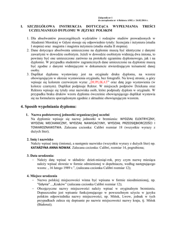 Załącznik nr 1 do zarządzenia nr 6 Rektora AMG z 24.02.2014 r. I. SZCZEGÓŁOWA INSTRUKCJA DOTYCZĄCA WYPEŁNIANIA UCZELNIANEGO DYPLOMU W JĘZYKU POLSKIM TREŚCI 1. Dla absolwentów poszczególnych wydziałów i rodzajów studiów prowadzonych w Akademii Morskiej w Gdyni stosuje się odpowiednio tytuły: licencjata i inżyniera (studia I stopnia) oraz magistra i magistra inżyniera (studia studia II stopnia). 2. Dane dotyczące absolwenta umieszczone na dyplomie muszą być identyczne z danymi zawartymi w dowodzie osobistym. Jeżeli w dowodzie osobistym widnieją dwa imiona, to powinny być one umieszczone zarówno na protokole egzaminu dyplomowego, jak i na dyplomie. W przypadku studentów zagranicznych dane umieszczone na dyplomie muszą być zgodne z danymi widniejącymi w dokumencie stwierdzającym tożsamość danej osoby. 3. Duplikat dyplomu wystawiany jest na oryginale druku dyplomu, na wzorze obowiązującym w okresie wystawienia oryginału, bez fotografii. Na lewej stronie, u góry wpisuje się kolorem czerwonym wyraz „DUPLIKAT” oraz datę jego wystawienia (w kolorze czarnym). Duplikat podpisuje Rektor. W miejscach podpisów Dziekana oraz Rektora wpisuje się tytuły oraz nazwiska osób, które podpisały dyplom w oryginale. W przypadku braku druków wzoru dyplomu ówcześnie obowiązującego duplikat wystawia się na formularzu sporządzonym zgodnie z aktualnie obowiązującym wzorem. 4. Sposób wypełniania dyplomu: 1. Nazwa podstawowej jednostki organizacyjnej uczelni Na dyplomie wpisuje się nazwę jednostki w brzmieniu: WYDZIAŁ ELEKTRYCZNY, WYDZIAŁ MECHANICZNY, WYDZIAŁ NAWIGACYJNY, WYDZIAŁ PRZEDSIĘBIORCZOŚCI I TOWAROZNAWSTWA. Zalecana czcionka: Calibri rozmiar 18 (wszystkie wyrazy z dużych liter); 2. Imię i nazwisko Należy wpisać imię (imiona), a następnie nazwisko (wszystkie wyrazy z dużych liter) np. KATARZYNA ANNA NOWAK. Zalecana czcionka: Calibri, rozmiar 14, pogrubiona; 3. Data urodzenia: Należy datę wpisać w układzie: dzień-miesiąć-rok, przy czym nazwę miesiąca należy wpisać słownie w formie odmienionej w dopełniaczu, według następującego wzoru: „16 lutego 1989 r.”, (zalecana czcionka Calibri rozmiar 12); 4. Miejsce urodzenia Nazwa polskiej miejscowości winna być wpisana w formie nieodmienionej, np. "Gdynia" , „Kraków” (zalecana czcionka Calibri rozmiar 12); Obcojęzyczne nazwy miejscowości należy wpisać w oryginalnym brzmieniu. Dopuszczalne jest wpisanie funkcjonującego w powszechnym użyciu w języku polskim odpowiednika nazwy miejscowości, np. Mińsk, Lwow, jednak w tych przypadkach zaleca się dopisanie po nazwie miejscowości nazwy kraju, tj. Mińsk (Białoruś); 6. Numer dyplomu Numer dyplomu nadawany jest w zespole Prorektora ds. Kształcenia. Numer dyplomu wpisywany na oryginale, na odpisach dyplomu, w suplemencie i księdze dyplomów musi być identyczny; 7. Na poziomie Należy wpisać odpowiednio "pierwszego stopnia" albo "drugiego stopnia" (Calibri, rozmiar 12, małe litery); 8. W obszarze i profilu kształcenia Należy wpisać odpowiednio, zgodnie z właściwą uchwałą Senatu AMG w sprawie określenia efektów kształcenia na określonym kierunku i poziomie kształcenia, w formie odmienionej: ‒ obszar nauk humanistycznych; profil ogónoakademicki ‒ obszar nauk społecznych; profil ogónoakademicki ‒ obszar nauk technicznych; profil praktyczny UWAGA: należy wypełnić tylko w przypadku absolwentów, którzy zrealizowali program kształcenia opracowany na bazie Krajowych Ram Kwalifikacji dla Szkolnictwa Wyższego (rozpoczęcie studiów w roku 2012/2013); w przypadku absolwentów kierunków studiów, którzy zrealizowali program nauczania opracowany w oparciu o standardy kształcenia (rozporządzenie Ministra Nauki i Szkolnictwa Wyższego z dnia 12 lipca 2007 r. w sprawie standardów kształcenia dla poszczególnych kierunków oraz poziomów kształcenia, a także trybu tworzenia i warunków, jakie musi spełniać uczelnia, by prowadzić studia międzykierunkowe oraz makrokierunki, Dz. U. z 2007 r. Nr 164 poz. 1166 z późn. zm.), należy umieścić poziomą kreskę „—”; UWAGA: w przypadku przyporządkowania kierunku studiów do więcej niż jednego obszaru należy wpisać wszystkie obszary, do których przyporządkowano kierunek studiów; 9. Na kierunku Należy wpisać nazwę kierunku z dużych liter w formie nieodmienionej np. "Towaroznawstwo"; „Mechanika i Budowa Maszyn”. (Calibri, rozmiar 12); 10. W specjalności Należy wpisać nazwę specjalności z dużej liter formie nieodmienionej np. Eksploatacja siłowni okrętowych i obiektów oceanotechnicznych; (Calibri, rozmiar 12); 11. W formie Należy wpisać odpowiednio "stacjonarnej" albo "niestacjonarnej" (Calibri, rozmiar 12); 12. Z wynikiem Należy wpisać słownie w formie odmienionej, z małej litery, np. „bardzo dobrym”, „dostatecznym”, „plus dobrym”, zgodnie z zasadami określonymi w Regulaminie Studiów AMG. (Calibri, rozmiar 12); 13. i uzyskania w dniu Należy wpisać datę złożenia egzaminu dyplomowego: np. „10 września 2014 r.” (zastosowana forma zapisu daty na oryginale musi być zgodna z formą zapisu daty na odpisach); wskazane jest słowne zapisywanie nazwy miesiąca; 14. tytułu zawodowego Należy wpisać odpowiednio w formie odmienionej, z małej litery, np. "licencjata", "magistra", "magistra inżyniera", "inżyniera", (Calibri, rozmiar 12); 15. Miejscowość i data wydania dyplomu Np. Gdynia, 15 września 2014 r. (Calibri, rozmiar 12) 16. Zdjęcia Na oryginale i na wszystkich odpisach dyplomu należy umieszczać takie same zdjęcia, wymiarach określonych w rozporządzeniu (45x65 mm). Niedopuszczalne jest przeklejanie zdjęć z wytłoczoną już wcześniej pieczęcią. Studenci zobowiązani są do złożenia kompletu zdjęć przed obroną pracy dyplomowej. 18. Pieczęcie urzędowe i pieczątki Zdjęcia absolwenta na oryginale dyplomu i na odpisach pieczętuje się w prawym dolnym rogu pieczęcią urz