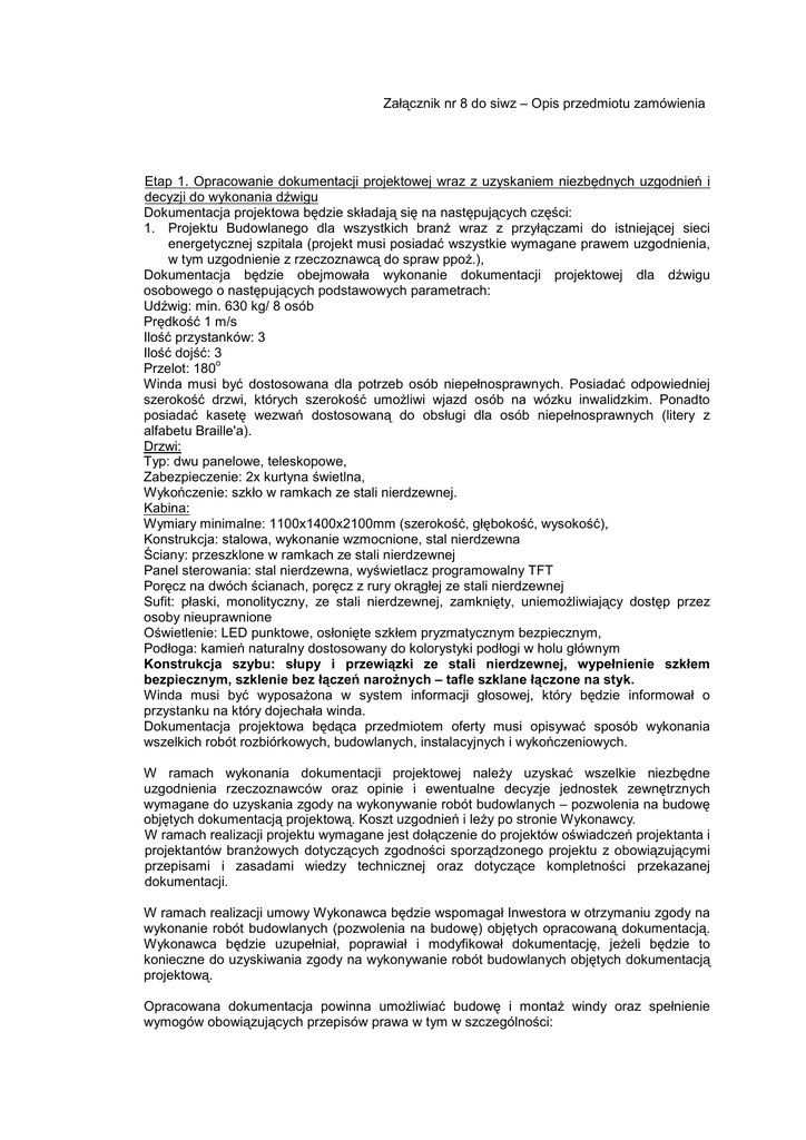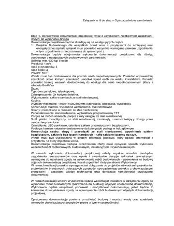 Załącznik nr 8 do siwz – Opis przedmiotu zamówienia Etap 1. Opracowanie dokumentacji projektowej wraz z uzyskaniem niezbędnych uzgodnień i decyzji do wykonania dźwigu Dokumentacja projektowa będzie składają się na następujących części: 1. Projektu Budowlanego dla wszystkich branż wraz z przyłączami do istniejącej sieci energetycznej szpitala (projekt musi posiadać wszystkie wymagane prawem uzgodnienia, w tym uzgodnienie z rzeczoznawcą do spraw ppoż.), Dokumentacja będzie obejmowała wykonanie dokumentacji projektowej dla dźwigu osobowego o następujących podstawowych parametrach: Udźwig: min. 630 kg/ 8 osób Prędkość 1 m/s Ilość przystanków: 3 Ilość dojść: 3 o Przelot: 180 Winda musi być dostosowana dla potrzeb osób niepełnosprawnych. Posiadać odpowiedniej szerokość drzwi, których szerokość umożliwi wjazd osób na wózku inwalidzkim. Ponadto posiadać kasetę wezwań dostosowaną do obsługi dla osób niepełnosprawnych (litery z alfabetu Braille'a). Drzwi: Typ: dwu panelowe, teleskopowe, Zabezpieczenie: 2x kurtyna świetlna, Wykończenie: szkło w ramkach ze stali nierdzewnej. Kabina: Wymiary minimalne: 1100x1400x2100mm (szerokość, głębokość, wysokość), Konstrukcja: stalowa, wykonanie wzmocnione, stal nierdzewna Ściany: przeszklone w ramkach ze stali nierdzewnej Panel sterowania: stal nierdzewna, wyświetlacz programowalny TFT Poręcz na dwóch ścianach, poręcz z rury okrągłej ze stali nierdzewnej Sufit: płaski, monolityczny, ze stali nierdzewnej, zamknięty, uniemożliwiający dostęp przez osoby nieuprawnione Oświetlenie: LED punktowe, osłonięte szkłem pryzmatycznym bezpiecznym, Podłoga: kamień naturalny dostosowany do kolorystyki podłogi w holu głównym Konstrukcja szybu: słupy i przewiązki ze stali nierdzewnej, wypełnienie szkłem bezpiecznym, szklenie bez łączeń narożnych – tafle szklane łączone na styk. Winda musi być wyposażona w system informacji głosowej, który będzie informował o przystanku na który dojechała winda. Dokumentacja projektowa będąca przedmiotem oferty musi opisywać sposób wykonania wszelkich robót rozbiórkowych, budowlanych, instalacyjnych i wykończeniowych. W ramach wykonania dokumentacji projektowej należy uzyskać wszelkie niezbędne uzgodnienia rzeczoznawców oraz opinie i ewentualne decyzje jednostek zewnętrznych wymagane do uzyskania zgody na wykonywanie robót budowlanych – pozwolenia na budowę objętych dokumentacją projektową. Koszt uzgodnień i leży po stronie Wykonawcy. W ramach realizacji projektu wymagane jest dołączenie do projektów oświadczeń projektanta i projektantów branżowych dotyczących zgodności sporządzonego projektu z obowiązującymi przepisami i zasadami wiedzy technicznej oraz dotyczące kompletności przekazanej dokumentacji. W ramach realizacji umowy Wykonawca będzie wspomagał Inwestora w otrzymaniu zgody na wykonanie robót budowlanych (pozwolenia na budowę) objętych opracowaną dokumentacją. Wykonawca będzie uzupełniał, poprawiał i modyfikował dokumentację, jeżeli będzie to konieczne do uzyskiwania zgody na wykonywanie robót budowlanych objętych dokumentacją projektową. Opracowana dokumentacja powinna umożliwiać budowę i montaż windy oraz spełnienie wymogów obowiązujących przepisów prawa w tym w szczególności: • • • • Prawa Budowlanego Rozporządzenie Ministra Transportu, Budownictwa i Gospodarki Morskiej w sprawie szczegółowego zakresu i formy projektu budowlanego. Rozporządzenia Ministra Zdrowia z dnia 26 czerwca 2012 r. w sprawie szczegółowych wymagań, jakim powinny odpowiadać pomieszczenia i urządzenia podmiotu wykonującego działalność leczniczą, Rozporządzeniem Ministra Infrastruktury z dnia 12 kwietnia 2002 r w sprawie warunków technicznych, jakim powinny odpowiadać budynki i ich usytuowanie, Wykonawca w ramach realizacji umowy powinien opracować dokumentację projektową w sposób zgodny z w/w przepisami (przywołane przepisy należy stosować zgodnie z obowiązującym obecnie stanem prawnym czyli wraz ze wszelkimi wprowadzonymi zmianami na dzień złożenia oferty). Działanie Wykonawcy oraz wyniki jego pracy muszą być zgodne z obowiązującym porządkiem prawnym. Dokumentacja projektowa powinna obejmować opracowania w następujące części: architektoniczno-budowlaną w tym fundament pod windę oraz sprawę wentylacji szybu, Konstrukcyjną – konstrukcję szybu, Technologiczną – konstrukcję elementów windy, wyposażenia itp. Elektryczną - zasilania windy, wpięcie do istniejącego systemy sygnalizacji pożaru Wykonawca przed przystąpieniem do projektowania będzie miał obowiązek wykonać szczegółową inwentaryzację miejsc, w którym będzie zlokalizowana winda. Zamawiający na etapie opracowywania dokumentacji projektowej udostępni Wykonawcy posiadaną dokumentację archiwalną budynku, w którym planowana jest budową dźwigu osobowego. Forma dokumentacji projektowej: Forma papierowa: Projekt w 6 egzemplarzach, każdy egzemplarz powinien zawierać wymagane uzgodnienia rzeczoznawców branżowych, Forma elektroniczna na nośniku CD/DVD w 2 egzemplarzach w formacie pdf oraz w formacie edytowalnym. Do dokumentacji zestawienie ilościowe i jakościowe przekazanej dokumentacji. Natomiast w ramach umowy: - Wykonawca w pełni odpowiada za jakość wykonanej pracy, a w przypadku popełnienia błędów ponosi koszty ewentualnych poprawek i następstw wynikłych z nieprawidłowości zawartych w projekcie - Wykonawca zapewnia nieodpłatne usunięcie wad projektu lub braków dokumentacji ujawnionych w trakcie realizacji etapu 2, Etap 2. Wykonanie dźwigu w golu głównym Wykonawca dopiero po opracowaniu i zatwierdzeniu przez Inwestora dokumentacji projektowej będzie mógł przystąpić do wykonywania prac budowlanych i montażowych. Obowiązkiem Wykonawcy będzie wykonanie i uruchomienie dźwigu osobowego, a w szczególności: - oznakowanie i wygrodzenie 