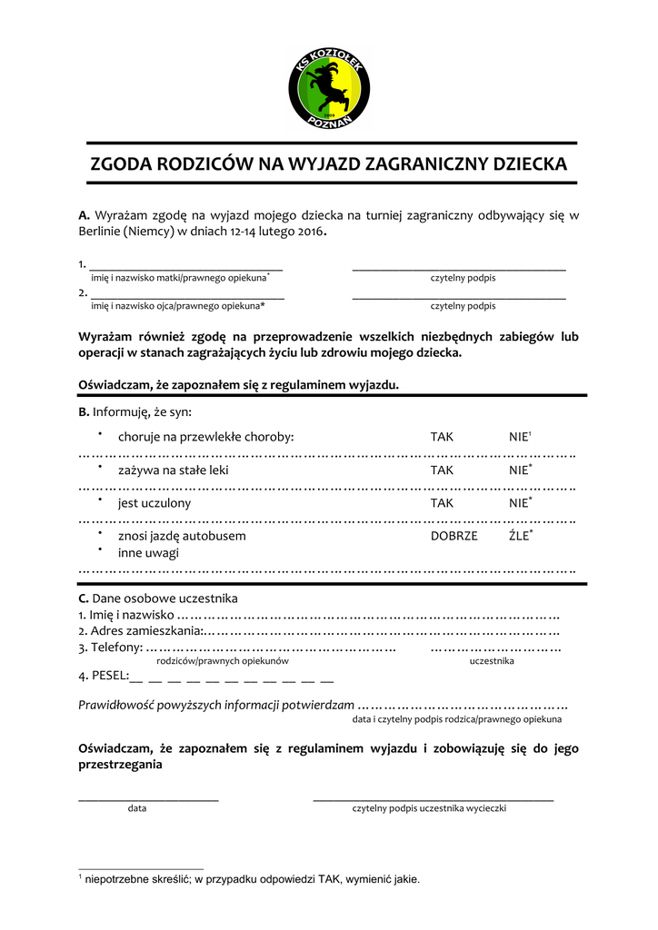 ZGODA RODZICÓW NA WYJAZD ZAGRANICZNY DZIECKA A. Wyrażam zgodę na wyjazd mojego dziecka na turniej zagraniczny odbywający się w Berlinie (Niemcy) w dniach 12-14 lutego 2016. 1. _____________________________ ________________________________ imię i nazwisko matki/prawnego opiekuna * czytelny podpis 2. _____________________________ ________________________________ imię i nazwisko ojca/prawnego opiekuna* czytelny podpis Wyrażam również zgodę na przeprowadzenie wszelkich niezbędnych zabiegów lub operacji w stanach zagrażających życiu lub zdrowiu mojego dziecka. Oświadczam, że zapoznałem się z regulaminem wyjazdu. B. Informuję, że syn: choruje na przewlekłe choroby: TAK NIE1 ………………………………………………………………………………………………….. zażywa na stałe leki TAK NIE* ………………………………………………………………………………………………….. jest uczulony TAK NIE* ………………………………………………………………………………………………….. znosi jazdę autobusem DOBRZE ŹLE* inne uwagi ………………………………………………………………………………………………….. C. Dane osobowe uczestnika 1. Imię i nazwisko …………………………………………………………………………… 2. Adres zamieszkania:……………………………………………………………………… 3. Telefony: ………………………………………………… ………………………… rodziców/prawnych opiekunów uczestnika 4. PESEL:__ __ __ __ __ __ __ __ __ __ __ Prawidłowość powyższych informacji potwierdzam ………………………………………… data i czytelny podpis rodzica/prawnego opiekuna Oświadczam, że zapoznałem się z regulaminem wyjazdu i zobowiązuję się do jego przestrzegania _____________________ data 1 ____________________________________ czytelny podpis uczestnika wycieczki niepotrzebne skreślić; w przypadku odpowiedzi TAK, wymienić jakie. REGULAMIN WYJAZDU DO BERLINA W DNIACH 12-14 LUTEGO 2016 1. Uczestnik wyjazdu ma prawo do miłego i bezpiecznego spędzenia czasu, publicznego prezentowania swoich poglądów, zwracania się ze wszystkimi problemami i pytaniami do opiekunów. 2. Każdy zawodnik ma prawo do uczestniczenia w turnieju w podobnym wymiarze czasowym oraz do zaprezentowania swoich umiejętności. 3. Każdy uczestnik ma prawo do równego traktowania przez opiekunów i oczekiwania należytego szacunku ze strony opiekunów. 4. Uczestnik zobowiązany jest stosować się do postanowień, przepisów i regulaminów obowiązujących w miejscu zakwaterowania oraz miejscach realizacji programu wyjazdu (m.in. przepisów przeciwpożarowych, komunikacyjnych, poruszania się po drogach publicznych, ciszy nocnej i korzystania z hali sportowej). 5. Uczestnik powinien być punktualny, zachowywać się w sposób zdyscyplinowany i kulturalny, a obiekty, w których przebywa traktować z należytym szacunkiem. 6. Uczestnik wyjazdu podlega opiekunom i jest zobowiązany do bezwzględnego wykonywania ich poleceń. 7. Podczas podróży uczestnik zobowiązany jest do przestrzegania przepisów podróżnych oraz stosowania się do poleceń opiekunów. 8. Uczestnik nie może oddalać się z miejsca zakwaterowania, obiektów zwiedzanych i miejsca rozgrywania turnieju. Jest także zobowiązany do zachowywania się zgodnie z ogólnie przyjętymi obyczajami, zasadami i zwyczajami panującymi w danym kraju (Niemcy). 9. Wszystkich uczestników wycieczki obowiązuje zachowanie, które nie naraża bezpieczeństwa własnego i innych. 10. Cisza nocna obowiązuje w godzinach 22.00 – 7.00. Po godzinie 23.00 w miejscu zakwaterowania obowiązuje cisza bezwzględna. 11. Każdy uczestnik zobowiązany jest dbać o swój bagaż i pieniądze oraz o porządek w miejscu zakwaterowania. Ma również obowiązek dbania o mienie i wyposażenie miejsca, w którym przebywa. Za szkody wyrządzone przez uczestnika wycieczki odpowiedzialność ponosi on sam lub jego rodzice/opiekunowie prawni. Organizator nie ponosi odpowiedzialności za rzeczy lub pieniądze zgubione z winy uczestnika. 12. Rodzice lub prawni opiekunowie zobowiązani są do zadbania o to, aby dziecko, będące uczestnikiem wycieczki zostało właściwie na nią wyposażone. Dotyczy to zwłaszcza ewentualnych lekarstw, ważnego dowodu tożsamości bądź ważnego paszportu, a także stosownego obuwia i odzieży. Uczestnik DRASTYCZNIE nieprzygotowany do wycieczki może być odesłany do domu nawet z miejsca zbiórki. 13. Uczestnik naruszający regulamin wyjazdu może być wydalony z wycieczki na koszt rodziców (prawnych opiekunów). Rodzice/prawni opiekunowie zostaną również obciążeni kosztami podróży opiekuna, który będzie eskortował ucznia. 14. Uczestnik nie może sam dawkować sobie leków. Może to robić jedynie w obecności opiekuna. 15. Uczestnik jest zobowiązany do spożywania przygotowanych posiłków. Może jedynie odmówić spożywania produktów, na które jest uczulony.