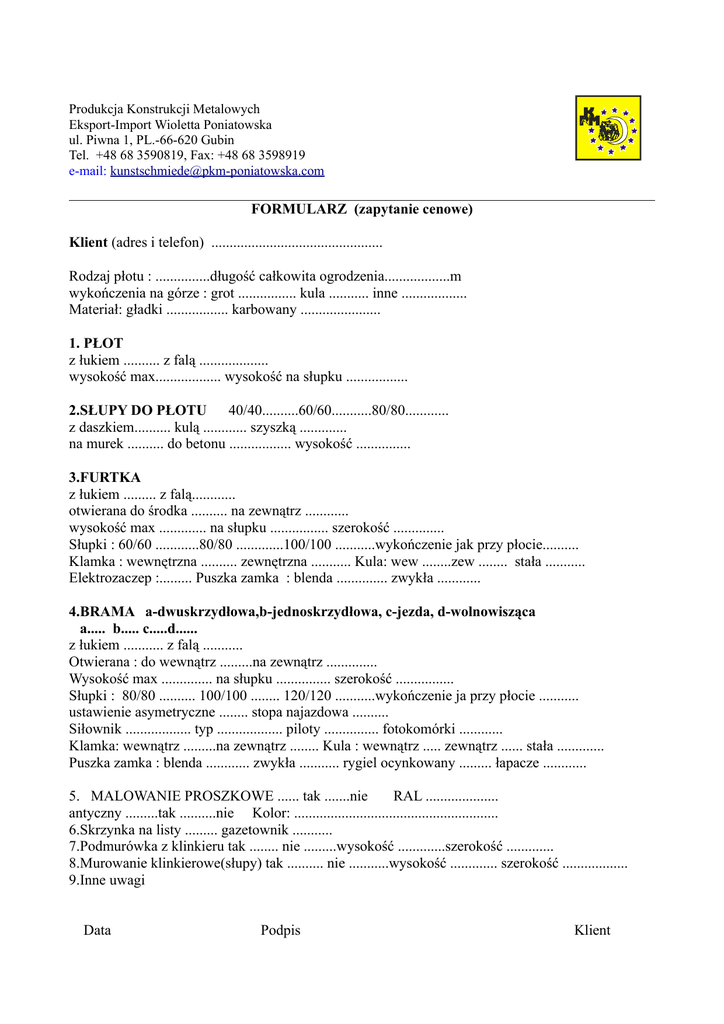 Produkcja Konstrukcji Metalowych Eksport-Import Wioletta Poniatowska ul. Piwna 1, PL.-66-620 Gubin Tel. +48 68 3590819, Fax: +48 68 3598919 e-mail: [email protected] FORMULARZ (zapytanie cenowe) Klient (adres i telefon) ............................................... Rodzaj płotu : ...............długość całkowita ogrodzenia..................m wykończenia na górze : grot ................ kula ........... inne .................. Materiał: gładki ................. karbowany ...................... 1. PŁOT z łukiem .......... z falą ................... wysokość max.................. wysokość na słupku ................. 2.SŁUPY DO PŁOTU 40/40..........60/60...........80/80............ z daszkiem.......... kulą ............ szyszką ............. na murek .......... do betonu ................. wysokość ............... 3.FURTKA z łukiem ......... z falą............ otwierana do środka .......... na zewnątrz ............ wysokość max ............. na słupku ................ szerokość .............. Słupki : 60/60 ............80/80 .............100/100 ...........wykończenie jak przy płocie.......... Klamka : wewnętrzna .......... zewnętrzna ........... Kula: wew ........zew ........ stała ........... Elektrozaczep :......... Puszka zamka : blenda .............. zwykła ............ 4.BRAMA a-dwuskrzydłowa,b-jednoskrzydłowa, c-jezda, d-wolnowisząca a..... b..... c.....d...... z łukiem ........... z falą ........... Otwierana : do wewnątrz .........na zewnątrz .............. Wysokość max .............. na słupku ............... szerokość ................ Słupki : 80/80 .......... 100/100 ........ 120/120 ...........wykończenie ja przy płocie ........... ustawienie asymetryczne ........ stopa najazdowa .......... Siłownik .................. typ .................. piloty ............... fotokomórki ............ Klamka: wewnątrz .........na zewnątrz ........ Kula : wewnątrz ..... zewnątrz ...... stała ............. Puszka zamka : blenda ............ zwykła ........... rygiel ocynkowany ......... łapacze ............ 5. MALOWANIE PROSZKOWE ...... tak .......nie RAL .................... antyczny .........tak ..........nie Kolor: ........................................................ 6.Skrzynka na listy ......... gazetownik ........... 7.Podmurówka z klinkieru tak ........ nie .........wysokość .............szerokość ............. 8.Murowanie klinkierowe(słupy) tak .......... nie ...........wysokość ............. szerokość .................. 9.Inne uwagi Data Podpis Klient