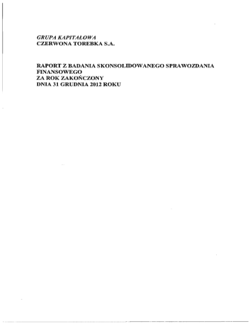 GRUPA KAPITAŁOWA CZERWONA TOREBKA S.A. RAPORT Z BADANIA SKONSOLIDOWANEGO SPRAWOZDANIA FINANSOWEGO ZA ROK ZAKOŃCZONY DNIA 31 GRUDNIA 2012 ROKU GRUPA KAPITAŁOWA CZERWONA TOREBKA S.A. Raport z badania skonsolidowanego sprawozdania finansowego za rok zakończony dnia 31 grudnia 2012 roku (w tysiącach złotych) I. CZĘŚĆ OGÓLNA 1. Informacje ogólne Jednostką dominująca w Grupie Kapitałowej (zwanej dalej „Grupą" lub „Grupą Kapitałową") jest Czerwona Torebka S.A. (Jednostka dominująca", „Spółka"). Jednostka dominująca została utworzona Aktem Notarialnym z dnia 22 października 2007 roku. Siedziba jednostki dominującej mieści się w Poznaniu, przy ul. Taczaka 13 Jednostka dominująca jest emitentem papierów wartościowych, o których mowa w art. 4 rozporządzenia Parlamentu Europejskiego i Rady Unii Europejskiej z dnia 19 lipca 2002 r. nr 1606/2002/WE w sprawie stosowania międzynarodowych standardów rachunkowości (Dz. Urz. WE L 243 z 11 września 2002 roku, str. 1; Dz. Urz. UE Polskie wydanie specjalne, rozdz. 13, t. 29, str. 609) i na podstawie art. 55.5 ustawy z dnia 29 września 1994 roku o rachunkowości (Dz.U. nr 152 z 2009 roku poz. 1223, z późn. zm. - „ustawa o rachunkowości") sporządza skonsolidowane sprawozdania finansowe Grupy zgodnie z Międzynarodowymi Standardami Sprawozdawczości Finansowej, które zostały zatwierdzone przez UE. W dniu 9 listopada 2007 roku jednostka dominująca została wpisana do rejestru przedsiębiorców Krajowego Rejestru Sądowego pod numerem KRS 0000292312. Jednostka dominująca posiada numer 778-14-50-539 nadany w dniu 4 grudnia 2007 roku oraz symbol REGON: 300709350 nadany w dniu 28 listopada 2007 roku. Podstawowym przedmiotem działalności jednostki dominującej jest: • pośrednictwo w obrocie nieruchomościami, • pozostałe doradztwo w zakresie prowadzenia działalności gospodarczej i zarządzania. Zakres działalności podmiotów zależnych jest związany z działalnościąjednostki dominującej. W dniu 31 grudnia 2012 roku kapitał podstawowy jednostki dominującej wynosił 10.343 tysięcy złotych. Kapitał własny Grupy na ten dzień wynosił 562.662 tysięcy złotych. Zgodnie z Księgą Akcyjną z dnia 20 lutego 2013 roku struktura własności kapitału podstawowego jednostki dominującej była następująca: I!I ERNST&YOUNG 2/15 f GRUPA KAPITAŁOWA CZERWONA TOREBKA S.A. Raport z badania skonsolidowanego sprawozdania finansowego za rok zakończony dnia 31 grudnia 2012 roku (iv tysiącach złotych) Ilość akcji Ilość głosów Wartość nominalna akcji Mariusz Switalski Forteam Investment S. ar. 1. Świtalski & Synowie sp. z o.o. SKA Trzecia Świtalski & Synowie sp. z o.o. SKA Czwarta Świtalski & Synowie sp. z o.o. SKA Piąta Świtalski & Synowie sp. z o.o. SKA Szósta Świtalski & Synowie sp. z o.o. SKA Siódma Świtalski & Synowie sp. z o.o. SKA Ósma Świtalski & Synowie sp. z o.o. SKA Pozostali Akcjonariusze 1 854 144 12 138 439 6 056 864 3 708 285 2 474 379 2 474 379 2 474 379 8 649 379 8 649 379 3 234 508 1 854 144 12 138 439 6 056 864 3 708 285 2 474 379 2 474 379 2 474 379 8 649 379 8 649 379 3 234 508 370 829 2 427 688 1 211 373 741 657 494 876 494 876 494 876 1 729 876 1 729 876 646 902 Razem 51 714 135 51 714 135 10 342 827 Udział w kapitale podstawowym 3,59% 23,47% 11,71% 7,17% 4,78% 4,78% 4,78% 16,73% 16,73% 6,25% 100% Zgodnie ze stanem księgi akcyjnej jednostki dominującej na dzień 20 lutego 2013, w roku obrotowym oraz po dacie bilansowej do daty opinii miały miejsce następujące zmiany w strukturze własnościowej kapitału podstawowego jednostki dominującej: Na podstawie umowy z dnia 14 grudnia 2012 roku spółka Czwarta - Świtalski & Synowie spółka z ograniczoną odpowiedzialnością S.K.A. z siedzibą w Sowińcu zbyła na rzecz Siódma - Świtalski & Synowie spółka z ograniczoną odpowiedzialnością S.K.A. z siedzibą w Sowińcu, 2.470.000 (dwa miliony czterysta siedemdziesiąt tysięcy) akcji imiennych zwykłych serii B Na podstawie umowy z dnia 14 grudnia 2012 roku spółka Piąta - Świtalski & Synowie spółka z ograniczoną odpowiedzialnością S.K.A. z siedzibą w Sowińcu zbyła na rzecz Ósma - Świtalski & Synowie spółka z ograniczoną odpowiedzialnością S.K.A. z siedzibą w Sowińcu, 2.470.000 (dwa miliony czterysta siedemdziesiąt tysięcy) akcji imiennych zwykłych serii B Na podstawie umowy z dnia 14 grudnia 2012 roku spółka Szósta - Świtalski & Synowie spółka z ograniczoną odpowiedzialnością S.K.A. z siedzibą w Sowińcu zbyła na rzecz Siódma - Świtalski & Synowie spółka z ograniczoną odpowiedzialnością S.K.A. z siedzibą w Sowińcu, 1.235.000 (jeden milion dwieście trzydzieści pięć tysięcy) akcji imiennych zwykłych serii B Na podstawie umowy z dnia 14 grudnia 2012 roku spółka Szósta - Świtalski & Synowie spółka z ograniczoną odpowiedzialnością S.K.A. z siedzibą w Sowińcu zbyła na rzecz w Sowińcu, 1.235.000 (jeden milion dwieście trzydzieści pięć tysięcy) akcji imiennych zwykłych serii B I!I ERNST&YOUNG 3/15 f o GRUPA KAPITAŁOWA CZERWONA TOREBKA S.A. Raport z badania skonsolidowanego sprawozdania finansowego za rok zakończony dnia 31 grudnia 2012 roku (w tysiącach złotych) Zgodnie z uchwałą Nadzwyczajnego Walnego Zgromadzenia Akcjonariuszy z dnia 14 grudnia 2012 roku Spółka ustanowiła program menadżerski. W ramach programu dotychczasowi akcjonariusze zbyli proporcjonalnie do Swojego udziału 545.373 akcji. Akcje zostały sprzedane wybranym pracownikom Spółki. W dniu 28 grudnia 2012 roku Spółka zadebiutowała na Warszawskiej Giełdzie Papierów Wartościowych. Do celów debiuty przeprowadzono emisję 2.689.135 akcji o wartości nominalnej 0,20 PLN. Zmiany kapitału podstawowego jednostki dominującej w roku obrotowym były następujące: Ilość akcji Wartość nominalna akcji Stan na początek okresu Podwyższenie kapitału - emisja serii D 49 025 000 2 689 135 9 805 000 PLN 537 827 PLN Stan na konie