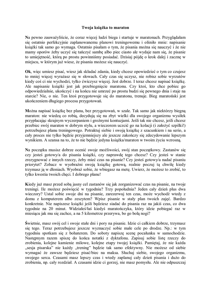 Twoja książka to maraton Na pewno zauważyliście, że coraz więcej ludzi biega i startuje w maratonach. Przyglądałam się ostatnio perfekcyjnie zaplanowanemu planowi treningowemu i olśniło mnie: napisanie książki tak samo go wymaga. Ostatnio pisałam o tym, że pisania można się nauczyć i że nie mamy oporów żeby uczyć się tańczyć sambę albo piec ciasto ale wydaje nam się, że pisanie to umiejętność, którą po prostu powinniśmy posiadać. Dzisiaj pójdę o krok dalej i zacznę w miejscu, w którym już wiesz, że pisania możesz się nauczyć. Ok, więc umiesz pisać, wiesz jak składać zdania, kiedy chcesz opowiedzieć o tym co czujesz to mniej więcej wyrażasz się w słowach. Cały czas się uczysz, nie robisz sobie wyrzutów kiedy coś ci nie wychodzi, tylko ćwiczysz więcej. Jest dobrze. I teraz chcesz napisać książkę. Ale napisanie książki jest jak przebiegnięcie maratonu. Czy ktoś, kto chce pobiec go odpowiedzialnie, ukończyć i na końcu nie umrzeć po prostu budzi się pewnego dnia i staje na starcie? Nie, o nie. Ten ktoś przygotowuje się do maratonu, trenuje. Bieg maratoński jest ukończeniem długiego procesu przygotowań. Można napisać książkę bez planu, bez przygotowań, w szale. Tak samo jak niektórzy biegną maraton: nie wiedzą co robią, decydują się na zbyt wielki dla swojego organizmu wysiłek przypłacając skrajnym wyczerpaniem i groźnymi kontuzjami. Jeśli tak nie chcesz, jeśli chcesz przebiec swój maraton w dobrym stylu, a wieczorem uczcić go na kolacji (i założyć szpilki!) potrzebujesz planu treningowego. Potraktuj siebie i swoją książkę z szacunkiem i na serio, a cały proces nie tylko będzie przyjemniejszy ale jeszcze zakończy się zdecydowanie lepszym wynikiem. A szansa na to, że to nie będzie jedyna książka/maraton w twoim życiu wzrosną. Na początku musisz dobrze ocenić swoje możliwości, swój stan początkowy. Zastanów się czy jesteś gotowy/a do pisania książki, czy naprawdę tego chcesz? Czy jesteś w stanie zrezygnować z innych rzeczy, żeby mieć czas na pisanie? Czy jesteś gotowy/a nadać pisaniu priorytet? Zobacz w wyobraźni swoją książkę gotową, realnie poczuj tą chwilę kiedy trzymasz ją w dłoniach. Wyobraź sobie, że wbiegasz na metę. Uwierz, że możesz to zrobić, to tylko kwestia twoich chęci. I dobrego planu! Kiedy już masz przed sobą jasny cel zastanów się jak zorganizować czas na pisanie, na twoje treningi. Ile możesz poświęcić w tygodniu? Trzy popołudnia? Jeden cały dzień plus dwa wieczory? Ustal sobie swoje dni na pisanie, zarezerwuj ten czas, może wychodź wtedy z domu z komputerem albo zeszytem? Wpisz pisanie w stały plan twoich zajęć. Bardzo konkretnie. Nie napiszesz książki jeśli będziesz siadać do pisania raz na jakiś czas, co dwa tygodnie na 20 minut. Widziałeś/łaś kiedyś maratończyka, który idzie pobiegać raz w miesiącu jak mu się zachce, a na 5 kilometrze przerywa, bo go bolą nogi? Świetnie, masz swój cel i swoje stałe dni i pory na pisanie. Idzie ci całkiem dobrze, trzymasz się tego. Teraz potrzebujesz jeszcze wyznaczyć sobie małe cele po drodze. Np.: w tym tygodniu spotkam się z bohaterem. Do soboty napiszę scenę pocałunku w samochodzie. Następnym razem spiszę do końca notatki z dyktafonu. Zapisuj sobie listę rzeczy do zrobienia, kolejne kamienie milowe, kolejne etapy twojej książki. Pamiętaj, że nie każda „sesja pisarska” nie każdy „trening” będzie tak samo efektywny. Nie możesz od siebie wymagać że zawsze będziesz pisać/biec na maksa. Słuchaj siebie, swojego organizmu, swojego serca. Czasami masz lepszy czas i wtedy zaplanuj cały dzień pisania i dużo do zrobienia, np. cały rozdział. A czasami idzie ci gorzej, nie masz pomysłu. Ale nie odpuszczaj wtedy całkiem, zrób coś mniejszego, przeczytaj na głos to co już napisałeś/łaś, wprowadź poprawki. Systematyczna praca jest bardzo ważna. Ale to nie wszystko. Biegacz potrzebuje dobrej diety. Posiłki muszą być maksymalnie odżywcze, inne przed biegiem, inne po. To bardzo ważne. A czym ty, pisarzu, karmisz swój umysł? Czy dajesz mu suche bułki i myślisz, że da radę przebiec maraton? Jeśli chcesz pisać potrzebujesz inspiracji, pobudzenia i tak samo odpoczynku, regeneracji. Zastanów się co najbardziej dostarcza ci jednego i drugiego. Czytaj, oglądaj filmy, obserwuj rzeczywistość, notuj... sposobów na inspirowanie się jest wiele i czas, żebyś znalazł/a swoje. Tak samo jest z odpoczynkiem. Pisanie to często duży wysiłek. Nie bagatelizuj tego, musisz się zregenerować. Idź na spacer. Wyczyść umysł. Najlepsze pomysły najczęściej wpadają kiedy nie siedzi się przy biurku. Kiedy się rozluźnisz spojrzysz na swoją książkę z innej perspektywy. Trzymam kciuki za twój plan. Pamiętaj, żeby nie przejmować się chwilowymi niepowodzeniami, każdy ma gorsze dni. Po prostu pisz. I dbaj o siebie!