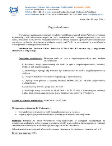Fundacja im. Doktora Piotra Janaszka PODAJ DALEJ KRS 0000 197058 Adres: ul. Południowa 2A, 62-510 Konin Telefon: 63 211 22 19 e-mail: [email protected] FB/FundacjaPodajDalej Konto bankowe: Bank PKO BP, 55 1020 2746 0000 3102 0053 9650 www.podajdalej.org.pl Konin, dnia 18 maja 2016 r. Zapytanie ofertowe W związku z działaniami w ramach projektów współfinansowanych przez Państwowy Fundusz Rehabilitacji Osób Niepełnosprawnych na rzecz środowiska osób z niepełnosprawnością (w tym: dzieci, młodzież i osoby dorosłe z niepełnosprawnością a także terapeuci, opiekunowie i wolontariusze pracujący z osobami z niepełnosprawnością) na terenie całej Polski, w szczególności w województwie wielkopolskim w subregionie konińskim. Fundacja im. Doktora Piotra Janaszka PODAJ DALEJ zwraca się z zapytaniem ofertowym o cenę usługi: Przedmiot zamówienia: Transport osób (w tym z niepełnosprawnością oraz wózków inwalidzkich) 1. Realizacja usługi transportowej dla osób (w tym z niepełnosprawnością ruchową) średnio 6 000 km miesięcznie. 2. Zamawiający wymaga aby transport był dostosowany dla osób z niepełnosprawnością ruchową. 3. Transport dodatkowych wózków na przyczepce samochodowej. 4. Odjazdy osób głównie z siedziby Fundacji PODAJ DALEJ wielkopolskie). (Konin, województwo 5. Jednorazowy przewóz grupy max. 20 osób. 6. Realizacja usługi w okresie od 01.06.2016 r. do 30.12.2016 r. Harmonogram realizacji a także trasa zostaną uzgodnione na etapie podpisywania umowy z wykonawcą. Termin wykonania zamówienia: 01.06.2016 – 30.12.2016 Wymagania w stosunku do Wykonawcy: Doświadczenie w transporcie osób z niepełnosprawnością ruchową. Pojazdy wykorzystywane do transportu posiadające windę lub inne urządzenie. Płatności: Płatności na rzecz Wykonawcy będą realizowane w odstępach miesięcznych po zrealizowaniu usługi dla kolejnych grup warsztatowych (14 grup zgodnie z harmonogramem realizacji określonym w umowie) na podstawie wystawionego rachunku lub faktury. Oferent powinien przygotować ofertę na formularzu załączonym do niniejszego zapytania zał. nr 1 Kryterium cenowe: 100% Fundacja im. Doktora Piotra Janaszka PODAJ DALEJ KRS 0000 197058 Adres: ul. Południowa 2A, 62-510 Konin Telefon: 63 211 22 19 e-mail: [email protected] FB/FundacjaPodajDalej Konto bankowe: Bank PKO BP, 55 1020 2746 0000 3102 0053 9650 www.podajdalej.org.pl Miejsce oraz termin składania ofert: Oferta powinna być przesłana za pośrednictwem: poczty elektronicznej na adres [email protected] lub przesłana pocztą lub dostarczona osobiście na adres: Fundacja im. Doktora Piotra Janaszka PODAJ DALEJ, ul. Południowa 2 A, 62-510 Konin do dnia 25.05.2016 (liczy się data wpływu) Oferty złożone po terminie, lub innym druku, niekompletne lub nie spełniające stawianych wymagań nie będą rozpatrywane. Oferent może przed upływem terminu składania ofert zmienić lub wycofać swoją ofertę. Informacje dotyczące wyboru najkorzystniejszej oferty: O wyborze najkorzystniejszej oferty Zamawiający zawiadomi za pośrednictwem poczty elektronicznej i/lub telefonicznie. tylko wybranego oferenta Dodatkowych informacji udziela Joanna Szymczak pod nr. telefonu 63 211 22 19. Przedstawione zapytanie nie stanowi oferty w myśl art. 66 Kodeksu Cywilnego, jak również nie jest ogłoszeniem w rozumieniu ustawy Prawo zamówień publicznych. Fundacja im. Doktora Piotra Janaszka PODAJ DALEJ KRS 0000 197058 Adres: ul. Południowa 2A, 62-510 Konin Telefon: 63 211 22 19 e-mail: [email protected] FB/FundacjaPodajDalej Konto bankowe: Bank PKO BP, 55 1020 2746 0000 3102 0053 9650 www.podajdalej.org.pl Załącznik nr 1 …………………………………………… ……………, dnia ……… Imię i nazwisko / Nazwa firmy/organizacji ………………………………………… Adres FORMULARZ OFERTOWY ZAMAWIAJĄCY Fundacja im. Doktora Piotra Janaszka PODAJ DALEJ, ul. Południowa 2 A, 62-510 Konin NIP 6652679972 REGON 311611013 Odpowiadając na zapytanie ofertowe – przedmiot zamówienia transport osób sprawnych i osób z niepełnosprawnością w ramach działań współfinansowanych ze środków Państwowego Funduszu Rehabilitacji Osób Niepełnosprawnych. SKŁADAM OFERTĘ NA WYKONANIE ZAMÓWIENIA Wykonawca:……………………………………………………………………... Adres:…………………………………………………………………………….. Tel. ……………………………………………………………………………….. E-mail…………………………………………………………………………….. NIP ………………………………………………………………………………. PESEL…………………………………………………………………………… Cena za wykonanie usługi: Cena brutto za 1 km trasy………..……………………………………………………. PLN słownie……………………………………………………………………………....................... .……………………......................... Czytelny podpis Wykonawcy