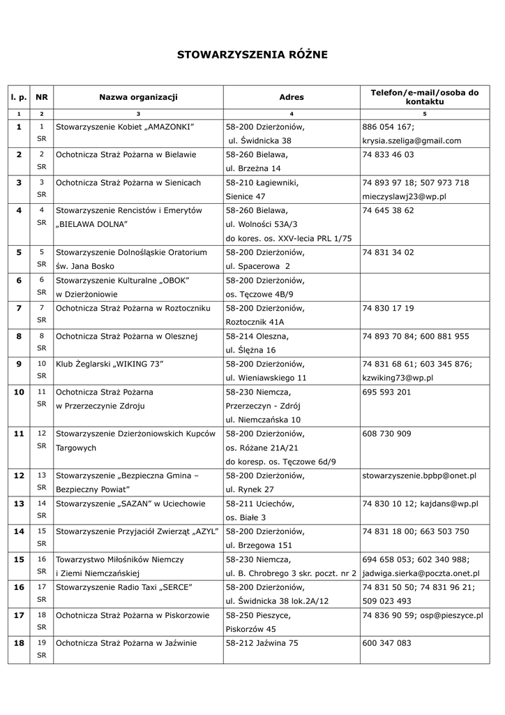 STOWARZYSZENIA RÓŻNE NR Nazwa organizacji Adres Telefon/e-mail/osoba do kontaktu 1 2 3 4 5 1 1 l. p. Stowarzyszenie Kobiet „AMAZONKI” SR 2 2 ul. Świdnicka 38 Ochotnicza Straż Pożarna w Bielawie SR 3 3 4 SR 58-260 Bielawa, 886 054 167; [email protected] 74 833 46 03 ul. Brzeżna 14 Ochotnicza Straż Pożarna w Sienicach 58-210 Łagiewniki, 74 893 97 18; 507 973 718 Sienice 47 [email protected] Stowarzyszenie Rencistów i Emerytów 58-260 Bielawa, 74 645 38 62 „BIELAWA DOLNA” ul. Wolności 53A/3 SR 4 58-200 Dzierżoniów, do kores. os. XXV-lecia PRL 1/75 5 5 SR 6 6 SR 7 7 Stowarzyszenie Dolnośląskie Oratorium 58-200 Dzierżoniów, św. Jana Bosko ul. Spacerowa 2 Stowarzyszenie Kulturalne „OBOK” 58-200 Dzierżoniów, w Dzierżoniowie os. Tęczowe 4B/9 Ochotnicza Straż Pożarna w Roztoczniku 58-200 Dzierżoniów, SR 8 8 10 Ochotnicza Straż Pożarna w Olesznej 58-214 Oleszna, 74 893 70 84; 600 881 955 ul. Ślężna 16 Klub Żeglarski „WIKING 73” SR 10 74 830 17 19 Roztocznik 41A SR 9 74 831 34 02 58-200 Dzierżoniów, 74 831 68 61; 603 345 876; ul. Wieniawskiego 11 [email protected] 695 593 201 11 Ochotnicza Straż Pożarna 58-230 Niemcza, SR w Przerzeczynie Zdroju Przerzeczyn - Zdrój ul. Niemczańska 10 11 12 Stowarzyszenie Dzierżoniowskich Kupców 58-200 Dzierżoniów, SR Targowych os. Różane 21A/21 608 730 909 do koresp. os. Tęczowe 6d/9 12 13 13 Stowarzyszenie „Bezpieczna Gmina – 58-200 Dzierżoniów, SR Bezpieczny Powiat” ul. Rynek 27 14 Stowarzyszenie „SAZAN” w Uciechowie 58-211 Uciechów, SR 14 15 16 Stowarzyszenie Przyjaciół Zwierząt „AZYL” 58-200 Dzierżoniów, 16 Towarzystwo Miłośników Niemczy 58-230 Niemcza, SR i Ziemi Niemczańskiej ul. B. Chrobrego 3 skr. poczt. nr 2 [email protected] 17 Stowarzyszenie Radio Taxi „SERCE” 58-200 Dzierżoniów, 74 831 50 50; 74 831 96 21; ul. Świdnicka 38 lok.2A/12 509 023 493 58-250 Pieszyce, 74 836 90 59; [email protected] 18 Ochotnicza Straż Pożarna w Piskorzowie SR 18 74 831 18 00; 663 503 750 ul. Brzegowa 151 SR 17 74 830 10 12; [email protected] os. Białe 3 SR 15 [email protected] 19 SR 694 658 053; 602 340 988; Piskorzów 45 Ochotnicza Straż Pożarna w Jaźwinie 58-212 Jaźwina 75 600 347 083 19 20 20 Stowarzyszenie Klubu Abstynenta 58-200 Dzierżoniów, SR „Na Pawłowym Wzgórzu” Wzgórze Ojca Św. Jana Pawła II 1 21 Towarzystwo Przyjaciół Bielawy 58-260 Bielawa, SR 21 22 23 Ochotnicza Straż Pożarna w Gilowie 24 Ochotnicza Straż Pożarna w Łagiewnikach 26 27 28 29 32 35 36 0698 207 75; [email protected] 74 821 5252; 74831 80 00 Dzierżoniowskich „Radio Taxi BIS” ul. Strumykowa 1 25 Ochotnicza Straż Pożarna w Niemczy 58-230 Niemcza, 6633 060 713; ul. Ogrodowa 1 [email protected] 74 893 76 36; 660 021 218 26 Ochotnicza Straż Pożarna w Ligocie 58-210 Łagiewniki, SR Wielkiej Ligota Wielka 56B 27 Stowarzyszenie Sudecka Agencja 58-260 Bielawa, SR Artystyczna „SART” ul. Piastowska 18 28 Stowarzyszenie Wędkarskie „SUDETY” 58-260 Bielawa, SR w Bielawie ul. Wysoka 1 29 Towarzystwo Turystyczno-Narciarskie 58-200 Dzierżoniów, SR „POTOCZEK” os. Różane 3B/12 31 Towarzystwo Miłośników Dzierżoniowa 58-200 Dzierżoniów, 74 645 16 46; 698 249 839; ul. Świdnicka 30 [email protected] 58-200 Dzierżoniów, 74 645 66 67 32 Stowarzyszenie „Nasz Krzyż” 33 Stowarzyszenie Obrony Bezrobotnych 58-200 Dzierżoniów, SR „GODNOŚĆ” ul. Piastowska 1 35 Stowarzyszenie Dzierżoniów XXI Wiek 58-200 Dzierżoniów, 36 74 834 44 45 74 833 68 96 74 831 71 78 ul. Nowa 1C/7 509 944 391; 518 037 740 ul. Kościelna 4 Związek Harcerstwa Wiejskiego SR 34 ul. Lipowa 4 58-200 Dzierżoniów, SR 33 74 893 94 97; 74 893 90 62; Stowarzyszenie Taksówkarzy SR 31 58-210 Łagiewniki, SR SR 30 [email protected] 24 SR 25 58-230 Niemcza, Gilów 43 SR 23 74 833 30 07; 74 646 53 10 os. Włókniarzy 10 SR 22 74 832 36 18; 669 094 250 58-200 Dzierżoniów, 74 831 67 73; 603 165 585 ul. Rynek 36 37 Stowarzyszenie Na Rzecz Rozwoju 58-200 Dzierżoniów, 74 831 24 20; SR i Integracji „UŚMIECH” ul. Miernicza 2 [email protected] 38 Stowarzyszenie Klub Abstynenta 58-200 Dzierżoniów, 504 439 720 SR „KALENICA” ul. Rynek 36 39 Klub Osób Niewidomych, 58-230 Niemcza, SR Niepełnosprawnych, Emerytów ul. Rynek 14 74 837 61 27 i Rencistów „RADOŚĆ” w Niemczy 37 38 40 Stowarzyszenie Społeczno - Kulturalne SR 58-262 Owiesno 96 74 831 90 47, 606 120 090 „Za Miastem” 41 Ochotnicza Straż Pożarna w Tuszynie 58-203 Tuszyn 74 830 28 77 42 Stowarzyszenie „LEPSZE JUTRO” 58-250 Pieszyce, 74 836 52 23; 74 836 52 23 SR w Pieszycach [email protected] SR 39 ul. Ogrodowa 81 [email protected] 40 43 Stowarzyszenie „EDUKACJA I RODZINA” SR 41 42 43 44 45 58-200 Dzierżoniów, 604 645 633; ul. Wrocławska 51 [email protected] 44 Towarzystwo Miast Partnerskich 58-200 Dzierżoniów, 600 554 605; 74 831 49 55; SR Dzierżoniowskich ul. Bat. Chłopskich 19 [email protected] 45 Stowarzyszenie „Partnerstwo na Rzecz 58-240 Piława Górna, 504 250 522 SR Piławy” ul. Zielona 9 46 Stowarzyszenie „Obywatelski Blok 58-200 Dzierżoniów, 74 645 68 86; 515 190 836; SR Samorządowy” ul. Rynek 47 [email protected] 47 Stowarzyszenie Tekstylne Ziemi 58-260 Bielawa, SR Dzierżoniowskiej ul. Waryńskiego 15A 48 Stowarzyszenie na Rzecz Remontu 58-200 Dzierżoniów, SR i Renowacji Zabytkowego Kościoła ul. Miodowa 3 602 752 509 p.w. św. Jerzego 46 47 48 49 50 50 Stowarzyszenie Pomocy Honorowym 58-200 Dzierżoniów, SR Dawcom Krwi ul. Ząbkowicka 55 52 Sudeckie Towarzystwo Opieki nad 58-200 Dzierżoniów, SR Zwierzętami os. Różane 22A/6 53 Stowarzyszenie Taksówkarzy 58-260 Bielawa, 74 833 35 55; 607 209 685; SR „TELE TAXI” w Bielawie ul. Kopernika 7 609 525 237 54 Towarzystwo Oświatowe Ziemi 58-200 Dzierżoniów, 605 205 310; 600 822 729; SR Dzierżoniowskiej ul. Świdnicka 38 [email protected] 55 Rada Rodziców „RADIOBUDA” 58-200 Dzierżoniów, 74 831 37 49 SR 51 56 ul. Mickiewicza 8 Ponad