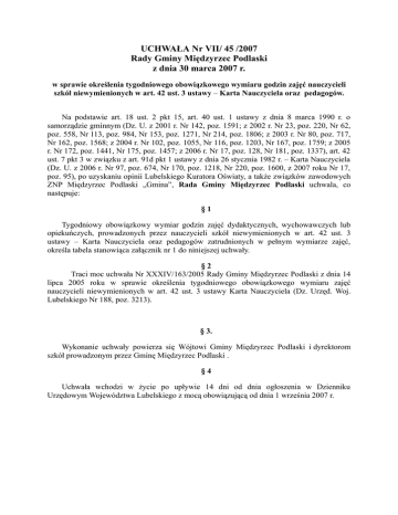 UCHWAŁA Nr VII/ 45 /2007 Rady Gminy Międzyrzec Podlaski z dnia 30 marca 2007 r. w sprawie określenia tygodniowego obowiązkowego wymiaru godzin zajęć nauczycieli szkół niewymienionych w art. 42 ust. 3 ustawy – Karta Nauczyciela oraz pedagogów. Na podstawie art. 18 ust. 2 pkt 15, art. 40 ust. 1 ustawy z dnia 8 marca 1990 r. o samorządzie gminnym (Dz. U. z 2001 r. Nr 142, poz. 1591; z 2002 r. Nr 23, poz. 220, Nr 62, poz. 558, Nr 113, poz. 984, Nr 153, poz. 1271, Nr 214, poz. 1806; z 2003 r. Nr 80, poz. 717, Nr 162, poz. 1568; z 2004 r. Nr 102, poz. 1055, Nr 116, poz. 1203, Nr 167, poz. 1759; z 2005 r. Nr 172, poz. 1441, Nr 175, poz. 1457; z 2006 r. Nr 17, poz. 128, Nr 181, poz. 1337), art. 42 ust. 7 pkt 3 w związku z art. 91d pkt 1 ustawy z dnia 26 stycznia 1982 r. – Karta Nauczyciela (Dz. U. z 2006 r. Nr 97, poz. 674, Nr 170, poz. 1218, Nr 220, poz. 1600, z 2007 roku Nr 17, poz. 95), po uzyskaniu opinii Lubelskiego Kuratora Oświaty, a także związków zawodowych ZNP Międzyrzec Podlaski „Gmina”, Rada Gminy Międzyrzec Podlaski uchwala, co następuje: §1 Tygodniowy obowiązkowy wymiar godzin zajęć dydaktycznych, wychowawczych lub opiekuńczych, prowadzonych przez nauczycieli szkół niewymienionych w art. 42 ust. 3 ustawy – Karta Nauczyciela oraz pedagogów zatrudnionych w pełnym wymiarze zajęć, określa tabela stanowiąca załącznik nr 1 do niniejszej uchwały. §2 Traci moc uchwała Nr XXXIV/163/2005 Rady Gminy Międzyrzec Podlaski z dnia 14 lipca 2005 roku w sprawie określenia tygodniowego obowiązkowego wymiaru zajęć nauczycieli niewymienionych w art. 42 ust. 3 ustawy Karta Nauczyciela (Dz. Urzęd. Woj. Lubelskiego Nr 188, poz. 3213). § 3. Wykonanie uchwały powierza się Wójtowi Gminy Międzyrzec Podlaski i dyrektorom szkół prowadzonym przez Gminę Międzyrzec Podlaski . §4 Uchwała wchodzi w życie po upływie 14 dni od dnia ogłoszenia w Dzienniku Urzędowym Województwa Lubelskiego z mocą obowiązującą od dnia 1 września 2007 r. Załącznik nr 1 do uchwały Nr VII/45/2007 Rady Gminy Międzyrzec Podlaski z dnia 30 marca 2007 r. Lp. Stanowiska Tygodniowy obowiązkowy wymiar godzin 1. Pedagodzy zatrudnieni w oddziałach przedszkolnych, szkołach i placówkach oświatowych 20