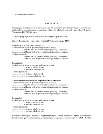 ................................................ /nazwa i adres oferenta/ druk OFERTA Nawiązując do zaproszenia do składania ofert na wykonania prac konserwacyjnych instalacji i odbiorników gazu ziemnego w zasobach własnych, administrowanych i zarządzanych przez Tomaszowskie TBS Sp. z o.o. 1. Oferujemy wykonanie zamówienia na następujących zasadach: Zasoby komunalne i stanowiące własność Tomaszowskiego TBS a/ pogotowie techniczno – naprawcze: - lokale zaopatrzone w gazowe podgrzewacze wody: ...................... zł netto za 1 m2 powierzchni użytkowej / na miesiąc .......................zł brutto za 1 m2 powierzchni użytkowej / na miesiąc - lokale pozostałe: ...................... zł netto za 1 m2 powierzchni użytkowej / na miesiąc .......................zł brutto za 1 m2 powierzchni użytkowej / na miesiąc b/ przeglądy: - lokale zaopatrzone w gazowe podgrzewacze wody: ......................zł netto za lokal / na rok ......................zł brutto za lokal / na rok - lokale pozostałe: ......................zł netto za lokal /na rok ......................zł brutto za lokal / na rok Zasoby stanowiące własność wspólnot Mieszkaniowych - lokale zaopatrzone w gazowe podgrzewacze wody: ...................... zł netto za 1 m2 powierzchni użytkowej / na miesiąc .......................zł brutto za 1 m2 powierzchni użytkowej / na miesiąc - lokale pozostałe: ...................... zł netto za 1 m2 powierzchni użytkowej / na miesiąc .......................zł brutto za 1 m2 powierzchni użytkowej / na miesiąc b/ przeglądy: - lokale zaopatrzone w gazowe podgrzewacze wody: ......................zł netto za lokal / na rok ......................zł brutto a lokal / na rok - lokale pozostałe: ......................zł netto za lokal / na rok ......................zł brutto a lokal / na rok Usuwanie doraźnych napraw i nieprzewidzianych awarii rozliczane będzie oddzielnymi kosztorysami powykonawczymi, sporządzanymi w oparciu o normy ujęte w KNR i KNSR oraz kalkulacje własne w przypadku, gdy roboty nie są ujęte w wymienionych katalogach, z zastosowaniem następujących składników cenotwórczych - stawka rg .............................................................................. - cena materiału wg faktur /do wglądu przez Zamawiającego/ - cena pracy sprzętu wg SEKOCENBUD - koszty pośrednie ................................................................... - zysk do R+S+Kp .................................................................. - koszty zakupu materiału ......................................................... 4. Oświadczam, że: - posiadam uprawnienia do wykonywania określonej działalności lub czynności, jeżeli ustawa nakłada obowiązek posiadania takich uprawnień; - posiadam niezbędną wiedzę i doświadczenie oraz dysponuję potencjałem technicznym i osobami zdolnymi do wykonania zamówienia lub przedstawię pisemne zobowiązanie innych podmiotów do udostępnienia potencjału technicznego i osób zdolnych do wykonania zamówienia; - znajduję się w sytuacji ekonomicznej i finansowej zapewniającej wykonanie zamówienia; - nie podlegam wykluczeniu z postępowania o udzielenie zamówienia. 5. Oświadczam, że na każde żądanie Zamawiającego dostarczę niezwłocznie odpowiednie dokumenty potwierdzające prawdziwość każdej kwestii zawartej w oświadczeniu. 6. Oświadczam, że zamierzam powierzyć podwykonawcom część zamówienia w zakresie: - Nazwa i adres podwykonawcy: ................................................................................................. - Zakres powierzonych prac: ...................................................................................................... .................................................... /miejscowość, data/ ................................................................... /podpis i pieczątka osoby uprawnionej/