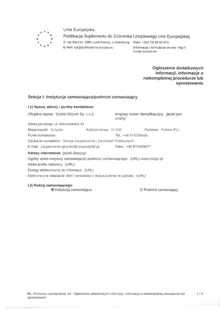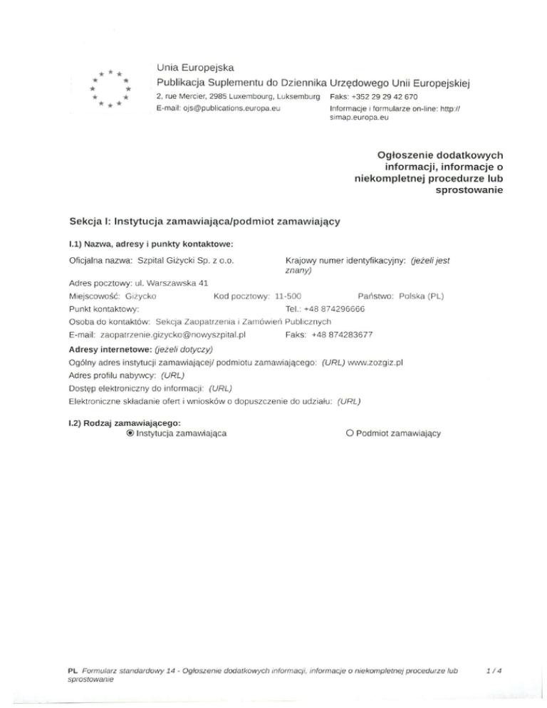Unia Europejska Publikacja Suplementu do Dziennika Urzędowego Unii Europejskiej 2, me Mercier, 2985 Luxembourg, Luksemburg Faks: +352 29 29 42 670 E-mail: [email protected] Informacje i formularze on-line: http:// simap.europa.eu Ogłoszenie dodatkowych informacji, Informacje o niekompletnej procedurze lub sprostowanie Sekcja I: Instytucja zamawiająca/podmiot zamawiający 1.1) Nazwa, adresy i punkty kontaktowe: Oficjalna nazwa: Szpital Giżycki Sp. z o.o. Krajowy numer identyfikacyjny: (jeżeli jest znany) Adres pocztowy: ul. Warszawska 41 Miejscowość: Giżycko Kod pocztowy: 11-500 Punkt kontaktowy: Państwo: Polska (PL) Tel.: +48 874296666 Osoba do kontaktów: Sekcja Zaopatrzenia i Zamówień Publicznych E-mail: [email protected] Faks: +48 874283677 Adresy internetowe: (jeżeli dotyczy) Ogólny adres instytucji zamawiającej/ podmiotu zamawiającego: (URL) www.zozgiz.pl Adres profilu nabywcy: (URL) Dostęp elektroniczny do informacji: (URL) Elektroniczne składanie ofert i wniosków o dopuszczenie do udziału: (URL) 1.2) Rodzaj zamawiającego: ® Instytucja zamawiająca O Podmiot zamawiający PL Formularz standardowy 14 - Ogłoszenie dodatkowych informacji, informacje o niekompletnej procedurze sprostowanie lub 1/4 Sekcja II: Przedmiot zamówienia 11.1.1) Nazwa nadana zamówieniu: PN/14/12/15 11.1.2) Krótki opis zamówienia lub zakupu: (podano w pienwołnym ogłoszeniu) Sukcesywna dostawa produktów leczniczych i wyrobów medycznych do Apteki Szpitala Giżyckiego sp. z o.o 11.1.3) Wspólny Słownik Zamówień (CPV) Słownik główny Główny przedmiot Słownik uzupełniający(/eże/; dotyczy) 33600000 PL Formularz standardowy 14 - Ogłoszenie dodatkowych informacji, informacje o niekompletnej procedurze sprostowanie tub 2/4 Sekcja IV: Procedura IV.l)Rodzaj procedury (podano w pierwotnym ogłoszeniu) ® Otwarta O Ograniczona O Ograniczona przyspieszona O Negocjacyjna O Negocjacyjna przyspieszona O Dialog konkurencyjny O Negocjacyjna z uprzednim ogłoszeniem O Negocjacyjna bez uprzedniego ogłoszenia O Negocjacyjna z publikacją ogłoszenia o zamówieniu O Negocjacyjna bez publikacji ogłoszenia o zamówieniu O Udzielenie zamówienia bez uprzedniej publikacji ogłoszenia o zamówieniu w Dzienniku Urzędowym Unii Europejskiej IV.2)lnformacje administracyjne IV.2.1)Numer referencyjny: (podano wpienwotnym ogłoszeniu) PN/14/12/15 IV.2.2)Dane referencyjne ogłoszenia w przypadku ogłoszeń przesłanych drogą elektroniczną: Pierwotne ogłoszenie przesłane przez ® eNotices O TED eSender Login: ENOTICES_Gizyckoll500 Dane referencyjne ogłoszenia: 2015-164663 rok i numer dokumentu IV.2.3)Ogłoszenie, którego dotyczy niniejsza publikacja: Numer ogłoszenia w Dz.U.: 2015/S 241-436991 z dnia: 12/12/2015 (dd/mm/rrrr) IV.2.4)Data wysłania pierwotnego ogłoszenia: 09/12/2015 (dd/mm/rrrr) PL Formularz standardowy 14 - Ogłoszenie dodatkowych informacji, informacje o niekompletnej procedurze sprostowanie lub 3/4 Sekcja VI: Informacje uzupełniające VI.1) Ogłoszenie dotyczy: • Procedury niepełnej KI Sprostowania • Informacji dodatkowych Vl.2) Informacje na temat niepełnej procedury udzielenia zamówienia: O Postępowanie o udzielenie zamówienia zostało przerwane O Postępowanie o udzielenie zamówienia uznano za nieskuteczne O Zamówienia nie udzielono • Zamówienie może być przedmiotem ponownej publikacji Vl.3) Informacje do poprawienia lub dodania : Vl.3.1) ® Zmiana oryginalnej informacji podanej przez instytucję zamawiającą O Publikacja w witrynie TED niezgodna z oryginalną informacją, przekazaną przez instytucję zamawiającą O Oba przypadki Vl.3.2) ® W ogłoszeniu pierwotnym O W odpowiedniej dokumentacji przetargowej (więcej informacji w odpowiedniej dokumentacji O W obu przypadkach (więcej informacji w odpowiedniej dokumentacji przetargowej) przetargowej) Vl.3.3) Tekst, który należy poprawić w pierwotnym ogłoszeniu Miejsce, w którym znajduje się Zamiast: zmieniany tekst: Termin składania ofert lub wniosków Sekcja IV: Procedura IV.3.4) o dopuszczenie do udziału w postępowaniu: 21.01.2016-12:00 Powinno być: Termin składania ofert lub wniosków o dopuszczenie do udziału w postępowaniu: 25.01.2016-12:00 Vl.3.4) Daty, które należy poprawić Miejsce, w którym znajdują się zmieniane daty: Sekcja IV: Procedura IV.3.8) Powinno być: 25/01/2016 Godzina: 12:30 (dd/mm/rrrr) w pierwotnym ogłoszeniu Zamiast: 21/01/2016 Godzina: 12:30 (dd/mm/rrrr) Vl.3.5) Adresy i punkty kontaktowe, które należy poprawić Vl.3.6) Tekst, który należy dodać do pierwotnego ogłoszenia Miejsce, w którym należy dodać tekst: Tekst do dodania: Vl.4) Inne dodatkowe informacje: Vl.5) Data wysłania niniejszego ogłoszenia: 19/01/2016 (dd/mm/rrrr) - ID:2016-007259 PL Formularz standardowy 14 - Ogłoszenie dodatkowych informacji, informacje o niekompletnej procedurze lub sprostowanie 4/4