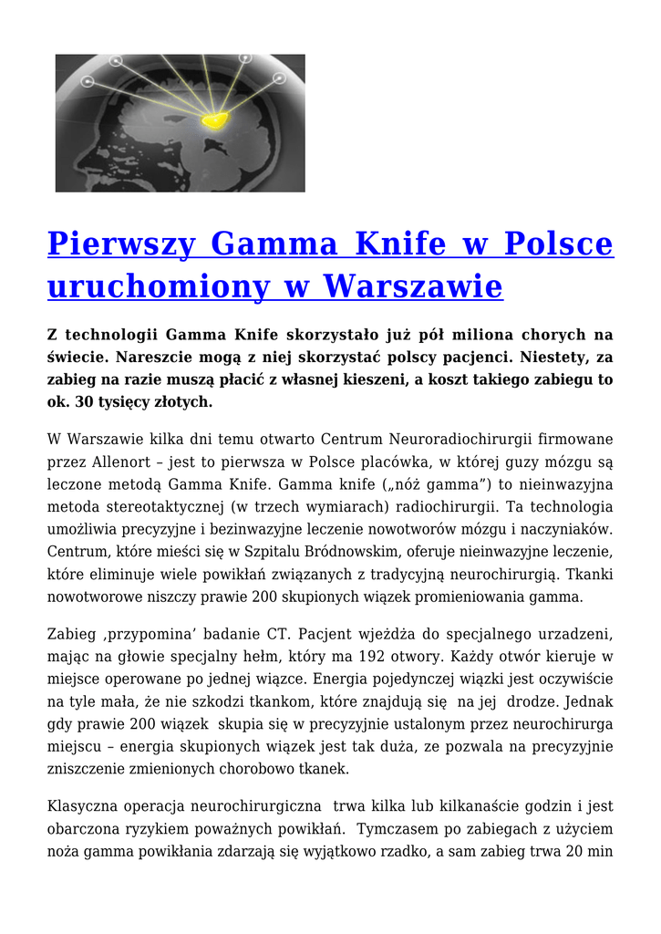 Pierwszy Gamma Knife w Polsce uruchomiony w Warszawie Z technologii Gamma Knife skorzystało już pół miliona chorych na świecie. Nareszcie mogą z niej skorzystać polscy pacjenci. Niestety, za zabieg na razie muszą płacić z własnej kieszeni, a koszt takiego zabiegu to ok. 30 tysięcy złotych. W Warszawie kilka dni temu otwarto Centrum Neuroradiochirurgii firmowane przez Allenort – jest to pierwsza w Polsce placówka, w której guzy mózgu są leczone metodą Gamma Knife. Gamma knife („nóż gamma”) to nieinwazyjna metoda stereotaktycznej (w trzech wymiarach) radiochirurgii. Ta technologia umożliwia precyzyjne i bezinwazyjne leczenie nowotworów mózgu i naczyniaków. Centrum, które mieści się w Szpitalu Bródnowskim, oferuje nieinwazyjne leczenie, które eliminuje wiele powikłań związanych z tradycyjną neurochirurgią. Tkanki nowotworowe niszczy prawie 200 skupionych wiązek promieniowania gamma. Zabieg ‚przypomina’ badanie CT. Pacjent wjeżdża do specjalnego urzadzeni, mając na głowie specjalny hełm, który ma 192 otwory. Każdy otwór kieruje w miejsce operowane po jednej wiązce. Energia pojedynczej wiązki jest oczywiście na tyle mała, że nie szkodzi tkankom, które znajdują się na jej drodze. Jednak gdy prawie 200 wiązek skupia się w precyzyjnie ustalonym przez neurochirurga miejscu – energia skupionych wiązek jest tak duża, ze pozwala na precyzyjnie zniszczenie zmienionych chorobowo tkanek. Klasyczna operacja neurochirurgiczna trwa kilka lub kilkanaście godzin i jest obarczona ryzykiem poważnych powikłań. Tymczasem po zabiegach z użyciem noża gamma powikłania zdarzają się wyjątkowo rzadko, a sam zabieg trwa 20 min – do dwóch godzin. Za pomocą tej techniki podejmuje się próby usuwania guzów do 3.5cm średnicy. Nóż gamma stosuje się do niszczenia naczyniaków, nowotworów złośliwych takich glejaki i jest podstawową technika na świecie w eliminowaniu guzów łagodnych, takich jak nerwiaki nerwu słuchowego – śmiertelnie niebezpieczne dla pacjentów, których wycięcie jest obarczone poważnymi powikłaniami. Zabieg trwa krótko i jest bezbolesny. W czasie naświetlania pacjent słucha muzyki. Pacjent prawie natychmiast wraca do normalnego życia, gdyż nie dochodzi oczywiście do uszkodzenia czaszki. Zobacz jak działa Gamma http://www.gammaknife.org/lgk_patients_stream.wmv Knife: Gamma Knife nareszcie w Polsce „To jest doskonały sprzęt, w doskonałych rękach fachowców tutejszego szpitala” – powiedziała obecna na otwarciu placówki małżonka prezydenta RP, Anna Komorowska. Koszt jednego zabiegu jest horrendalny, ale grupa Allenort, która sprowadziła urządzenie do Polski, stara się, by zabiegi Gamma Knife były finansowane przez NFZ. Jak poinformował PAP, przygotowana jest już procedura finansowania zabiegów i trwają rozmowy z NFZ, choć obecny na inauguracji wiceminister zdrowia Marek Twardowski nie potwierdził, że finansowanie zabiegów Gamma Knife przez państwo Edzie na pewno możliwe. Na razie trwają negocjacje. Data publikacji: 24.11.2010r.