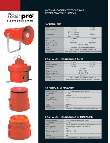 SYGNALIZATORY W WYKONANIU PRZECIWWYBUCHOWYM SYRENA DB3 Model Zakres napięcia 24 VDC 230 VAC 12-48 VDC 230 VAC 12 VDC: 760 mA / Pobór prądu 24 VDC: 380 mA / 65 mA 48 VDC:190 mA Moc 118 dB(A) Tony sygnałów Stopień ochrony 27 IP66 / IP67 IP66 / IP67 Zakres temperatur -55°C do +70°C Kolor czerwony, inne kolory na zamówienie Materiał Dopuszczenia 118 dB(A) 27 TWS, odporne na działanie promieni UV różne dopuszczenia dla obszarów zagrożonych wybuchem LAMPA OSTRZEGAWCZA XB11 Model 24 VDC 230 VAC Zakres napięcia 24 VDC 230 VAC Pobór prądu 320 mA Moc Stopień ochrony IP66 / IP67 Zakres temperatur -55°C do +70°C Kolor czerwony Materiał Dopuszczenia 60 mA 5 J / 1 Hz TWS, odporne na działanie promieni UV różne dopuszczenia dla obszarów zagrożonych wybuchem SYRENA IS-MINIALARM Zakres napięcia 16-28 VDC przez barierę lub izolator Pobór prądu 25 mA Moc 100 dB(A) / 1 m Tony sygnałów 49 tonów alarmowych / 3 stopnie alarmu Stopień ochrony IP65 Zakres temperatur -40°C do +60°C Kolor czerwony Materiał ABS Dopuszczenia różne dopuszczenia dla obszarów zagrożonych wybuchem, VDS LAMPA OSTRZEGAWCZA IS-MINIALITE Zakres napięcia 16-28 VDC przez barierę lub izolator Pobór prądu 25 mA Moc soczewka pryzmatyczna, zapewniająca optymalną efektywność diod LED Tony sygnałów podwójny błysk o częst. 2 Hz lub 1 Hz Stopień ochrony IP65 Zakres temperatur -40°C do +60°C Kolor Obudowa: czerwona/soczewka: czerwona, pomarańczowa, niebieska, zielona, przezroczysta Materiał ABS Dopuszczenia różne dopuszczenia dla obszarów zagrożonych wybuchem SYGNALIZATOR OPTYCZNO AKUSTYCZNY IS-MINIALERT Zakres napięcia 16-28 VDC przez barierę lub izolator Pobór prądu 30 mA Moc 100 dB(A) / 1 m Tony sygnałów 49 tonów alarmowych, 3 stopnie alarmu / podwójny błysk o częst. 2Hz lub 1Hz Stopień ochrony IP65 Zakres temperatur -40°C do +60°C Kolor Obudowa: czerwona / soczewka: czerwona, pomarańczowa, niebieska, zielona, przezroczysta Materiał ABS Dopuszczenia różne dopuszczenia dla obszarów zagrożonych wybuchem SYRENA BEXDS120D Zakres napięcia 12 VDC; 24 VDC; 48 VDC; 115 VAC; 230 VAC Pobór prądu 90-850 mA (zależnie od napięcia) Moc 123 dB(A) / 1 m Tony sygnałów 32 tony alarmowe, 3 zewnętrznie wybierane stopnie Stopień ochrony IP67 Zakres temperatur zależny od wersji Kolor czerwony/czarny Materiał bezmiedziowe aluminium LM6, ABS Dopuszczenia różne dopuszczenia dla obszarów zagrożonych wybuchem SYGNALIZATOR OPTYCZNO AKUSTYCZNY BEXDCS110-05D Zakres napięcia 12 VDC; 24 VDC; 48 VDC; 115 VAC; 230 VAC Pobór prądu dźwięk: 56-195 mA / błysk: 55-750 mA (zależnie od napięcia) Moc 117 dB(A) / 1 m / 5 J przy 1 Hz Tony sygnałów 32 tony alarmowe, 3 zewnętrznie wybierane stopnie Stopień ochrony IP66 Zakres temperatur -50°C do +55°C Kolor Obudowa: czerwona / soczewka: czerwona, pomarańczowa, niebieska, zielona, przezroczysta Materiał bezmiedziowe aluminium LM6, ABS Dopuszczenia różne dopuszczenia dla obszarów zagrożonych wybuchem LAMPA SYGNALIZACYJNA BEXBG05D Zakres napięcia 12 VDC; 24 VDC; 48 VDC; 115 VAC; 230 VAC Pobór prądu 55-750 mA (zależnie od napięcia) Moc 5 J / 1 Hz Tony sygnałów - Stopień ochrony IP67 Zakres temperatur zależny od wersji Kolor Obudowa: czerwona / soczewka: czerwona, pomarańczowa, niebieska, zielona, przezroczysta Materiał bezmiedziowe aluminium LM6, szklana soczewka, stal nierdzewna Dopuszczenia różne dopuszczenia dla obszarów zagrożonych wybuchem Wymienione wyżej modele przedstawiają jedynie niewielki przegląd naszych produktów dopuszczonych do użytku w obszarach zagrożonych wybuchem. Z przyjemnością zaprezentujemy Państwu przegląd pełnego asortymentu naszych produktów. Compro Electronic GmbH I Beim Alten Flugplatz 3 I D-49377 Vechta Tel.+ 49 (0)4441/89112-50 I Faks + 49 (0)4441/89112-55 [email protected] I www.compro.de