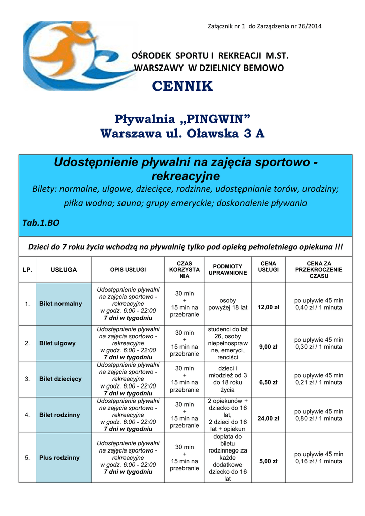 Załącznik nr 1 do Zarządzenia nr 26/2014 OŚRODEK SPORTU I REKREACJI M.ST. WARSZAWY W DZIELNICY BEMOWO CENNIK Pływalnia „PINGWIN” Warszawa ul. Oławska 3 A Udostępnienie pływalni na zajęcia sportowo rekreacyjne Bilety: normalne, ulgowe, dziecięce, rodzinne, udostępnianie torów, urodziny; piłka wodna; sauna; grupy emeryckie; doskonalenie pływania Tab.1.BO Dzieci do 7 roku życia wchodzą na pływalnię tylko pod opieką pełnoletniego opiekuna !!! LP. 1. 2. 3. 4. 5. USŁUGA Bilet normalny Bilet ulgowy Bilet dziecięcy Bilet rodzinny Plus rodzinny OPIS USŁUGI CZAS KORZYSTA NIA PODMIOTY UPRAWNIONE Udostępnienie pływalni na zajęcia sportowo rekreacyjne w godz. 6:00 - 22:00 7 dni w tygodniu 30 min + 15 min na przebranie osoby powyżej 18 lat 30 min + 15 min na przebranie studenci do lat 26, osoby niepełnospraw ne, emeryci, renciści 30 min + 15 min na przebranie dzieci i młodzież od 3 do 18 roku życia Udostępnienie pływalni na zajęcia sportowo rekreacyjne w godz. 6:00 - 22:00 7 dni w tygodniu Udostępnienie pływalni na zajęcia sportowo rekreacyjne w godz. 6:00 - 22:00 7 dni w tygodniu Udostępnienie pływalni na zajęcia sportowo rekreacyjne w godz. 6:00 - 22:00 7 dni w tygodniu Udostępnienie pływalni na zajęcia sportowo rekreacyjne w godz. 6:00 - 22:00 7 dni w tygodniu 30 min + 15 min na przebranie 30 min + 15 min na przebranie 2 opiekunów + dziecko do 16 lat, 2 dzieci do 16 lat + opiekun dopłata do biletu rodzinnego za każde dodatkowe dziecko do 16 lat CENA USŁUGI CENA ZA PRZEKROCZENIE CZASU 12,00 zł po upływie 45 min 0,40 zł / 1 minuta 9,00 zł po upływie 45 min 0,30 zł / 1 minuta 6,50 zł po upływie 45 min 0,21 zł / 1 minuta 24,00 zł po upływie 45 min 0,80 zł / 1 minuta 5,00 zł po upływie 45 min 0,16 zł / 1 minuta 6. Zwolnieni z opłat 7. Udostępnienie 1 toru 8. Udostępnienie 6 torów 9. Mały basen Rekreacyjny część główna 10. Udostępnienie Całego basenu 11. Urodziny 12. Urodziny z dodatkowym instruktorem 13. Sauna fińska 14. Zajęcia sportoworekreacyjne z instruktorem dla grup emeryckich Udostępnienie pływalni na zajęcia sportowo rekreacyjne w godz. 6:00 - 22:00 7 dni w tygodniu Udostępnienie 1 toru pływalni na zajęcia sportowo - rekreacyjne na wyłączność (max. 8 osób) w godz. 6:00 - 22:00 7 dni w tygodniu Udostępnienie 6 torów pływalni na zajęcia sportowo - rekreacyjne na wyłączność (max. 8 osób na torze) w godz. 6:00 - 22:00 7 dni w tygodniu Udostępnienie części głównej Małego basenu na zajęcia sportowo - rekreacyjne na wyłączność (max. 20 osób w obrębie niecki) w godz. 6:00 - 22:00 7 dni w tygodniu 30 min + 15 min na przebranie opiekun osoby niepełnospraw nej z I-szą grupą, dzieci do 3 roku życia 30 min osoby indywidualne 30 min osoby indywidualne 30 min osoby indywidualne --- 62,00 zł 334,00 zł 102,00 zł --- 62 zł rozpoczęte kolejne 30 min 334 zł rozpoczęte kolejne 30min 102 zł rozpoczęte kolejne 30 minut Udostępnienie Całego basenu wraz ze zjeżdżalnią i jacuzzi na zajęcia sportowo rekreacyjne na wyłączność (max. 90 osób) w godz. 6:00 - 22:00 7 dni w tygodniu Udostępnienie Małego basenu na gry i zabawy pod opieką instruktora, max. 15 osób Udostępnienie Małego basenu na gry i zabawy pod opieką 2 instruktorów max. 25 osób Wejście do sauny fińskiej od osoby: w godz. 6:00 – 22:00 7 dni w tygodniu 30 min osoby indywidualne 415,00 zł 60 min osoby indywidualne 160,00 zł bez możliwości przedłużenia 60 min osoby indywidualne 240,00 zł bez możliwości przedłużenia 1 min osoby powyżej 18 lat 0,50 zł Udostępnienie pływalni na zajęcia sportoworekreacyjne (30 minut pływania, 30 min. korzystanie z atrakcji) 60 min + 20 min. na przebranie grupy emeryckie (1 grupa 15 osobowa) 145,80 zł 415 zł rozpoczęte kolejne 30 minut --- po upływie 80 min 0,30 zł / 1 minuta Firmy, Stowarzyszenia Kultury Fizycznej (fundacje, stowarzyszenia, UKS, MKS) działające w zakresie nauki i współzawodnictwa sportowego dzieci i młodzieży Tab. 2.BO Dzieci do 7 roku życia wchodzą na pływalnię tylko pod opieką pełnoletniego opiekuna !!! LP. 1. 2. OPIS USŁUGI CZAS KORZYSTA NIA PODMIOTY UPRAWNIONE Udostępnienie 1 toru Udostępnienie 1 toru pływalni na zajęcia sportowo rekreacyjne na wyłączność (max. 8 osób) w godz. 6:00-22:00 7 dni w tygodniu 30 min firmy 57,41 zł netto 57,41 zł netto rozpoczęte kolejne 30 min Udostępnienie 1 toru Udostępnienie 1 toru pływalni na zajęcia sportowo rekreacyjne na wyłączność (max. 8 osób) w godz. 6:00 -22:00 7 dni w tygodniu 30 min Stowarzyszenia Kultury Fizycznej (fundacje, stowarzyszenia, uks-y, sp. z o.o.) działające w zakresie nauki i współzawodnictwa sportowego dzieci i młodzieży 43,06 zł netto 57,41 zł netto rozpoczęte kolejne 30 min 30 min Stowarzyszenia Kultury Fizycznej (fundacje, stowarzyszenia, uks-y, sp. z o.o.) działające w zakresie nauki i współzawodnictwa sportowego dzieci i młodzieży 29,00 zł netto 57,41 zł netto rozpoczęte kolejne 30 min 30 min firmy 309,26 zł netto 309,26 zł ropoczęte kolejne 30min 30 min Stowarzyszenia Kultury Fizycznej (fundacje, stowarzyszenia, uks-y, sp. z o.o.) działające w zakresie nauki i współzawodnictwa sportowego dzieci i młodzieży 231,95 zł netto 231,95 zł ropoczęte kolejne 30min USŁUGA 3. Udostępnienie 1 toru 4. Udostępnienie 6 torów 5. Udostępnienie 6 torów Udostępnienie 1 toru pływalni na zajęcia sportowo rekreacyjne na wyłączność (max. 8 osób) powyżej 100 jednostek tygodniowo (jednostka = 30 minut zajęć) Udostępnienie 6 torów pływalni na zajęcia sportowo rekreacyjne na wyłączność (max. 8 osób na torze) w godz. 6:00 -22:00 7 dni w tygodniu Udostępnienie 6 torów pływalni na zajęcia sportowo rekreacyjne na wyłączność (max. 8 osób na torze) w godz. 6:00 -22:00 7 dni w tygodniu CENA USŁUGI CENA ZA PRZEKROCZENIE CZASU 6. Mały basen Rekreacyjny część główna 7. Mały basen Rekreacyjny część główna 8. Udo