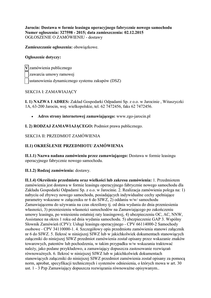 Jarocin: Dostawa w formie leasingu operacyjnego fabrycznie nowego samochodu Numer ogłoszenia: 327598 - 2015; data zamieszczenia: 02.12.2015 OGŁOSZENIE O ZAMÓWIENIU - dostawy Zamieszczanie ogłoszenia: obowiązkowe. Ogłoszenie dotyczy: V zamówienia publicznego zawarcia umowy ramowej ustanowienia dynamicznego systemu zakupów (DSZ) SEKCJA I: ZAMAWIAJĄCY I. 1) NAZWA I ADRES: Zakład Gospodarki Odpadami Sp. z o.o. w Jarocinie , Witaszyczki 1A, 63-200 Jarocin, woj. wielkopolskie, tel. 62 7472456, faks 62 7472456. Adres strony internetowej zamawiającego: www.zgo-jarocin.pl I. 2) RODZAJ ZAMAWIAJĄCEGO: Podmiot prawa publicznego. SEKCJA II: PRZEDMIOT ZAMÓWIENIA II.1) OKREŚLENIE PRZEDMIOTU ZAMÓWIENIA II.1.1) Nazwa nadana zamówieniu przez zamawiającego: Dostawa w formie leasingu operacyjnego fabrycznie nowego samochodu. II.1.2) Rodzaj zamówienia: dostawy. II.1.4) Określenie przedmiotu oraz wielkości lub zakresu zamówienia: 1. Przedmiotem zamówienia jest dostawa w formie leasingu operacyjnego fabrycznie nowego samochodu dla Zakładu Gospodarki Odpadami Sp. z o.o. w Jarocinie. 2. Realizacja zamówienia polega na: 1) nabyciu od zbywcy nowego samochodu, posiadających indywidualne cechy spełniające parametry wskazane w załączniku nr 6 do SIWZ, 2) oddaniu w/w/ samochodu Zamawiającemu do używania na czas określony tj. od dnia wydania do dnia przeniesienia własności, 3) przeniesieniu własności samochodów na Zamawiającego po zakończeniu umowy leasingu, po wniesieniu ostatniej raty leasingowej, 4) ubezpieczeniu OC, AC, NNW, Assistance na okres 1 roku od dnia wydania samochodu. 5) ubezpieczenie GAP 3. Wspólny Słownik Zamówień (CPV): Usługi leasingu operacyjnego - CPV 66114000-2 Samochody osobowe - CPV 34110000-1. 4. Szczegółowy opis przedmiotu zamówienia stanowi załącznik nr 6 do SIWZ. 5. Ilekroć w niniejszej SIWZ lub w jakichkolwiek dokumentach stanowiących załączniki do niniejszej SIWZ przedmiot zamówienia został opisany przez wskazanie znaków towarowych, patentów lub pochodzenia, w takim przypadku w/w wskazania traktować należy, jako podane przykładowo, a zamawiający dopuszcza zastosowanie rozwiązań równoważnych. 6. Ilekroć w niniejszej SIWZ lub w jakichkolwiek dokumentach stanowiących załączniki do niniejszej SIWZ przedmiot zamówienia został opisany za pomocą norm, aprobat, specyfikacji technicznych i systemów odniesienia, o których mowa w art. 30 ust. 1 - 3 Pzp Zamawiający dopuszcza rozwiązania równoważne opisywanym.. II.1.5) przewiduje się udzielenie zamówień uzupełniających Określenie przedmiotu oraz wielkości lub zakresu zamówień uzupełniających II.1.6) Wspólny Słownik Zamówień (CPV): 66.11.40.00-2, 34.11.00.00-1. II.1.7) Czy dopuszcza się złożenie oferty częściowej: nie. II.1.8) Czy dopuszcza się złożenie oferty wariantowej: nie. II.2) CZAS TRWANIA ZAMÓWIENIA LUB TERMIN WYKONANIA: Zakończenie: 30.12.2015. SEKCJA III: INFORMACJE O CHARAKTERZE PRAWNYM, EKONOMICZNYM, FINANSOWYM I TECHNICZNYM III.1) WADIUM Informacja na temat wadium: Zamawiający nie wymaga wpłaty wadium III.2) ZALICZKI III.3) WARUNKI UDZIAŁU W POSTĘPOWANIU ORAZ OPIS SPOSOBU DOKONYWANIA OCENY SPEŁNIANIA TYCH WARUNKÓW III. 3.1) Uprawnienia do wykonywania określonej działalności lub czynności, jeżeli przepisy prawa nakładają obowiązek ich posiadania Opis sposobu dokonywania oceny spełniania tego warunku Zamawiający odstępuje od opisu sposobu dokonywania oceny spełniania w/w warunku. III.3.2) Wiedza i doświadczenie o Opis sposobu dokonywania oceny spełniania tego warunku Zamawiający uzna spełnienie przez Wykonawcę przedmiotowego warunku, jeżeli Wykonawca wykaże, że w ciągu ostatnich trzech lat przed upływem terminu składania ofert, a jeżeli okres prowadzenia działalności jest krótszy w tym okresie wykonał co najmniej 1 dostawę samochodu w formie leasingu operacyjnego o wartości nie mniejszej niż 100.000,00 zł brutto. III.3.3) Potencjał techniczny o Opis sposobu dokonywania oceny spełniania tego warunku Zamawiający odstępuje od opisu sposobu dokonywania oceny spełniania w/w warunku. III.3.4) Osoby zdolne do wykonania zamówienia o Opis sposobu dokonywania oceny spełniania tego warunku Zamawiający odstępuje od opisu sposobu dokonywania oceny spełniania w/w warunku. III.3.5) Sytuacja ekonomiczna i finansowa o Opis sposobu dokonywania oceny spełniania tego warunku o Zamawiający odstępuje od opisu sposobu dokonywania oceny spełniania w/w warunku. III.4) INFORMACJA O OŚWIADCZENIACH LUB DOKUMENTACH, JAKIE MAJĄ DOSTARCZYĆ WYKONAWCY W CELU POTWIERDZENIA SPEŁNIANIA WARUNKÓW UDZIAŁU W POSTĘPOWANIU ORAZ NIEPODLEGANIA WYKLUCZENIU NA PODSTAWIE ART. 24 UST. 1 USTAWY III.4.1) W zakresie wykazania spełniania przez wykonawcę warunków, o których mowa w art. 22 ust. 1 ustawy, oprócz oświadczenia o spełnianiu warunków udziału w postępowaniu należy przedłożyć: wykaz wykonanych, a w przypadku świadczeń okresowych lub ciągłych również wykonywanych, głównych dostaw lub usług, w okresie ostatnich trzech lat przed upływem terminu składania ofert albo wniosków o dopuszczenie do udziału w postępowaniu, a jeżeli okres prowadzenia działalności jest krótszy - w tym okresie, wraz z podaniem ich wartości, przedmiotu, dat wykonania i podmiotów, na rzecz których dostawy lub usługi zostały wykonane, oraz załączeniem dowodów, czy zostały wykonane lub są wykonywane należycie; określenie dostaw lub usług, których dotyczy obowiązek wskazania przez wykonawcę w wykazie lub złożenia poświadczeń, w tym informacja o dostawach lub usługach niewykonanych lub wykonanych nienależycie Za wykonane główne dostawy, o których mowa powyżej Zamawiający uważa dostawy, o których mowa w dziale V pkt. 1 ppkt. 2 niniejszej SIWZ; III.4.2) W zakresie potwierdzenia niepodlegania wykluczeniu na podstawie art. 24 ust. 1 ustawy, należy przedłożyć: oświadczenie o braku podstaw do wykluczenia;