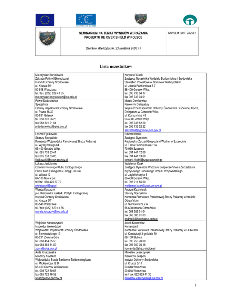 SEMINARIUM NA TEMAT WYNIKÓW WDRAŻANIA PROJEKTU UE RIVER SHIELD W POLSCE RS//SEM.3/INF.2/Add.1 (Gorzów Wielkopolski, 23 kwietnia 2008 r.) Lista uczestników Mieczysław Borysiewicz Zakładu Polityki Ekologicznej Instytut Ochrony Środowiska ul. Krucza 5/11 00-548 Warszawa tel./ fax: (022) 629 41 35 [email protected] Paweł Dadasiewicz Specjalista Główny Inspektorat Ochrony Środowiska ul. Piwna 36/39 80-831 Gdańsk tel. 058 301 06 25 fax 058 301 21 54 [email protected] Leszek Fijałkowski Starszy Specjalista Komenda Wojewódzka Państwowej Straży Pożarnej ul. Wyszyńskiego 64 66-400 Gorzów Wlkp. tel. 095 733 83 41 fax 095 733 83 05 [email protected] Łukasz Jasiulaniec Członek Polskiego Klubu Ekologicznego Polski Klub Ekologiczny Okręg Lubuski ul. Witosa 12 67-100 Nowa Sól tel/fax: 068 470 27 72 [email protected] Wanda Kacprzyk p.o. Kierownika Zakładu Polityki Ekologicznej Instytut Ochrony Środowiska ul. Krucza 5/11 00-548 Warszawa tel./ fax: (022) 629 41 35 [email protected] Wojciech Konopczyński Inspektor Wojewódzki Wojewódzki Inspektorat Ochrony Środowiska ul. Siemiradzkiego 19 65-231 Zielona Góra tel. 068 454 85 50 fax 068 454 84 59 [email protected] Anita Kruszewska Młodszy Asystent Wojewódzka Stacja Sanitarno-Epidemiologiczna ul. Mickiewicza 12 B 66-400 Gorzów Wielkopolski tel. 095 722 60 57 fax 095 722 46 52 [email protected] Krzysztof Cisek Zastępca Naczelnika Wydziału Budownictwa i Środowiska Starostwo Powiatowe w Gorzowie Wielkopolskim ul. Józefa Pankiewicza 5-7 66-400 Gorzów Wlkp. tel. 095 733 04 17 fax 095 733 04 01 Marek Demidowicz Kierownik Delegatury Wojewódzki Inspektorat Ochrony Środowiska w Zielonej Górze, Delegatura w Gorzowie Wlkp. ul. Kostrzyńska 48 66-400 Gorzów Wlkp. tel. 095 735 52 20 fax 095 735 52 22 [email protected] Edward Hładki Zastępca Dyrektora Regionalny Zarząd Gospodarki Wodnej w Szczecinie ul. Tama Pomorzańska 13A 70-030 Szczecin tel. 091 441 12 00 fax 091 441 13 00 [email protected] Waldemar Kaak Zastępca Dyrektora Wydziału Bezpieczeństwa i Zarządzania Kryzysowego Lubuskiego Urzędu Wojewódzkiego ul. Jagiellończyka 8 66-400 Gorzów Wlkp. tel. 095 711 55 50 [email protected] Andrzej Kaźmierak Starszy Specjalista Komenda Powiatowa Państwowej Straży Pożarnej w Krośnie Odrzańskim ul. Sienkiewicza 2 A 66-600 Krosno Odrzańskie tel. 068 383 01 04 fax 068 383 01 03 [email protected] Jacek Konsewicz Komendant Komenda Powiatowa Państwowej Straży Pożarnej w Słubicach ul. Konstytucji 3-go Maja 79 69-100 Słubice tel. 095 750 76 00 fax 095 750 76 19 [email protected] Mirosław Leszczyński Kierownik Zespołu Instytut Ochrony Środowiska ul. Krucza 5/11 00-548 Warszawa 00-548 Warszawa tel./ fax: 022 629 41 35 mirosł[email protected] 1 Zbigniew Liberek Zastępca Dyrektora ds. Technicznych Zielonogórskie Wodociągi i Kanalizacja Sp. z o.o. ul. Zjednoczenia 110 A 62-120 Zielona Góra tel. 068 451 93 00 fax 068 451 93 38 [email protected] Dawid Marciniak Młodszy Asystent Wojewódzka Stacja Sanitarno-Epidemiologiczna ul. Mickiewicza 12 B 66-400 Gorzów Wielkopolski tel. 095 722 60 57 fax 095 722 46 52 [email protected] Tadeusz Ostrowski Zastępca Komendanta Powiatowego PSP Komenda Powiatowa Państwowej Straży Pożarnej w Nowej Soli ul. Gen. Grota-Roweckiego 11/13 67-100 Nowa Sól tel. 068 455 77 02 fax 068 455 77 05 [email protected] Stanisław Piórkowski Komendant Placówka Straży Granicznej w Kostrzynie nad Odrą ul. Graniczna 1 66-470 Kostrzyń nad Odrą tel. 095 733 95 02 fax 095 733 95 05 [email protected] Wojciech Romaniuk Kierownik Obiektu STG PERN „Przyjażń” S.A. – Stacja Pomp nr 6 w Łupowie ul. Wyszogrodzka 133 09-410 Płock tel. 608 500 785 fax 095 751 02 94 [email protected] Urszula Sobczyńska Główny specjalista Starostwo Powiatowe w Strzelcach Krajeńskich ul. Wyszyńskiego 7 66-500 Strzelce Krajeńskie tel. 095 763 70 20 fax 095 763 11 26 Ryszard Stefaniak Kierownik Referatu Urząd Miasta Gorzowa Wielkopolskiego ul. Sikorskiego 3-4 66-400 Gorzów Wielkopolski tel. 095 733 55 56 fax 095 733 56 83 [email protected] Dorota Śliwińska Naczelnik Biura Zarządzania Kryzysowego Starostwo Powiatowe w Gorzowie Wielkopolskim ul. Józefa Pankiewicza 5-7 66-400 Gorzów Wlkp. tel. 095 733 04 13 fax 095 733 04 01 Stanisław Trocki Zastępca Dowódcy JRG Komenda Powiatowa Państwowej Straży Pożarnej w Krośnie Odrzańskim ul. Sienkiewicza 2 66-600 Krosno Odrzańskie tel. 607 592 827 fax 068 383 01 03 [email protected] Dariusz Łoś Komendant Komenda Powiatowa Państwowej Straży Pożarnej ul. Serbska 58 68-200 Żary tel. 068 363 07 01 fax 068 363 07 08 [email protected] Grażyna Marko Starszy Inspektor Wojewódzki Lubuski Urząd Wojewódzki u. Jagiellończyka 8 66-400 Gorzów Wlkp. tel. 095 711 53 44 fax 095 711 55 24 [email protected] Tomasz Parada Starszy Inspektor WIOŚ Delegatura w Gorzowie Wlkp. ul. Kostrzyńska 48 66-400 Gorzów Wlkp. tel. 095 735 52 20 fax 095 735 52 22 [email protected] Mariusz Przysiecki Naczelnik Wydziału Kontrolno - Rozpoznawczego Komenda Wojewódzka Państwowej Straży Pożarnej ul. Wyszyńskiego 64 66-400 Gorzów Wlkp. tel. 095 733 83 40 fax 095 733 83 05 [email protected] Anna Romańczak Sekretariat Naukowo-Techniczny Instytut Ochrony Środowiska ul. Krucza 5/11 00-548 Warszawa tel. 022 622 43 81 fax 022 629 52 63 [email protected] Maria Staroń Kierownik Działu Inspekcji Wojewódzki Inspektorat Ochrony Środowiska Delegatura w Gorzowie Wlkp. ul. Kostrzyńska 48 66-400 Gorzów Wlkp. tel. 095 735 52 20 fax 095 735 52 22 Dagmara Szalc Asystent Wojewódzka Stacja Sanitarno-Epidemiologiczna ul. Mickiewicza 12 B 66-400 Gorzów Wielkopolski tel. 095 722 60 57 fax 095 722 46 52 [email protected] Jarosław Śliwiński Dyrektor Wydziału Bezpieczeństwa i Zarządzania Kryzysowego Lubuskiego Urzędu Wojewódzkiego ul. Jagiellończyka 8 66-400 Gorzów Wlkp. tel. 095 711 55 50 [email protected] Janusz Tylzon Wojewódzki Inspektorat Ochrony Środowiska ul. Siemiradzkiego 19 65-231 Z