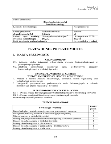Załącznik nr 1 do procedury nr W_PR_12 Nazwa przedmiotu: Biotechnologia żywności Food biotechnology Kierunek: biotechnologia Kod przedmiotu: Rodzaj przedmiotu: Poziom kształcenia: obieralny, moduł 5.2 I stopnia Rodzaj zajęć: wykłady, Liczba godzin/tydzień/zjazd* ćwiczenia laboratoryjne 2W, 2L Profil kształcenia: ogólnoakademicki Semestr: VI Liczba punktów ECTS: 4 ECTS Język wykładowy: polski PRZEWODNIK PO PRZEDMIOCIE I. KARTA PRZEDMIOTU CEL PRZEDMIOTU C.1. Zdobycie wiedzy dotyczącej wykorzystania procesów biotechnologicznych w przemyśle spożywczym. C.2. Zdobycie umiejętności ilościowego opisu podstawowych procesów biotechnologicznych w produkcji żywności. WYMAGANIA WSTĘPNE W ZAKRESIE WIEDZY, UMIEJĘTNOŚCI I INNYCH KOMPETENCJI 1. Wiedza z zakresu podstaw mikrobiologii, biochemii, chemii organicznej oraz biotechnologii przemysłowej. 2. Umiejętność przeprowadzania podstawowych analiz laboratoryjnych w zakresie mikrobiologii, chemii organicznej i biochemii. PRZEDMIOTOWE EFEKTY KSZTAŁCENIA EK 1 - Posiada wiedzę dotyczącą procesów biotechnologicznych w przemyśle spożywczym EK 2 - Posiada umiejętność ilościowego opisu podstawowych procesów biotechnologicznych w produkcji żywności TREŚCI PROGRAMOWE Forma zajęć – wykłady Biotechnologia żywności – rozwój, znaczenie gospodarcze i społeczne Biologiczne podstawy procesów w biotechnologii przemysłowej Mikroorganizmy w produkcji żywności Procesy enzymatyczne w obróbce biotechnologicznej składników żywności Procesy biotechnologiczne w produkcji żywności Procesy biotechnologiczne w piekarnictwie Procesy biotechnologiczne w gorzelnictwie i drożdżownictwie Procesy biotechnologiczne w winiarstwie 1/4 Liczba godzin 2 2 2 2 2 2 2 2 Procesy biotechnologiczne w browarnictwie Procesy biotechnologiczne w mleczarstwie Biotechnologiczne metody produkcji witamin Genetycznie modyfikowana żywność Nanobiotechnologia w przemyśle spożywczym Etyczne, ekonomiczne, prawne i społeczne aspekty biotechnologii żywności Kolokwium zaliczeniowe z wykładów Forma zajęć – laboratorium Wprowadzenie do ćwiczeń laboratoryjnych Produkcja biomasy komórkowej Otrzymywanie kwasu cytrynowego Badanie przebiegu ukwaszania mleka jogurtowego Biosynteza etanolu Otrzymywanie kwasu octowego Enzymatyczna hydroliza skrobi Kolokwium zaliczeniowe z ćwiczeń laboratoryjnych Podsumowanie ćwiczeń laboratoryjnych 2 2 2 2 2 2 2 Liczba godzin 2 4 4 4 4 4 4 2 2 NARZĘDZIA DYDAKTYCZNE 1. Wykład z wykorzystaniem prezentacji multimedialnych 2. Ćwiczenia laboratoryjne w formie tradycyjnej z wykorzystaniem dostępnego sprzętu laboratoryjnego oraz odczynników SPOSOBY WERYFIKACJI EFEKTÓW KSZTAŁCENIA ( F – FORMUJĄCA, P – PODSUMOWUJĄCA) F1. – Ocena samodzielnego przygotowania do zajęć F2. – Ocena pracy w grupie laboratoryjnej P1. – Kolokwium zaliczeniowe z ćwiczeń laboratoryjnych P2. – Ocena sprawozdań z ćwiczeń laboratoryjnych P3. – Kolokwium zaliczeniowe z wykładów OBCIĄŻENIE PRACĄ STUDENTA Godziny*1) Forma aktywności Udział w wykładach Udział w ćwiczeniach audytoryjnych Udział w zajęciach laboratoryjnych Udział w zajęciach projektowych Udział w zajęciach seminaryjnych Udział w szkoleniu z obsługi zajęć w formie e-learningu Kolokwium Sprawdzian dopuszczający do zajęć laboratoryjnych Obrona projektu Egzamin Konsultacje z prowadzącym 2/4 30 h -h 30 h -h -h -h -h 5h 5h -h 10 h BEZPOŚREDNI KONTAKT Z PROWADZĄCYM, godziny/ECTS Przygotowanie do ćwiczeń audytoryjnych Przygotowanie do zajęć laboratoryjnych Przygotowanie do zajęć projektowych Przygotowanie do zajęć seminaryjnych Przygotowanie do zajęć w formie e-learningu Udział w zajęciach w formie e-learningu Sporządzenie projektu Przygotowanie do kolokwium Przygotowanie do egzaminu 80 h / 2,67 ECTS (66,67%) PRACA WŁASNA STUDENTA, godziny/ECTS 40 h / 1,33 ECTS (33,33%) 120h -h 30 h -h -h -h -h -h 10 h -h SUMARYCZNA LICZBA GODZIN W SEMESTRZE SUMARYCZNA LICZBA PUNKTÓW ECTS DLA 4 ECTS PRZEDMIOTU *1) Należy wpisać tylko godziny w formach aktywności przewidzianych w danym przedmiocie, w pozostałych przypadkach należy wstawić znak LITERATURA PODSTAWOWA I UZUPEŁNIAJĄCA Literatura podstawowa Bednarski W., Fiedurek.: Podstawy biotechnologii przemysłowej. Wydawnictwo NaukowoTechniczne, Warszawa 2007 Opracowanie zbiorowe.: Biotechnologia żywności. Wydawnictwo Naukowo-Techniczne, Warszawa 2005 Tuszyński T., Tarko T.: Procesy fermentacyjne. Przewodnik do ćwiczeń. Wydawnictwo Uniwersytetu Rolniczego w Krakowie, 2010 Pazera T., Rzemieniuk R. Przemysł fermentacyjny. Browarnictwo, Warszawa 1998 Leśniak W.: Biotechnologia żywności. Procesy fermentacji i biosyntezy. Wydawnictwo Akademii Ekonomicznej we Wrocławiu, 2002 Schlegel H.G.: Mikrobiologia ogólna. Wydawnictwo Naukowe PWN, 2003 Duliński R. 2010. Biotechnologiczne metody produkcji witamin z wykorzystaniem mikroorganizmów. ŻYWNOŚĆ. Nauka. Technologia. Jakość, 1(68), 5-19 Literatura uzupełniająca Zraly K.: Wino. Pełny wykład. Wydawnictwo Baran i Suszyński, 1999 Emsley J.: Przewodnik po chemii życia codziennego. Prószyński i S-ka, 1996 3/4 McHughen A.: Żywność modyfikowana genetycznie. Wydawnictwo Naukowo-Techniczne, 2004 Gawęcki J., Libudzisz Z.: Mikroorganizmy w żywności i żywieniu. Wydawnictwo Uniwersytetu Przyrodniczego w Poznaniu, 2010 Kołakowski E., Bednarski W., Bielecki S.: Enzymatyczna modyfikacja składników żywności. Wydawnictwo Akademii Rolniczej w Szczecinie, 2005 Fiedurek J.: Podstawy wybranych procesów biotechnologicznych. Wydawnictwo UMCS, 2004 KOORDYNATOR PRZEDMIOTU ( IMIĘ, NAZWISKO, ADRES E-MAIL) 1. dr Małgorzata Worwąg, [email protected] OSOBY PROWADZĄCE PRZEDMIOT ( IMIĘ, NAZWISKO, ADRES E-MAIL) 1. 1. dr Małgorzata Worwąg, [email protected] Odniesienie danego efektu do Efekt efektów kształcenia określonych dla kierunku K_W17, K_U18 EK1 EK2 K_W17, K_K01 Cele przedmiotu Forma prowadzenia zajęć Narzędzia dyda
