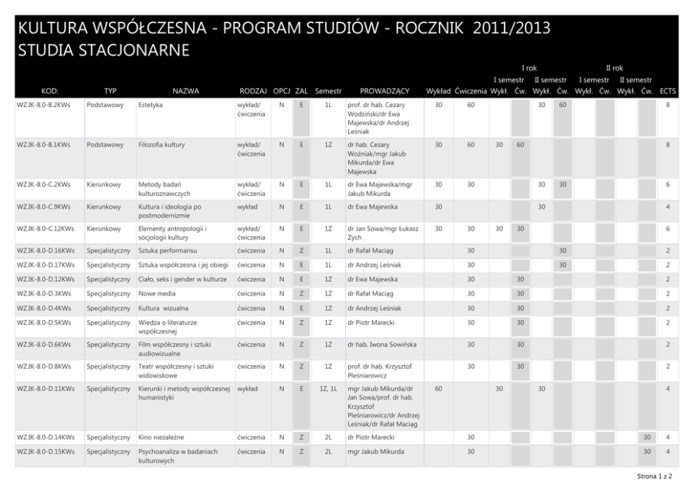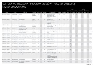 KULTURA WSPÓŁCZESNA - PROGRAM STUDIÓW - ROCZNIK 2011/2013 STUDIA STACJONARNE I rok I semestr KOD: TYP NAZWA RODZAJ OPCJ ZAL Semestr PROWADZĄCY II rok II semestr I semestr II semestr Wykład Ćwiczenia Wykł. Ćw. Wykł. Ćw. Wykł. Ćw. Wykł. Ćw. ECTS WZ.IK-8.0-B.2KWs Podstawowy Estetyka wykład/ ćwiczenia N E 1L prof. dr hab. Cezary Wodziński/dr Ewa Majewska/dr Andrzej Leśniak 30 60 WZ.IK-8.0-B.1KWs Podstawowy Filozofia kultury wykład/ ćwiczenia N E 1Z dr hab. Cezary Woźniak/mgr Jakub Mikurda/dr Ewa Majewska 30 60 WZ.IK-8.0-C.2KWs Kierunkowy Metody badań kulturoznawczych wykład/ ćwiczenia N E 1L dr Ewa Majewska/mgr Jakub Mikurda 30 30 WZ.IK-8.0-C.9KWs Kierunkowy Kultura i ideologia po postmodernizmie wykład N E 1L dr Ewa Majewska 30 WZ.IK-8.0-C.12KWs Kierunkowy Elementy antropologii i socjologii kultury wykład/ ćwiczenia N E 1Z dr Jan Sowa/mgr Łukasz Zych 30 WZ.IK-8.0-D.16KWs Specjalistyczny Sztuka performansu ćwiczenia N Z 1L dr Rafał Maciąg 30 30 2 WZ.IK-8.0-D.17KWs Specjalistyczny Sztuka współczesna i jej obiegi ćwiczenia N E 1L dr Andrzej Leśniak 30 30 2 WZ.IK-8.0-D.12KWs Specjalistyczny Ciało, seks i gender w kulturze ćwiczenia N E 1Z dr Ewa Majewska 30 30 2 WZ.IK-8.0-D.3KWs Specjalistyczny Nowe media ćwiczenia N Z 1Z dr Rafał Maciąg 30 30 2 WZ.IK-8.0-D.4KWs Specjalistyczny Kultura wizualna ćwiczenia N E 1Z dr Andrzej Leśniak 30 30 2 WZ.IK-8.0-D.5KWs Specjalistyczny Wiedza o literaturze współczesnej ćwiczenia N Z 1Z dr Piotr Marecki 30 30 2 WZ.IK-8.0-D.6KWs Specjalistyczny Film współczesny i sztuki audiowizualne ćwiczenia N Z 1Z dr hab. Iwona Sowińska 30 30 2 WZ.IK-8.0-D.8KWs Specjalistyczny Teatr współczesny i sztuki widowiskowe ćwiczenia N Z 1Z prof. dr hab. Krzysztof Pleśniarowicz 30 30 2 WZ.IK-8.0-D.11KWs Specjalistyczny Kierunki i metody współczesnej humanistyki wykład N E 1Z, 1L WZ.IK-8.0-D.14KWs Specjalistyczny Kino niezależne ćwiczenia N Z 2L dr Piotr Marecki 30 30 4 WZ.IK-8.0-D.15KWs Specjalistyczny Psychoanaliza w badaniach kulturowych ćwiczenia N Z 2L mgr Jakub Mikurda 30 30 4 mgr Jakub Mikurda/dr Jan Sowa/prof. dr hab. Krzysztof Pleśniarowicz/dr Andrzej Leśniak/dr Rafał Maciąg 30 30 60 8 60 8 30 30 6 30 30 60 30 30 4 30 6 30 4 Strona 1 z 2 I rok I semestr KOD: TYP NAZWA RODZAJ OPCJ ZAL Semestr PROWADZĄCY II rok II semestr I semestr II semestr Wykład Ćwiczenia Wykł. Ćw. Wykł. Ćw. Wykł. Ćw. Wykł. Ćw. ECTS WZ.IK-8.0-D.10KWs Specjalistyczny Academic writing z elementami edytorstwa ćwiczenia N Z 2Z mgr Marcin Hernas 30 30 4 WZ.IK-8.0-D.13KWs Specjalistyczny Kierunki współczesnej muzyki alternatywnej ćwiczenia N Z 2Z mgr Jan Bińczycki 30 30 4 WZ.IK-8.0-D.18KWs Specjalistyczny Teoria performatyki wykład N E 2Z prof. dr hab. Krzysztof Pleśniarowicz WZ.IK-8.0-D.19KWs Specjalistyczny Krytyczna teoria mody i designu ćwiczenia N Z 2Z mgr Jagoda Murczyńska 30 30 4 WZ.IK-8.0-D.7KWs Specjalistyczny Kultura popularna ćwiczenia N E 2Z mgr Jakub Mikurda 30 30 4 WZ.IK-8.0-D.20KWs Specjalistyczny (Po)nowoczesność i jej krytycy ćwiczenia T E 1L, 2Z dr Jan Sowa 60 30 2 WZ.IK-8.0-D.22KWs Specjalistyczny Muzyka elektroniczna i audioart ćwiczenia T Z 2L Prof. Marek 30 WZ.IK-8.0-D.21KWs Specjalistyczny Globalizacja, etniczność, narodowość ćwiczenia T Z 2Z mgr Jakub Majmurek 30 30 2 WZ.IK-8.0-D.23KWs Specjalistyczny Taniec współczesny ćwiczenia T Z 2Z mgr Anna Królica 30 30 2 WZ.IK-8.0-F.1KWn Specjalistyczny Seminarium ćwiczenia N Z 1L, 2Z, 2L prof. dr hab. Krzysztof Pleśniarowicz 90 30 30 30 45 WZ.IK-8.0-F.2KWn Specjalistyczny Seminarium ćwiczenia N Z 1L, 2Z, 2L dr Piotr Marecki 90 30 30 30 45 WZ.IK-8.0-F.3KWn Specjalistyczny Seminarium ćwiczenia N Z 1L, 2Z, 2L dr Jan Sowa 90 30 30 30 45 WZ.IK-8.0-F.5KWn Specjalistyczny Seminarium ćwiczenia N Z 1L, 2Z, 2L dr hab. Iwona Sowińska 90 30 30 30 45 WZ.IK-8.0-WI.7KWs Specjalizacyjny Literatura współczesna i jej obiegi ćwiczenia T Z 1L dr Piotr Marecki 30 30 WZ.IK-8.0-WI.8KWs Specjalizacyjny Kultura niezależna w czasach PRL-u ćwiczenia T Z 2Z dr Piotr Marecki 30 30 30 30 6 30 2 2 30 2 Strona 2 z 2