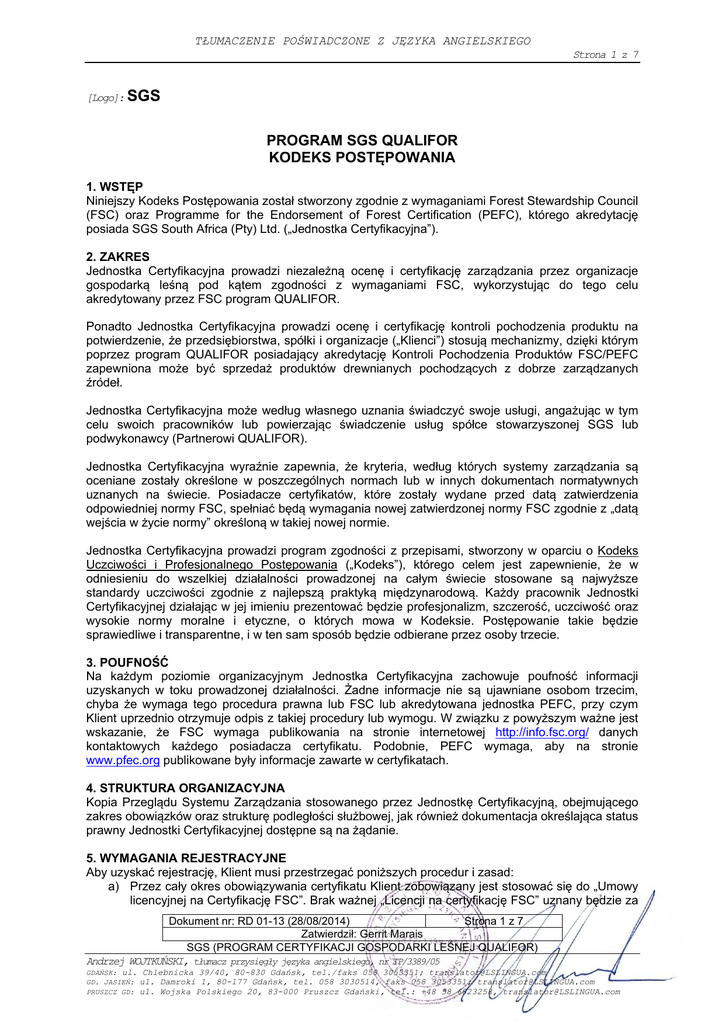 TŁUMACZENIE POŚWIADCZONE Z JĘZYKA ANGIELSKIEGO Strona 1 z 7 [Logo]: SGS PROGRAM SGS QUALIFOR KODEKS POSTĘPOWANIA 1. WSTĘP Niniejszy Kodeks Postępowania został stworzony zgodnie z wymaganiami Forest Stewardship Council (FSC) oraz Programme for the Endorsement of Forest Certification (PEFC), którego akredytację posiada SGS South Africa (Pty) Ltd. („Jednostka Certyfikacyjna”). 2. ZAKRES Jednostka Certyfikacyjna prowadzi niezależną ocenę i certyfikację zarządzania przez organizacje gospodarką leśną pod kątem zgodności z wymaganiami FSC, wykorzystując do tego celu akredytowany przez FSC program QUALIFOR. Ponadto Jednostka Certyfikacyjna prowadzi ocenę i certyfikację kontroli pochodzenia produktu na potwierdzenie, że przedsiębiorstwa, spółki i organizacje („Klienci”) stosują mechanizmy, dzięki którym poprzez program QUALIFOR posiadający akredytację Kontroli Pochodzenia Produktów FSC/PEFC zapewniona może być sprzedaż produktów drewnianych pochodzących z dobrze zarządzanych źródeł. Jednostka Certyfikacyjna może według własnego uznania świadczyć swoje usługi, angażując w tym celu swoich pracowników lub powierzając świadczenie usług spółce stowarzyszonej SGS lub podwykonawcy (Partnerowi QUALIFOR). Jednostka Certyfikacyjna wyraźnie zapewnia, że kryteria, według których systemy zarządzania są oceniane zostały określone w poszczególnych normach lub w innych dokumentach normatywnych uznanych na świecie. Posiadacze certyfikatów, które zostały wydane przed datą zatwierdzenia odpowiedniej normy FSC, spełniać będą wymagania nowej zatwierdzonej normy FSC zgodnie z „datą wejścia w życie normy” określoną w takiej nowej normie. Jednostka Certyfikacyjna prowadzi program zgodności z przepisami, stworzony w oparciu o Kodeks Uczciwości i Profesjonalnego Postępowania („Kodeks”), którego celem jest zapewnienie, że w odniesieniu do wszelkiej działalności prowadzonej na całym świecie stosowane są najwyższe standardy uczciwości zgodnie z najlepszą praktyką międzynarodową. Każdy pracownik Jednostki Certyfikacyjnej działając w jej imieniu prezentować będzie profesjonalizm, szczerość, uczciwość oraz wysokie normy moralne i etyczne, o których mowa w Kodeksie. Postępowanie takie będzie sprawiedliwe i transparentne, i w ten sam sposób będzie odbierane przez osoby trzecie. 3. POUFNOŚĆ Na każdym poziomie organizacyjnym Jednostka Certyfikacyjna zachowuje poufność informacji uzyskanych w toku prowadzonej działalności. Żadne informacje nie są ujawniane osobom trzecim, chyba że wymaga tego procedura prawna lub FSC lub akredytowana jednostka PEFC, przy czym Klient uprzednio otrzymuje odpis z takiej procedury lub wymogu. W związku z powyższym ważne jest wskazanie, że FSC wymaga publikowania na stronie internetowej http://info.fsc.org/ danych kontaktowych każdego posiadacza certyfikatu. Podobnie, PEFC wymaga, aby na stronie www.pfec.org publikowane były informacje zawarte w certyfikatach. 4. STRUKTURA ORGANIZACYJNA Kopia Przeglądu Systemu Zarządzania stosowanego przez Jednostkę Certyfikacyjną, obejmującego zakres obowiązków oraz strukturę podległości służbowej, jak również dokumentacja określająca status prawny Jednostki Certyfikacyjnej dostępne są na żądanie. 5. WYMAGANIA REJESTRACYJNE Aby uzyskać rejestrację, Klient musi przestrzegać poniższych procedur i zasad: a) Przez cały okres obowiązywania certyfikatu Klient zobowiązany jest stosować się do „Umowy licencyjnej na Certyfikację FSC”. Brak ważnej „Licencji na certyfikację FSC” uznany będzie za Dokument nr: RD 01-13 (28/08/2014) Strona 1 z 7 Zatwierdził: Gerrit Marais SGS (PROGRAM CERTYFIKACJI GOSPODARKI LEŚNEJ QUALIFOR) Andrzej WOJTKUŃSKI, tłumacz przysięgły języka angielskiego, nr TP/3389/05 GDAŃSK: ul. Chlebnicka 39/40, 80-830 Gdańsk, tel./faks 058 3053351; [email protected] GD. JASIEŃ: ul. Damroki 1, 80-177 Gdańsk, tel. 058 3030514, faks 058 3053351; [email protected] PRUSZCZ GD: ul. Wojska Polskiego 20, 83-000 Pruszcz Gdański, tel.: +48 58 6823258, [email protected] TŁUMACZENIE POŚWIADCZONE Z JĘZYKA ANGIELSKIEGO Strona 2 z 7 b) c) d) e) f) g) h) i) formalną istotną niezgodność, która wymaga naprawy w terminie nie dłuższym niż cztery (4) tygodnie. Nieusunięcie takiej istotnej niezgodności prowadzić będzie do zawieszenia certyfikatu. Klient udostępni Jednostce Certyfikacyjnej wszelkie dokumenty, próbki produktów, rysunki, specyfikacje i inne informacje wymagane przez Jednostkę Certyfikacyjną do zakończenia programu oceny. Ponadto Klient wyznaczy osobę upoważnioną do utrzymywania kontaktów z Jednostką Certyfikacyjną. Jeżeli Jednostka Certyfikacyjna uzna, że nie wszystkie wymagania rejestracyjne zostały spełnione, zawiadomi Klienta o tych aspektach, w których występują braki. Jeżeli Klient udowodni, że w terminie określonym przez Jednostkę Certyfikacyjną podjął działania naprawcze w celu spełnienia wszystkich wymagań, Jednostka Certyfikacyjna zaaranżuje na koszt Klienta ponowną ocenę wyłącznie tych niezbędnych elementów. Jeżeli Klient nie podejmie działań naprawczych w określonym terminie, Jednostka Certyfikacyjna może być zmuszona do ponownego przeprowadzenia pełnej oceny za dodatkową opłatą. Ustalenie przestrzegania przepisów dotyczyć będzie wyłącznie zakładów poddawanych ocenie, określonych w Harmonogramie Certyfikacji i Oceny lub w innych ewentualnych załącznikach do Certyfikatu. Klient zgadza się na pokrycie wszelkich opłat i kosztów określonych w umowie. Klient nie będzie używać certyfikacji swojego produktu w sposób, który mógłby skompromitować jednostkę certyfikacyjną ani też składać oświadczeń w sprawie certyfikacji swoich produktów, które to oświadczenia mogłyby zostać uznane przez jednostkę certyfikacyjną za mylące lub nieupoważnione. Klient zapewnia, że znana mu jest stosowana pr