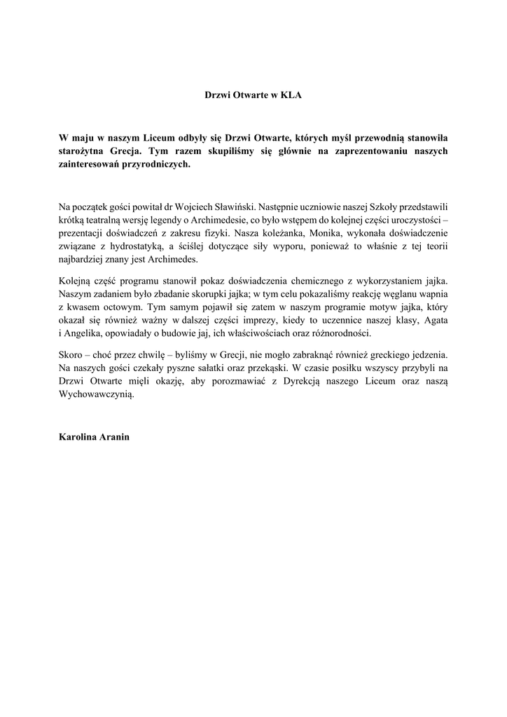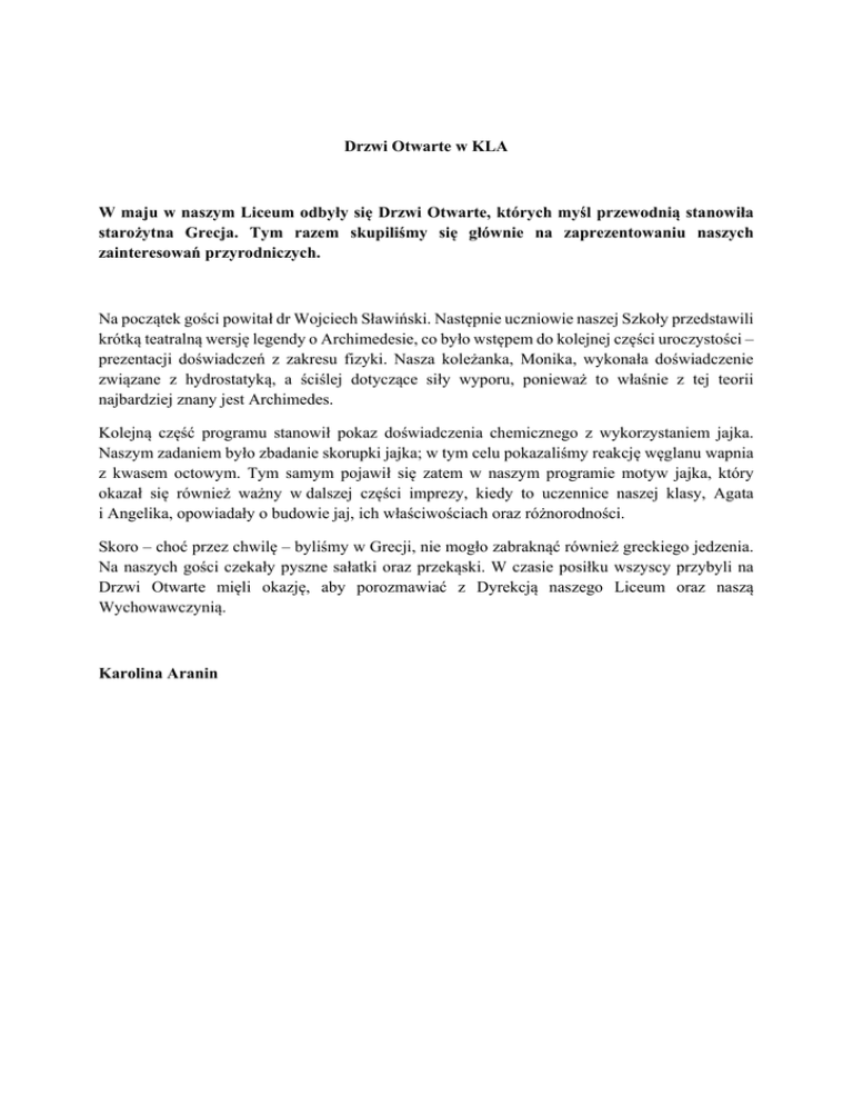 Drzwi Otwarte w KLA W maju w naszym Liceum odbyły się Drzwi Otwarte, których myśl przewodnią stanowiła starożytna Grecja. Tym razem skupiliśmy się głównie na zaprezentowaniu naszych zainteresowań przyrodniczych. Na początek gości powitał dr Wojciech Sławiński. Następnie uczniowie naszej Szkoły przedstawili krótką teatralną wersję legendy o Archimedesie, co było wstępem do kolejnej części uroczystości – prezentacji doświadczeń z zakresu fizyki. Nasza koleżanka, Monika, wykonała doświadczenie związane z hydrostatyką, a ściślej dotyczące siły wyporu, ponieważ to właśnie z tej teorii najbardziej znany jest Archimedes. Kolejną część programu stanowił pokaz doświadczenia chemicznego z wykorzystaniem jajka. Naszym zadaniem było zbadanie skorupki jajka; w tym celu pokazaliśmy reakcję węglanu wapnia z kwasem octowym. Tym samym pojawił się zatem w naszym programie motyw jajka, który okazał się również ważny w dalszej części imprezy, kiedy to uczennice naszej klasy, Agata i Angelika, opowiadały o budowie jaj, ich właściwościach oraz różnorodności. Skoro – choć przez chwilę – byliśmy w Grecji, nie mogło zabraknąć również greckiego jedzenia. Na naszych gości czekały pyszne sałatki oraz przekąski. W czasie posiłku wszyscy przybyli na Drzwi Otwarte mięli okazję, aby porozmawiać z Dyrekcją naszego Liceum oraz naszą Wychowawczynią. Karolina Aranin