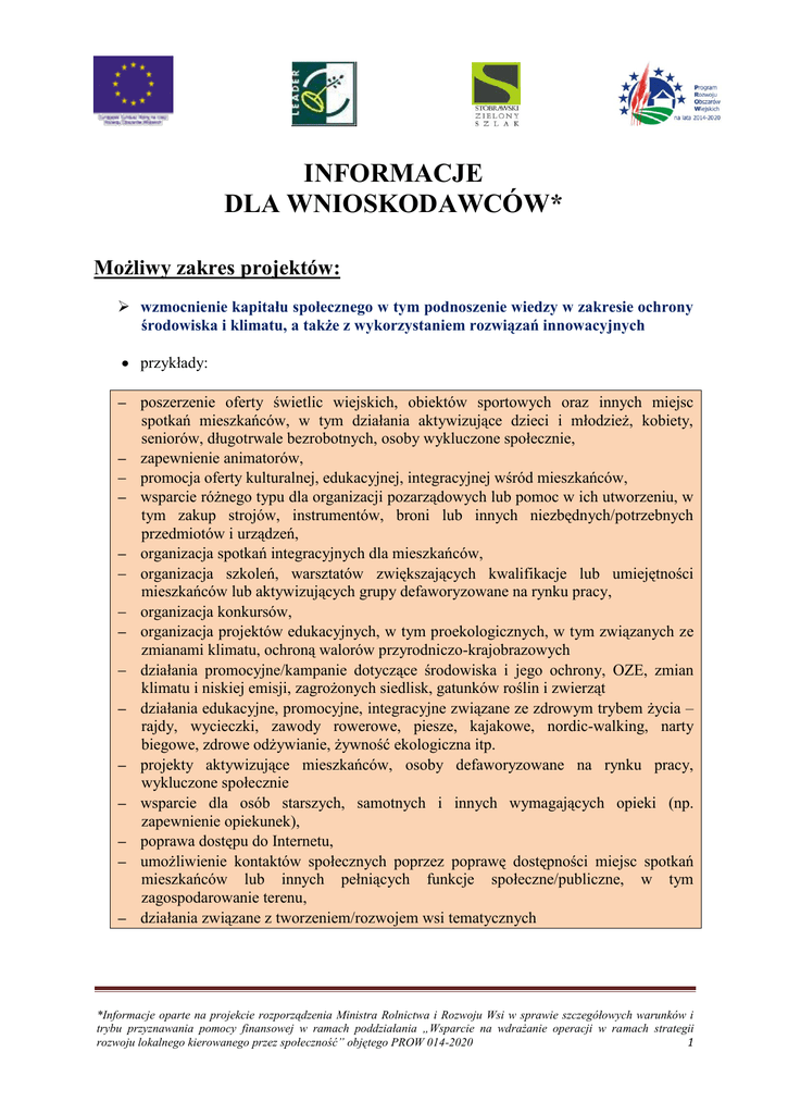 INFORMACJE DLA WNIOSKODAWCÓW* Możliwy zakres projektów: wzmocnienie kapitału społecznego w tym podnoszenie wiedzy w zakresie ochrony środowiska i klimatu, a także z wykorzystaniem rozwiązań innowacyjnych przykłady: poszerzenie oferty świetlic wiejskich, obiektów sportowych oraz innych miejsc spotkań mieszkańców, w tym działania aktywizujące dzieci i młodzież, kobiety, seniorów, długotrwale bezrobotnych, osoby wykluczone społecznie, zapewnienie animatorów, promocja oferty kulturalnej, edukacyjnej, integracyjnej wśród mieszkańców, wsparcie różnego typu dla organizacji pozarządowych lub pomoc w ich utworzeniu, w tym zakup strojów, instrumentów, broni lub innych niezbędnych/potrzebnych przedmiotów i urządzeń, organizacja spotkań integracyjnych dla mieszkańców, organizacja szkoleń, warsztatów zwiększających kwalifikacje lub umiejętności mieszkańców lub aktywizujących grupy defaworyzowane na rynku pracy, organizacja konkursów, organizacja projektów edukacyjnych, w tym proekologicznych, w tym związanych ze zmianami klimatu, ochroną walorów przyrodniczo-krajobrazowych działania promocyjne/kampanie dotyczące środowiska i jego ochrony, OZE, zmian klimatu i niskiej emisji, zagrożonych siedlisk, gatunków roślin i zwierząt działania edukacyjne, promocyjne, integracyjne związane ze zdrowym trybem życia – rajdy, wycieczki, zawody rowerowe, piesze, kajakowe, nordic-walking, narty biegowe, zdrowe odżywianie, żywność ekologiczna itp. projekty aktywizujące mieszkańców, osoby defaworyzowane na rynku pracy, wykluczone społecznie wsparcie dla osób starszych, samotnych i innych wymagających opieki (np. zapewnienie opiekunek), poprawa dostępu do Internetu, umożliwienie kontaktów społecznych poprzez poprawę dostępności miejsc spotkań mieszkańców lub innych pełniących funkcje społeczne/publiczne, w tym zagospodarowanie terenu, działania związane z tworzeniem/rozwojem wsi tematycznych *Informacje oparte na projekcie rozporządzenia Ministra Rolnictwa i Rozwoju Wsi w sprawie szczegółowych warunków i trybu przyznawania pomocy finansowej w ramach poddziałania „Wsparcie na wdrażanie operacji w ramach strategii rozwoju lokalnego kierowanego przez społeczność” objętego PROW 014-2020 1 zachowanie dziedzictwa lokalnego przykłady: prowadzenie badań związanych z dziedzictwem lokalnym, kultywowanie, podtrzymywanie lokalnych tradycji, obrzędów, gwary, zwyczajów, kultywowanie, podtrzymywanie tradycyjnych zawodów i rzemiosła, remont, adaptacja, tworzenie, wyposażenie izb pamięci, muzeów, sal ekspozycyjnych, witryn, remont, adaptacja, tworzenie, wyposażenie obiektów związanych z promocją lokalnych produktów i usług wykorzystujących lokalne zasoby, remont, renowacja zabytków wpisanych do rejestru lub ewidencji zabytków, tworzenie ścieżek edukacyjnych, wsparcie działalności artystycznej, lokalnych twórców, artystów wsparcie produktów lokalnych zachowujących lokalne dziedzictwo, digitalizacja różnego typu materiałów związanych z dziedzictwem lokalnym ogólnodostępna, niekomercyjna infrastruktura turystyczna, rekreacyjna i kulturalna przykłady: prowadzenie ścieżek rowerowych, prowadzenie szlaków, tras turystycznych pieszych, kajakowych, konnych, nordic walking, zagospodarowanie miejsc odpoczynku, mała architektura, wieże widokowe, punkty widokowe, zagospodarowanie zbiorników wodnych i rzek (utworzenie plaży, kąpieliska, budowa pomostów, przystani), odtwarzanie, remont małych zbiorników wodnych (np.ppoż, stawków) i ich zagospodarowanie, oznakowanie atrakcji turystycznych, tablice informacyjne, punkty informacyjne, zagospodarowanie terenu na cele turystyczne, rekreacyjne lub kulturalne, budowa siłowni zewnętrznych, placów zabaw, urządzanie, zagospodarowywanie parków i innych miejsc zieleni, skwerów, budowa, przebudowa, remont amfiteatrów, scen zewnętrznych, budowa, przebudowa, remont, wyposażenie świetlic wiejskich i innych miejsc spotkań mieszkańców, budowa, przebudowa, remont, wyposażenie obiektów sportowych (boisk, boisk wielofunkcyjnych, kortów, bieżni itp.) *Informacje oparte na projekcie rozporządzenia Ministra Rolnictwa i Rozwoju Wsi w sprawie szczegółowych warunków i trybu przyznawania pomocy finansowej w ramach poddziałania „Wsparcie na wdrażanie operacji w ramach strategii rozwoju lokalnego kierowanego przez społeczność” objętego PROW 014-2020 2 promowanie obszaru objętego LSR, w tym produktów i usług lokalnych przykłady: promocja turystyczna (publikacje, foldery, ulotki, strony www, filmy, pamiątki itp.) marka turystyczna, produkt turystyczny, kompleksowa oferta turystyczna, pakiety , utworzenie bazy informacji turystycznej, promocja atrakcji turystycznych, promocja produktów lokalnych, promocja przedsiębiorców, terenów inwestycyjnych, utworzenie bazy informacji, forum lokalnych produktów i usług, promocja wydarzeń kulturalnych, sportowych, integracyjnych, edukacyjnych, promocja artystów, twórców, zespołów, grup, organizacja imprez, wydarzeń promocyjnych, kampania promocyjna obszaru. UWAGA: wyłączone imprezy cykliczne (np. dożynki), za wyjątkiem wydarzenia inicjującego cykl wydarzeń lub specyficznego dla danej LGD (musi być ujęte w LSR) rozwój przedsiębiorczości zakładanie działalności gospodarczej lub rozwój istniejącej działalności poprzez stworzenie nowych miejsc pracy, dywersyfikacja źródeł dochodu, tworzenie lub rozwój inkubatorów przetwórstwa lokalnego produktów rolnych będących przedsiębiorstwami spożywczymi, w których jest prowadzona działalność w zakresie produkcji, przetwarzania lub dystrybucji żywności pochodzenia roślinnego lub zwierzęcego lub wprowadzania tej żywności na rynek, przy czym podstawą działalności jest przetwarzanie, rozwój bazy noclegowej, gastronomicznej, usług turystycznych, agroturystyki, rozwój branż przewidzianych w LSR, zakładanie spółdzielni socj