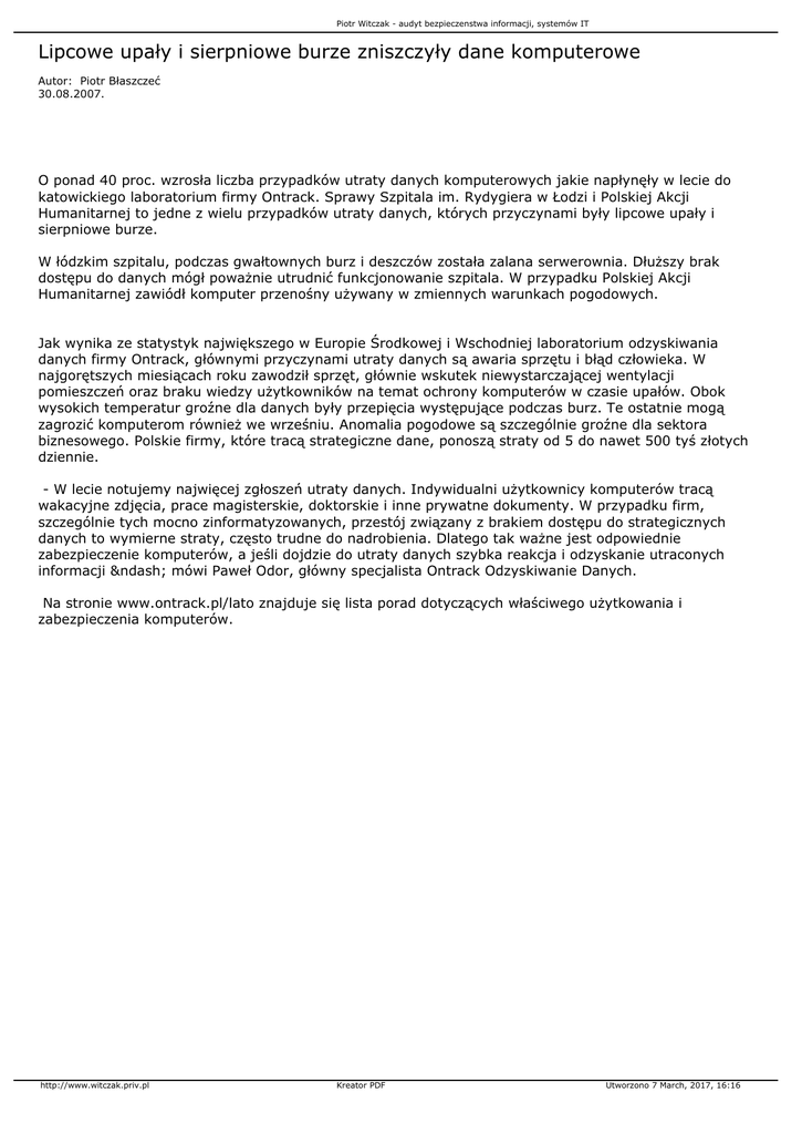 Piotr Witczak - audyt bezpieczenstwa informacji, systemów IT Lipcowe upały i sierpniowe burze zniszczyły dane komputerowe Autor: Piotr Błaszczeć 30.08.2007. O ponad 40 proc. wzrosła liczba przypadków utraty danych komputerowych jakie napłynęły w lecie do katowickiego laboratorium firmy Ontrack. Sprawy Szpitala im. Rydygiera w Łodzi i Polskiej Akcji Humanitarnej to jedne z wielu przypadków utraty danych, których przyczynami były lipcowe upały i sierpniowe burze. W łódzkim szpitalu, podczas gwałtownych burz i deszczów została zalana serwerownia. Dłuższy brak dostępu do danych mógł poważnie utrudnić funkcjonowanie szpitala. W przypadku Polskiej Akcji Humanitarnej zawiódł komputer przenośny używany w zmiennych warunkach pogodowych. Jak wynika ze statystyk największego w Europie Środkowej i Wschodniej laboratorium odzyskiwania danych firmy Ontrack, głównymi przyczynami utraty danych są awaria sprzętu i błąd człowieka. W najgorętszych miesiącach roku zawodził sprzęt, głównie wskutek niewystarczającej wentylacji pomieszczeń oraz braku wiedzy użytkowników na temat ochrony komputerów w czasie upałów. Obok wysokich temperatur groźne dla danych były przepięcia występujące podczas burz. Te ostatnie mogą zagrozić komputerom również we wrześniu. Anomalia pogodowe są szczególnie groźne dla sektora biznesowego. Polskie firmy, które tracą strategiczne dane, ponoszą straty od 5 do nawet 500 tyś złotych dziennie. - W lecie notujemy najwięcej zgłoszeń utraty danych. Indywidualni użytkownicy komputerów tracą wakacyjne zdjęcia, prace magisterskie, doktorskie i inne prywatne dokumenty. W przypadku firm, szczególnie tych mocno zinformatyzowanych, przestój związany z brakiem dostępu do strategicznych danych to wymierne straty, często trudne do nadrobienia. Dlatego tak ważne jest odpowiednie zabezpieczenie komputerów, a jeśli dojdzie do utraty danych szybka reakcja i odzyskanie utraconych informacji – mówi Paweł Odor, główny specjalista Ontrack Odzyskiwanie Danych. Na stronie www.ontrack.pl/lato znajduje się lista porad dotyczących właściwego użytkowania i zabezpieczenia komputerów. http://www.witczak.priv.pl Kreator PDF Utworzono 7 March, 2017, 16:16