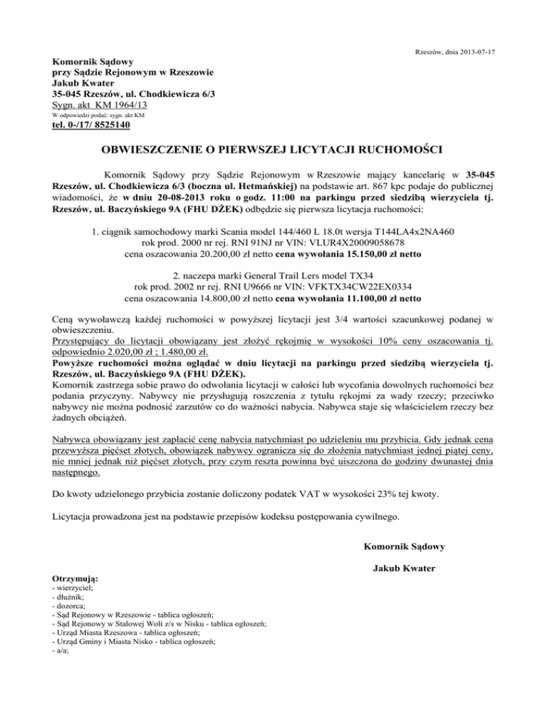 Rzeszów, dnia 2013-07-17 Komornik Sądowy przy Sądzie Rejonowym w Rzeszowie Jakub Kwater 35-045 Rzeszów, ul. Chodkiewicza 6/3 Sygn. akt KM 1964/13 W odpowiedzi podać: sygn. akt KM tel. 0-/17/ 8525140 OBWIESZCZENIE O PIERWSZEJ LICYTACJI RUCHOMOŚCI Komornik Sądowy przy Sądzie Rejonowym w Rzeszowie mający kancelarię w 35-045 Rzeszów, ul. Chodkiewicza 6/3 (boczna ul. Hetmańskiej) na podstawie art. 867 kpc podaje do publicznej wiadomości, że w dniu 20-08-2013 roku o godz. 11:00 na parkingu przed siedzibą wierzyciela tj. Rzeszów, ul. Baczyńskiego 9A (FHU DŻEK) odbędzie się pierwsza licytacja ruchomości: 1. ciągnik samochodowy marki Scania model 144/460 L 18.0t wersja T144LA4x2NA460 rok prod. 2000 nr rej. RNI 91NJ nr VIN: VLUR4X20009058678 cena oszacowania 20.200,00 zł netto cena wywołania 15.150,00 zł netto 2. naczepa marki General Trail Lers model TX34 rok prod. 2002 nr rej. RNI U9666 nr VIN: VFKTX34CW22EX0334 cena oszacowania 14.800,00 zł netto cena wywołania 11.100,00 zł netto Ceną wywoławczą każdej ruchomości w powyższej licytacji jest 3/4 wartości szacunkowej podanej w obwieszczeniu. Przystępujący do licytacji obowiązany jest złożyć rękojmię w wysokości 10% ceny oszacowania tj. odpowiednio 2.020,00 zł ; 1.480,00 zł. Powyższe ruchomości można oglądać w dniu licytacji na parkingu przed siedzibą wierzyciela tj. Rzeszów, ul. Baczyńskiego 9A (FHU DŻEK). Komornik zastrzega sobie prawo do odwołania licytacji w całości lub wycofania dowolnych ruchomości bez podania przyczyny. Nabywcy nie przysługują roszczenia z tytułu rękojmi za wady rzeczy; przeciwko nabywcy nie można podnosić zarzutów co do ważności nabycia. Nabywca staje się właścicielem rzeczy bez żadnych obciążeń. Nabywca obowiązany jest zapłacić cenę nabycia natychmiast po udzieleniu mu przybicia. Gdy jednak cena przewyższa pięćset złotych, obowiązek nabywcy ogranicza się do złożenia natychmiast jednej piątej ceny, nie mniej jednak niż pięćset złotych, przy czym reszta powinna być uiszczona do godziny dwunastej dnia następnego. Do kwoty udzielonego przybicia zostanie doliczony podatek VAT w wysokości 23% tej kwoty. Licytacja prowadzona jest na podstawie przepisów kodeksu postępowania cywilnego. Komornik Sądowy Jakub Kwater Otrzymują: - wierzyciel; - dłużnik; - dozorca; - Sąd Rejonowy w Rzeszowie - tablica ogłoszeń; - Sąd Rejonowy w Stalowej Woli z/s w Nisku - tablica ogłoszeń; - Urząd Miasta Rzeszowa - tablica ogłoszeń; - Urząd Gminy i Miasta Nisko - tablica ogłoszeń; - a/a;