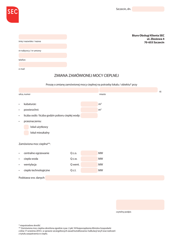 Szczecin, dn. Biuro Obsługi Klienta SEC ul. Zbożowa 4 70-653 Szczecin imię i nazwisko / nazwa nr nabywcy / nr umowy telefon e-mail ZMIANA ZAMÓWIONEJ MOCY CIEPLNEJ Proszę o zmianę zamówionej mocy cieplnej na potrzeby lokalu / obiektu* przy ulica, numer o: miasto • kubaturze: m3 • powierzchni: m2 • liczba osób / liczba godzin poboru ciepłej wody: • przeznaczeniu: lokal użytkowy lokal mieszkalny Zamówiona moc cieplna**: • centralne ogrzewanie Q c.o. MW • ciepła woda Q c.w. MW • wentylacja Q went. MW • ciepło technologiczne Q c.t. MW Podstawa ww. danych czytelny podpis * niepotrzebne skreślić ** Zamówiona moc cieplna określona zgodnie z par. 2 pkt 18 Rozporządzenia Ministra Gospodarki z dnia 17 września 2010 r. w sprawie szczegółowych zasad kształtowania i kalkulacji taryf oraz rozliczeń z tytułu zaopatrzenia w ciepło. Szczecin, dn. Biuro Obsługi Klienta SEC ul. Zbożowa 4 70-653 Szczecin imię i nazwisko / nazwa nr nabywcy / nr umowy telefon e-mail WNIOSEK O ZMIANĘ SPOSOBU ROZLICZANIA Zgodnie z par. 24 rozporządzenia w sprawie szczegółowych zasad kształtowania i kalkulacji taryf oraz rozliczeń z tytułu zaopatrzenia w ciepło wnioskuję o zmianę sposobu rozliczeń z tytułu zakupu ciepła na potrzeby lokalu mieszkalnego / użytkowego* przy ulica, numer miasto na jednoczłonowy (par. 36 ww. rozporządzenia) wieloczłonowy w grupie taryfowej Uwaga: Zmianę sposobu rozliczania opłat przyjmuje się od początku następnego miesiąca i obowiązuje minimum 1 rok od dnia przyjęcia do realizacji wniosku. czytelny podpis * niepotrzebne skreślić Szczecin, dn. Biuro Obsługi Klienta SEC ul. Zbożowa 4 70-653 Szczecin imię i nazwisko nr nabywcy / nr umowy telefon e-mail ZMIANA DANYCH – KLIENT INDYWIDUALNY Wnioskuję o zmianę moich dotychczasowych danych. Aktualne dane: imię: nazwisko: adres zamieszkania: adres do korespondencji: telefon: telefon kom.: e-mail: Powyższe dane obowiązują od dnia złożenia wniosku. czytelny podpis Szczecin, dn. Biuro Obsługi Klienta SEC ul. Zbożowa 4 70-653 Szczecin nazwa firmy nr nabywcy / nr umowy telefon e-mail ZMIANA DANYCH – FIRMA Proszę o zmianę dotychczasowych danych firmy. Aktualne dane: nazwa firmy: adres siedziby: adres do korespondencji: NIP: REGON: KRS: Załączniki (kserokopie, oryginały do wglądu): 1. NIP 2. REGON 3. KRS lub zaświadczenie o wpisie do ewidencji działalności gospodarczej czytelny podpis Szczecin, dn. Biuro Obsługi Klienta SEC ul. Zbożowa 4 70-653 Szczecin imię i nazwisko PESEL adres zamieszkania adres do korespondencji telefon telefon kom. WNIOSEK O ZAWARCIE UMOWY – KLIENT INDYWIDUALNY Legitymujący się dowodem osobistym seria, numer wnioskuję o zawarcie Umowy na dostawę ciepła na potrzeby lokalu przy o: ulica, numer miasto • kubaturze: m3 • powierzchni: m2 • liczbie osób zamieszkujących w lokalu: • przeznaczeniu: lokal użytkowy lokal mieszkalny z dniem: Zamówiona moc cieplna*: • centralne ogrzewanie Q c.o. MW • ciepła woda Q c.w. MW • wentylacja Q went. MW Załączniki (kserokopie, oryginały do wglądu): 1. Tytuł prawny do lokalu – do wglądu 2. Protokół przekazania lokalu 3. Dowód osobisty – do wglądu czytelny podpis * Zamówiona moc cieplna określona zgodnie z par. 2 pkt 18 Rozporządzenia Ministra Gospodarki z dnia 17 września 2010 r. w sprawie szczegółowych zasad kształtowania i kalkulacji taryf oraz rozliczeń z tytułu zaopatrzenia w ciepło. Szczecin, dn. Biuro Obsługi Klienta SEC ul. Zbożowa 4 70-653 Szczecin nazwa firmy reprezentant firmy / osoba podpisująca umowę adres siedziby adres do korespondencji telefon telefon kom. e-mail WNIOSEK O ZAWARCIE UMOWY – FIRMA Zwracam się z prośbą o zawarcie Umowy na dostawę ciepła na potrzeby obiektu przy ulica, numer o: miasto • kubaturze: m3 • powierzchni: m2 • liczba osób / liczba godzin poboru ciepłej wody*: • przeznaczeniu: lokal użytkowy lokal mieszkalny z dniem: Zamówiona moc cieplna**: • centralne ogrzewanie Q c.o. MW • ciepła woda Q c.w. MW • wentylacja Q went. MW • ciepło technologiczne Q c.t. MW Załączniki (kserokopie, oryginały do wglądu): 1. Tytuł prawny do lokalu – do wglądu 2. Protokół przekazania lokalu 3. NIP 4. REGON 5. KRS lub zaświadczenie o wpisie do ewidencji działalności gospodarczej * niepotrzebne skreślić ** Zamówiona moc cieplna określona zgodnie z par. 2 pkt 18 Rozporządzenia Ministra Gospodarki z dnia 17 września 2010 r. w sprawie szczegółowych zasad kształtowania i kalkulacji taryf oraz rozliczeń z tytułu zaopatrzenia w ciepło. czytelny podpis Szczecin, dn. Biuro Obsługi Klienta SEC ul. Zbożowa 4 70-653 Szczecin imię i nazwisko / nazwa nr nabywcy / nr umowy telefon e-mail WYPOWIEDZENIE UMOWY Wypowiadam Umowę nr o świadczenie usługi kompleksowej sprzedaży ciepła i usług przesyłania ciepła na potrzeby obiektu / lokalu* przy ulica, numer z dniem miasto r. zgodnie z umownym terminem wypowiedzenia Uwaga: Możliwość wcześniejszego terminu wypowiedzenia istnieje w przypadku, gdy następca umowy przejmie prawa i obowiązki wynikające z tej umowy z tym samym terminem. czytelny podpis * niepotrzebne skreślić Szczecin, dn. Biuro Obsługi Klienta SEC ul. Zbożowa 4 70-653 Szczecin imię i nazwisko / nazwa nr nabywcy / nr umowy telefon e-mail FORMULARZ REKLAMACYJNY czytelny podpis