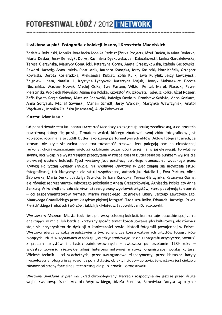 ----------------------------------------------------------------------------------------------------------------- Uwikłane w płeć. Fotografie z kolekcji Joanny i Krzysztofa Madelskich Zdzisław Beksiński, Monika Bereżecka Monika Redzisz (Zorka Project), Józef Dańda, Marian Dederko, Marta Deskur, Jerzy Benedykt Dorys, Kazimiera Dyakowska, Jan Dziaczkowski, Janina Gardzielewska, Teresa Gierzyńska, Maurycy Gomulicki, Katarzyna Górna, Aneta Grzeszykowska, Izabela Gustowska, Edward Hartwig, Anna Imiela, Piotr Janik, Barbara Konopka, Jerzy Kosiński, Piotr Kośnik, Grzegorz Kowalski, Dorota Kozieradzka, Aleksandra Kubiak, Zofia Kulik, Ewa Kuryluk, Jerzy Lewczyński, Zbigniew Libera, Natalia LL, Krystyna Łyczywek, Katarzyna Majak, Henryk Makarewicz, Dorota Nieznalska, Wacław Nowak, Maciej Osika, Ewa Partum, Wiktor Pental, Marek Piasecki, Paweł Pierściński, Wojciech Plewiński, Agnieszka Polska, Krzysztof Pruszkowski, Tadeusz Rolke, Józef Rosner, Zofia Rydet, Serge Sachno, Mateusz Sadowski, Jadwiga Sawicka, Bronisław Schlabs, Anna Senkara, Anna Sołtysiak, Michał Sowiński, Marian Szmidt, Jerzy Wardak, Martynka Wawrzyniak, Anatol Węcławski, Monika Zielińska (Mamzeta), Alicja Żebrowska Kurator: Adam Mazur Od ponad dwudziestu lat Joanna i Krzysztof Madelscy kolekcjonują sztukę współczesną, a od czterech powojenną fotografię polską. Tematem wokół, którego zbudowali swój zbiór fotograficzny jest kobiecość rozumiana za Judith Butler jako szereg performatywnych aktów. Aktów fotograficznych, za którymi nie kryje się żadna absolutna tożsamość płciowa, lecz polegają one na nieustannej re/konstrukcji i wzmacnianiu wielości, osłabianiu tożsamości (raczej niż na jej ekspresji). To właśnie słynna, lecz wciąż nie wystarczająco przeczytana w Polsce książka Butler stała się punktem wyjścia dla pierwszej odsłony kolekcji. Tytuł wystawy jest parafrazą polskiego tłumaczenia wydanego przez Krytykę Polityczną Gender Trouble. Na wystawie Uwikłane w płeć znajdą się arcydzieła sztuki fotograficznej, tak klasycznych dla sztuki współczesnej autorek jak Natalia LL, Ewa Partum, Alicja Żebrowska, Marta Deskur, Jadwiga Sawicka, Barbara Konopka, Teresa Gierzyńska, Katarzyna Górna, ale również reprezentantek młodszego pokolenia z Anetą Grzeszykowską, Agnieszką Polską czy Anną Senkarą. W kolekcji znalazło się również szereg pracy wybitnych artystów, które podejmują ten temat – od eksperymentatorów formatu Marka Piaseckiego, Zbigniewa Libery, Jerzego Lewczyńskiego, Maurycego Gomulickiego przez klasyków pięknej fotografii Tadeusza Rolke, Edwarda Hartwiga, Pawła Pierścińskiego i młodych twórców, takich jak Mateusz Sadowski, Jan Dziaczkowski. Wystawa w Muzeum Miasta Łodzi jest pierwszą odsłoną kolekcji, konfrontuje autorskie spojrzenia analizujące w mniej lub bardziej krytyczny sposób temat konstruowania płci kulturowej, ale również staje się przyczynkiem do dyskusji o konieczności rewizji historii fotografii powojennej w Polsce. Wystawa zderza ze sobą przedstawienia tworzone przez konserwatywnych artystów fotografików biorących udział w wystawach w rodzaju „Międzynarodowego Salonu Fotografii Artystycznej Wenus” z pracami artystów i artystek zainteresowanych – zwłaszcza po przełomie 1989 roku – w destabilizowaniu niezwykle silnej heteronormatywnej matrycy organizującej polską kulturę. Wielość technik – od szlachetnych, przez awangardowe eksperymenty, przez klasyczne baryty i współczesne fotografie cyfrowe, aż po instalacje, obiekty i video – sprawia, że wystawa jest ciekawa również od strony formalnej i technicznej dla publiczności Fotofestiwalu. Wystawa Uwikłane w płeć ma układ chronologiczny. Narracja rozpoczyna się jeszcze przed drugą wojną światową. Dzieła Anatola Węcławskiego, Józefa Rosnera, Benedykta Dorysa są pięknie ----------------------------------------------------------------------------------------------------------------wykonane, eleganckie i zmysłowe. Szlachetność techniki idzie w parze z mieszczańskim konserwatyzmem ujęcia tematu. Okres powojenny przynosi wahnięcie w postaci wymuszonego na twórcach polskiej fotografii epizodu socrealistycznego i dalsze rozwinięcie klasycznego tematu w bardziej nowoczesnej formie, ale też momentami ujętego minoderyjnie, na sposób drobnomieszczański. Wystawa skonstruowana jest w linearny sposób, ale pojawiają się w jej ramach punkty przesilenia, interwencje i uskoki prowokujące do zadania pytania o współczesne odczytanie fotografii historycznej. Podział galerii na dwa piętra stwarza okazję do zapoznania się z twórczością mężczyzn i kobiet, dostrzeżenia procesu emancypacji i zdobywania samoświadomości przez artystki, które od lat 1970. przejmują inicjatywę i zaczynają dominować w fotografii, nadając jej zupełnie nowe, nieznane wcześniej sensy, używając jej do wypowiedzenia nowych treści. Wystawa w galerii na parterze zaczyna się od mistrzów fotografii powojennej Tadeusza Rolke, Zbigniewa Dłubaka, Jerzego Lewczyńskiego, ale także mistrzyń takich jak Krystyna Łyczywek, czy Ewa Partum, która przenosi odbiorcę w stronę krytycznego podejścia do tematu, nie tylko afirmacji i erotyzacji (choć i od tego nie są wolne klasyczki wpisywane retrospektywnie, trochę wbrew własnej woli, w nurt sztuki feministycznej). Wystawa dzieli się na sekwencje prac pojedynczych, bądź sygnalizujących jedynie obecność danego autora w zbiorach Joanny i Krzysztofa Madelskich, jak i całe korpusy prac reprezentatywne dla twórczości danego artysty/artystki. Wśród szerzej prezentowanych sylwetek są tu postacie nieznane jak Michał Sowiński, kontrowersyjne jak Paweł Pierściński, cenione przez świat sztuki współczesnej jak Jerzy Lewczyński. Podobnie zorganizowana jest narracja wystawowa na drugim piętrze, gdzie oprócz wybranych prac Moniki Zielińskiej, Macieja Osiki, Anety Grzeszyk