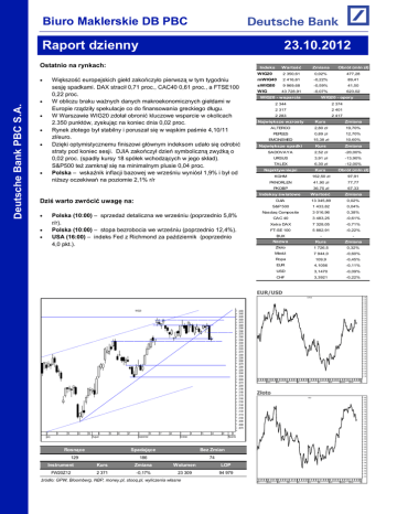 Biuro Maklerskie DB PBC bobbww Raport dzienny 23.10.2012 Ostatnio na rynkach: Deutsche Bank PBC S.A. Zmiana Obrót (mln zł) 2 350,61 0,02% 477,28 mWIG40 2 416,61 -0,22% 89,41 sWIG80 9 969,68 -0,59% 41,50 43 728,91 -0,07% 623,02 Indeks Większość europejskich giełd zakończyło pierwszą w tym tygodniu sesję spadkami. DAX stracił 0,71 proc., CAC40 0,61 proc., a FTSE100 0,22 proc. W obliczu braku ważnych danych makroekonomicznych giełdami w Europie rządziły spekulacje co do finansowania greckiego długu. W Warszawie WIG20 zdołał obronić kluczowe wsparcie w okolicach 2.350 punktów, zyskując na koniec dnia 0,02 proc. Rynek złotego był stabilny i poruszał się w wąskim paśmie 4,10/11 zł/euro. Dzięki optymistycznemu finiszowi głównym indeksom udało się odrobić straty pod koniec sesji. DJIA zakończył dzień symboliczną zwyżką o 0,02 proc. (spadły kursy 18 spółek wchodzących w jego skład). S&P500 też zamknął się na minimalnym plusie 0,04 proc. Polska – wskaźnik inflacji bazowej we wrześniu wyniósł 1,9% i był od niższy oczekiwań na poziomie 2,1% r/r Wartość WIG20 WIG WIG20 - wsparcia WIG20 - opory 2 344 2 374 2 317 2 401 2 283 Kurs Zmiana ALTERCO 2,80 zł 19,70% PEPEES 0,89 zł 12,70% EMCINSMED 15,38 zł 10,60% Największe spadki Kurs Zmiana SADOVAYA 2,52 zł -20,00% URSUS 3,91 zł -13,90% TALEX 6,30 zł -12,00% Najaktywniejsi Kurs Obrót (mln zł) KGHM 162,50 zł 97,91 PKNORLEN 41,90 zł 77,77 PKOBP 36,75 zł 67,33 Indeksy światowe Wartość Zmiana Dziś warto zwrócić uwagę na: Polska (10:00) – sprzedaż detaliczna we wrześniu (poprzednio 5,8% r/r). Polska (10:00) – stopa bezrobocia we wrześniu (poprzednio 12,4%). USA (16:00) – indeks Fed z Richmond za październik (poprzednio 4,0 pkt.). 2 417 Największe wzrosty DJIA 13 345,89 0,02% S&P 500 1 433,82 0,04% Nasdaq Composite 3 016,96 0,38% CAC 40 3 483,25 -0,61% Xetra DAX 7 328,05 -0,71% FT-SE 100 5 882,91 -0,22% BUX - - Nazwa Kurs Zmiana Złoto 1 726,5 0,32% Miedź 7 944,0 -0,60% Ropa 109,9 -0,45% EUR 4,1056 -0,11% USD 3,1470 -0,09% CHF 3,3921 -0,22% EUR/USD EUR/USD WIG20 2 July 9 16 23 30 6 August 13 20 27 3 10 September 2450 2440 2430 2420 2410 2400 2390 2380 2370 2360 2350 2340 2330 2320 2310 2300 2290 2280 2270 2260 2250 2240 2230 2220 2210 2200 2190 2180 2170 2160 2150 2140 2130 2120 2110 2100 2090 2080 2070 17 24 1 October 8 15 22 29 Rosnące Spadające Bez Zmian 129 186 74 5 November 1.360 1.355 1.350 1.345 1.340 1.335 1.330 1.325 1.320 1.315 1.310 1.305 1.300 1.295 1.290 1.285 1.280 1.275 1.270 1.265 1.260 1.255 1.250 1.245 1.240 1.235 1.230 1.225 1.220 1.215 1.210 1.205 1.200 1.195 2 9 16 23 30 6 13 20 27 5 12 19 26 2 9 16 23 30 7 14 21 28 4 11 18 25 2 9 16 23 30 6 13 20 27 3 10 17 24 1 8 15 22 29 5 2012 February March April May June July August September October November Złoto GOLD 1820 1810 1800 1790 1780 1770 1760 1750 1740 1730 1720 1710 1700 1690 1680 1670 1660 1650 1640 1630 1620 1610 1600 1590 1580 1570 Instrument Kurs Zmiana Wolumen LOP FW20Z12 2 371 -0,17% 23 309 94 979 1560 1550 1540 1530 1520 1510 źródło: GPW, Bloomberg, NBP, money.pl, stooq.pl, wyliczenia własne 3 9 16 23 30 6 13 20 27 5 12 19 26 2 9 16 23 30 7 14 21 28 4 11 18 25 2 9 16 23 30 6 13 20 27 3 10 17 24 1 8 15 22 29 5 2012 February March April May June July August September October November Brakuje impulsów do kupna akcji S&P500 S&P500 1490 Deutsche Bank PBC S.A. 1480 Pierwsza sesja tego tygodnia miała mieszany przebieg. Choć emocji na giełdach było niewiele, to jednak w Warszawie WIG20 miał wyraźne problemy z podążaniem w zdecydowanym kierunku. W obliczu braku ważnych danych makroekonomicznych giełdami w Europie rządziły spekulacje co do finansowania greckiego długu. Głównie dotyczyły one weekendowych doniesień Der Spiegel o tym, że niemieckie ministerstwo finansów i Europejskim Banku Centralnym planują pożyczyć Grekom pieniądze na wykup obligacji z rynku wtórnego i w ten sposób ograniczenie kosztów obsługi ateńskiego długu. Kilka dni wcześniej mówiono także o koncepcji udzielania linii kredytowej Hiszpanii. Choć są to nieoficjalne doniesienia to mogą świadczyć o tym, że prowadzone są prace nad nowymi sposobami walki z europejskim kryzysem fiskalnym. Ostatecznie WIG20 zdołał obronić kluczowe wsparcie w okolicach 2.350 punktów, zyskując na koniec dnia 0,02 proc. Poziom ten jest istotny, gdyż od momentu, w którym Fed zapowiedział trzecią rundę luzowania ilościowego (QE3) - indeks blue chipów nie zamknął się pod nim. Na zachodzie Europy dominowali sprzedający. DAX stracił 0,71 proc., CAC40 0,61 proc., a FTSE100 0,22 proc. Dziś ponownie kalendarz makro nie zawiera ważnych międzynarodowych danych. Poznamy natomiast kilka informacji z polskiej gospodarki. Godzinę po otwarciu notowań zostanie opublikowana wrześniowa stopa bezrobocia oraz sprzedaż detaliczna. 1470 1460 1450 1440 1430 1420 1410 1400 1390 1380 1370 1360 1350 1340 1330 1320 1310 1300 1290 1280 1270 1260 1250 27 3 9 17 23 30 6 13 21 27 5 12 19 26 2 9 16 23 30 7 14 21 29 4 11 18 25 2 9 16 23 30 6 13 20 27 4 10 17 24 1 8 15 22 29 5 2012 February March April May June July August September October November mWIG 40 MWIG40 2600 2550 2500 2450 2400 2350 2300 2250 Stabilny dzień na krajowym rynku walutowym 2200 2150 Wczoraj rynek złotego był stabilny i poruszał się w wąskim paśmie 4,10/11 zł/euro. Można się spodziewać, że takie konsensus pozostanie do posiedzenia RPP. Oczekiwane przez rynek cięcie stóp powinno osłabić złotego. Posiedzenie RPP zaplanowane jest na 6-7 listopada, a wśród analityków panuje przekonanie, że do dojdzie do obniżki stóp o 25 pb. Z kolei sytuacja na rynku krajowych obligacji będzie determinowana przez wyniki dzisiejszego przetargu, który pokaże, jakie nastroje panują wśród inwestorów. Ministerstwo Finansów 23 października zaoferuje obligacje łącznie za 6,0-9,0 mld zł. Wczoraj pod koniec sesji za jedno euro trzeba było zapłaci