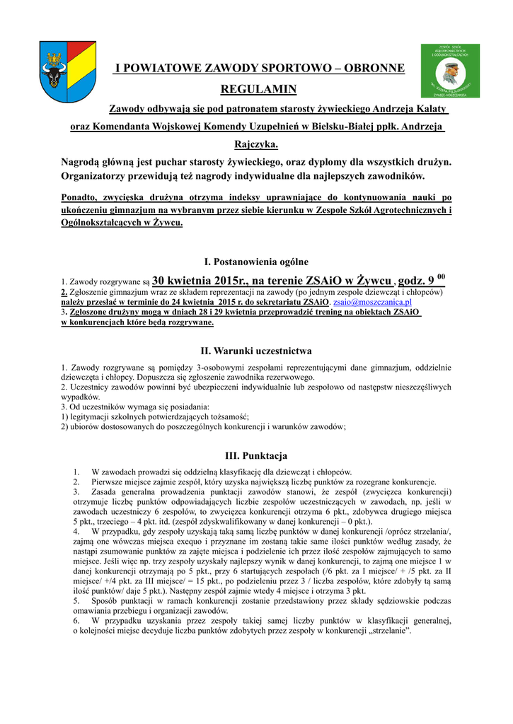 I POWIATOWE ZAWODY SPORTOWO – OBRONNE REGULAMIN Zawody odbywają się pod patronatem starosty żywieckiego Andrzeja Kalaty oraz Komendanta Wojskowej Komendy Uzupełnień w Bielsku-Białej ppłk. Andrzeja Rajczyka. Nagrodą główną jest puchar starosty żywieckiego, oraz dyplomy dla wszystkich drużyn. Organizatorzy przewidują też nagrody indywidualne dla najlepszych zawodników. Ponadto, zwycięska drużyna otrzyma indeksy uprawniające do kontynuowania nauki po ukończeniu gimnazjum na wybranym przez siebie kierunku w Zespole Szkół Agrotechnicznych i Ogólnokształcących w Żywcu. I. Postanowienia ogólne 00 1. Zawody rozgrywane są 30 kwietnia 2015r., na terenie ZSAiO w Żywcu , godz. 9 2. Zgłoszenie gimnazjum wraz ze składem reprezentacji na zawody (po jednym zespole dziewcząt i chłopców) należy przesłać w terminie do 24 kwietnia 2015 r. do sekretariatu ZSAiO. [email protected] 3. Zgłoszone drużyny mogą w dniach 28 i 29 kwietnia przeprowadzić trening na obiektach ZSAiO w konkurencjach które będą rozgrywane. II. Warunki uczestnictwa 1. Zawody rozgrywane są pomiędzy 3-osobowymi zespołami reprezentującymi dane gimnazjum, oddzielnie dziewczęta i chłopcy. Dopuszcza się zgłoszenie zawodnika rezerwowego. 2. Uczestnicy zawodów powinni być ubezpieczeni indywidualnie lub zespołowo od następstw nieszczęśliwych wypadków. 3. Od uczestników wymaga się posiadania: 1) legitymacji szkolnych potwierdzających tożsamość; 2) ubiorów dostosowanych do poszczególnych konkurencji i warunków zawodów; III. Punktacja 1. W zawodach prowadzi się oddzielną klasyfikację dla dziewcząt i chłopców. 2. Pierwsze miejsce zajmie zespół, który uzyska największą liczbę punktów za rozegrane konkurencje. 3. Zasada generalna prowadzenia punktacji zawodów stanowi, że zespół (zwycięzca konkurencji) otrzymuje liczbę punktów odpowiadających liczbie zespołów uczestniczących w zawodach, np. jeśli w zawodach uczestniczy 6 zespołów, to zwycięzca konkurencji otrzyma 6 pkt., zdobywca drugiego miejsca 5 pkt., trzeciego – 4 pkt. itd. (zespół zdyskwalifikowany w danej konkurencji – 0 pkt.). 4. W przypadku, gdy zespoły uzyskają taką samą liczbę punktów w danej konkurencji /oprócz strzelania/, zajmą one wówczas miejsca exequo i przyznane im zostaną takie same ilości punktów według zasady, że nastąpi zsumowanie punktów za zajęte miejsca i podzielenie ich przez ilość zespołów zajmujących to samo miejsce. Jeśli więc np. trzy zespoły uzyskały najlepszy wynik w danej konkurencji, to zajmą one miejsce 1 w danej konkurencji otrzymają po 5 pkt., przy 6 startujących zespołach (/6 pkt. za I miejsce/ + /5 pkt. za II miejsce/ +/4 pkt. za III miejsce/ = 15 pkt., po podzieleniu przez 3 / liczba zespołów, które zdobyły tą samą ilość punktów/ daje 5 pkt.). Następny zespół zajmie wtedy 4 miejsce i otrzyma 3 pkt. 5. Sposób punktacji w ramach konkurencji zostanie przedstawiony przez składy sędziowskie podczas omawiania przebiegu i organizacji zawodów. 6. W przypadku uzyskania przez zespoły takiej samej liczby punktów w klasyfikacji generalnej, o kolejności miejsc decyduje liczba punktów zdobytych przez zespoły w konkurencji „strzelanie”. IV. Konkurencje 1 . Rzut granatem: 1) każdy zawodnik wykonuje po 3 rzuty, poprzedzone rzutem próbnym, z którego można zrezygnować; 2) rzuty na celność wykonywane są z odległości: chłopcy 20m (dziewczęta 15 m), granatem F1 bez zapalnika, w pozycji stojącej do prostokąta 5x2 m z wykreślonym centralnie w nim prostokątem 2x1m; 3) liczy się miejsce upadku granatu. Upadek granatu na linii granicznej prostokąta zaliczany jest jako trafienie w cel wyżej punktowany; 4) do punktacji wlicza się wyniki każdego zawodnika, za każde celne trafienie przyznaje się odpowiednio: prostokąt 2x1 m – 3 pkt., prostokąt 5x2 m – 1 pkt. 2. Strzelanie: 1) zawodnik oddaje 3 strzały próbne oraz 5 strzałów konkursowych liczonych do punktacji ; 2) strzelanie z karabinka sportowego kbks, do tarczy sportowej (154,4 x 112,4), z odległości 50m, w pozycji leżącej z podpórką. 3) karabin z nabojami znajduje się na stanowisku strzeleckim; 4) każdy zawodnik może uzyskać do 50 pkt.; 5) w przypadku zdobycia przez zespoły takiej samej liczby pkt. o kolejności zespołu w klasyfikacji konkurencji decyduje większa liczba trafionych „10”, „9”, itd. 3. Marsz na orientację: Zespoły otrzymają 1 kartę startową i 1 standartową mapę do biegów na orientację, na której zaznaczone będą punkty w trzech strefach, do odnalezienia w terenie. Odnalezienie punktów należy potwierdzić na otrzymanej karcie startowej. Punkty oznaczone będą flagami /lub w inny sposób/. Uczestnicy startują i kończą bieg całym zespołem (liczy się czas przybycia ostatniego zawodnika zespołu). Czas trwania biegu – do 30 min. Za odnalezienie punktów kontrolnych w poszczególnych strefach zespoły uzyskają: w I strefie (najbliższej) po 1 pkt., w II strefie po 2 pkt., w III strefie (najdalszej) po 3 pkt. W razie przekroczenia limitu czasowego, zespół otrzyma 1 pkt. karny za każdą rozpoczętą minutę. Łączny czas biegu nie może przekroczyć 45 min., po tym czasie nastąpi dyskwalifikacja zespołu. Za błędne odnalezienie punktu kontrolnego – niezaznaczonego na mapie zespół otrzyma 2 pkt. karne. W przypadku zdobycia jednakowej liczby punktów o kolejności decyduje czas zakończenia konkurencji. 4. Sztafeta strażacka Konkurencja zespołowa, na czas mierzony od sygnału startu dla pierwszego zawodnika do zakończenia konkurencji przez trzeciego zawodnika. Zawodnicy pokonują przeszkody z prądownicą (może być zatknięta za pasek), którą przekazują następnemu zawodnikowi. Zawodnik, który zgubił prądownicę musi swój bieg rozpocząć od nowa. Czas mierzy sędzia konkurencji. Przeszkody należy pokonywać prawidłowo, w przypadku błędu pokonujemy przeszkodę do skutku. Pokonanie 