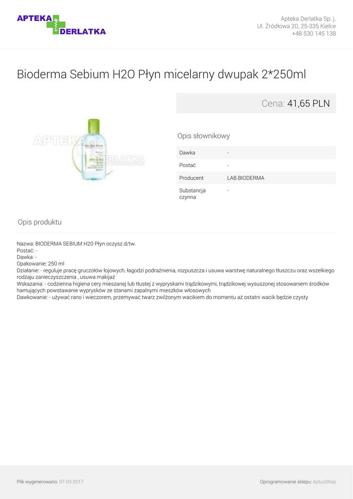 Apteka Derlatka Sp. j. Ul. Źródłowa 20, 25-335 Kielce +48 530 145 138 Bioderma Sebium H2O Płyn micelarny dwupak 2*250ml Cena: 41,65 PLN Opis słownikowy Dawka - Postać - Producent LAB.BIODERMA Substancja czynna - Opis produktu Nazwa: BIODERMA SEBIUM H20 Płyn oczysz.d/tw. Postać: Dawka: Opakowanie: 250 ml Działanie: - reguluje pracę gruczołów łojowych, łagodzi podrażnienia, rozpuszcza i usuwa warstwę naturalnego tłuszczu oraz wszelkiego rodzaju zanieczyszczenia , usuwa makijaż Wskazania: - codzienna higiena cery mieszanej lub tłustej z wypryskami trądzikowymi, trądzikowej wysuszonej stosowaniem środków hamujących powstawanie wyprysków ze stanami zapalnymi mieszków włosowych Dawkowanie: - używać rano i wieczorem, przemywać twarz zwilżonym wacikiem do momentu aż ostatni wacik będzie czysty Plik wygenerowano: 07-03-2017 Powered by TCPDF (www.tcpdf.org) Oprogramowanie sklepu: AptusShop