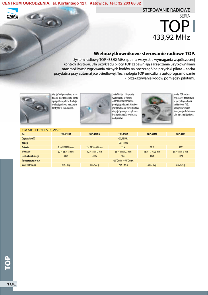 STEROWANIE RADIOWE SERIA AUTOMATYKA DO BRAM TOP 433,92 MHz Wieloużytkownikowe sterowanie radiowe TOP. System radiowy TOP 433,92 MHz spełnia wszystkie wymagania współczesnej kontroli dostępu. Dla przykładu piloty TOP zapewniają zarządzanie użytkownikami oraz możliwość wgrywania różnych kodów na poszczególne przyciski pilota – cecha przydatna przy automatyce osiedlowej. Technologia TOP umożliwia autoprogramowanie - przekazywanie kodów pomiędzy pilotami. Wersja TOP pozwala na przypisanie innego kodu na każdy z przycisków pilota. Funkcja wieloużytnikowa jest zatem dostępna w standardzie. Seria TOP jest fabrycznie wyposażona w funkcję AUTOPROGRAMOWANIA pomiędzy pilotami. Możliwe jest przypisanie wielu pilotów do pojedynczego urządzenia bez konieczności otwierania nadajników. Model TOP można wyposażyć dodatkowo w specjalny nadajnik zbliżeniowy TAG. Nadajnik wówczas funkcjonuje dodatkowo jako karta zbliżeniowa. DA N E T EC HNIC Z N E Typ TOP-432NA TOP-434NA TOP-432M Częstotliwość TOP-434M TOP-432S 433,92 MHz 50÷150 m Zasięg Baterie 2 × CR2016 litowe 2 × CR2016 litowe 12 V 12 V 12 V Wymiary 32 × 68 × 13 mm 40 × 85 × 12 mm 58 × 113 × 23 mm 58 × 113 × 23 mm 31 × 65 × 15 mm 4096 4096 1024 1024 1024 ABS / 45 g ABS / 25 g Liczba kombinacji Temperatura pracy Materiał/waga -20°C min. +55°C max. ABS / 16 g ABS / 22 g ABS / 44 g T O P 4 33,92 MH Z: KOMPL E T N A S ERI A C EN Y NE T T O/ B RU T T O P L N Pilot dwukanałowy. TOP-432NA 85,00 / 104,55 Pilot czterokanałowy. TOP-434NA 95,00 / 116,85 Karta częstotliwości stosowana wyłącznie w płytach i centralach sterujących CAME. AF43S 75,00 / 92,25 Antena radiowa. TOP-A433N 55,00 / 67,65 Transponder, można go zainstalować w pilotach: ATOMO/TOP-432NA/TOP-434NA. TAG 35,00 / 43,05 Wieloużytkownikowa karta częstotliwości z pamięcią EPROM zapamiętującą do 128 różnych kodów stosowana wyłącznie w płytach i centralach sterujących CAME. AF43SM 200,00 / 246,00 Przewód antenowy. Cena za metr bieżący. TOP-RG58 3,50 / 4,31 Radio uniwersalne dwukanałowe stosowane do sterowania obcymi urządzeniami. IP54 12 V - 24 V A.C./D.C. RE432 180,00 / 221,40 Wymiary: 108 × 46 × 23 mm Waga: 65 g - Materiał: ABS Komplet baterii Litowych 2 × 3 V D.C. CR2016. P3V 10,00 / 12,30 Pilot dwukanałowy. TOP-432A 95,00 / 116,85 TOP Pilot czterokanałowy. TOP-434A 95,00 / 116,85 100 Radio uniwersalne czterokanałowe stosowane do sterowania obcymi urządzeniami, nie zawiera karty częstotliwości. IP54 12 V-24 V A.C./D.C. RBE4N 250,00 / 307,50 Pilot dwukanałowy. TOP-432S 80,00 / 98,40 Radio uniwersalne czterokanałowe stosowane do sterowania obcymi urządzeniami, nie zawiera karty częstotliwości. IP54 230 V A.C. RBE41 280,00 / 344,40 Wymiary: 225 × 115 × 87 mm - Waga: 520 g - Materiał: ABS