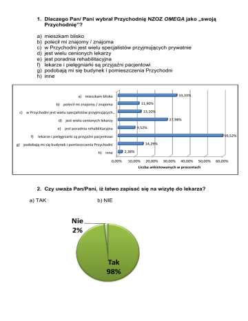 1. Dlaczego Pan/ Pani wybrał Przychodnię NZOZ OMEGA jako „swoją Przychodnię”? a) b) c) d) e) f) g) h) mieszkam blisko polecił mi znajomy / znajoma w Przychodni jest wielu specjalistów przyjmujących prywatnie jest wielu cenionych lekarzy jest poradnia rehabilitacyjna lekarze i pielęgniarki są przyjaźni pacjentowi podobają mi się budynek i pomieszczenia Przychodni inne 33,33% a) mieszkam blisko 11,90% b) polecił mi znajomy / znajoma 13,10% c) w Przychodni jest wielu specjalistów przyjmujących… 27,98% d) jest wielu cenionych lekarzy 9,52% e) jest poradnia rehabilitacyjna 59,52% f) lekarze i pielęgniarki są przyjaźni pacjentowi 14,29% g) podobają mi się budynek i pomieszczenia Przychodni h) inne 0,00% 2,38% 10,00% 20,00% 30,00% 40,00% 50,00% Liczba ankietowanych w procentach 2. Czy uważa Pan/Pani, iż łatwo zapisać się na wizytę do lekarza? a) TAK b) NIE Nie 2% Tak 98% 60,00% 3. Czy korzysta Pan/Pani z usług poradni rehabilitacyjnej? a) TAK b) NIE Tak 19% Nie 81% Czy jest Pan/Pani zadowolona z tych usług? a) TAK b) NIE Odpowiedzi wśród tych osób, które korzystają z usług poradni rehabilitacyjnej. Nie 0% Tak 100% 4. Jak ocenia Pan/Pani jakość kontaktów telefonicznych? a) bardzo dobra c) przeciętna b) zadowalająca d) wymagająca poprawy przeciętna 5% wymagająca poprawy 1% zadowalająca 19% bardzo dobra 75% 5. Czy jest Pan/ Pani zadowolona z usług świadczonych przez panie rejestratorki? a) TAK b) NIE Nie 2% Tak 98% 6. Czy jest Pan/ Pani zadowolona z opieki pielęgniarskiej? a) TAK b) NIE Nie 1% Tak 99% 7. Czy jest Pan/ Pani zadowolona z opieki lekarskiej? a) TAK b) NIE Tak 97% Nie 3% 8. Czy poleciłby Pan/ Pani znajomym naszą Placówkę jako „Przychodnię przyjazną Pacjentowi”? a) TAK b) NIE Nie 3% c) NIE WIEM Nie wiem 1% Tak 96%