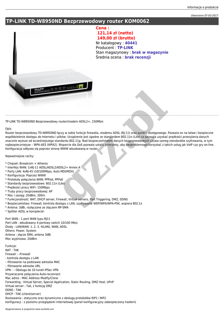 Informacje o produkcie Utworzono 07-03-2017 TP-LINK TD-W8950ND Bezprzewodowy router KOM0062 Cena : 121,14 zł (netto) 149,00 zł (brutto) .p l Nr katalogowy : 40441 Producent : TP-LINK Stan magazynowy : brak w magazynie Średnia ocena : brak recenzji TP-LINK TD-W8950ND Bezprzewodowy router/modem ADSL2+, 150Mb/s gz z Opis Router bezprzewodowy TD-W8950ND łączy w sobie funkcje firewalla, modemu ADSL (RJ-11) oraz punktu dostępowego. Pozwala on na łatwe i bezpieczne współdzielenie dostępu do Internetu i plików. Urządzenie jest zgodne ze standardem 802.11n (Lite) co pozwala uzyskać prędkości przesyłania danych znacznie wyższe od wcześniejszego standardu 802.11g. Nad bezpieczeństwem danych bezprzewodowych czuwa szereg standardów szyfrowania, w tym najbezpieczniejsze – WPA-AES (WPA2). Wsparcie dla QoS pozwala ustalić priorytety, aby bezproblemowo korzystać z takich usług jak VoIP czy gry on-line. Konfiguracja odbywa się poprzez stronę WWW wbudowaną w router. Najważniejsze cechy: * Chipset: Broadcom + Atheros * Interfejs WAN: 1xRJ-11 ADSL/ADSL2/ADSL2+ Annex A * Porty LAN: 4xRJ-45 (10/100Mbps, Auto MDI/MDX) * Konfiguracja: Poprzez WWW * Protokoły połączenia WAN: PPPoA, PPPoE * Standardy bezprzewodowe: 802.11n (Lite) * Prędkości pracy WiFi: 150Mbps * Tryby pracy bezprzewodowej: AP * Moc i zasięg: 20dBm, 300m * Funkcjonalność: NAT, DHCP server, Firewall, Virtual servers, Port Triggering, DMZ, DDNS * Bezpieczeństwo: Firewall, kontrola dostępu z LAN, szyfrowanie WEP/WPA/WPA-PSK, wspiera 802.1x * Antena: 3dBi, rozłączane ze złączem RP-SMA * Splitter ADSL w komplecie! Port WAN : 1 port WAN typu RJ11 Port LAN : wbudowany 4-portowy switch 10/100 Mb/s Diody : LAN/WAN: 1, 2, 3, 4(LAN), WAN, ADSL Others: Power, System Antena : złącze SMA, antena 3dBi Moc wyjśniowa: 20dBm Funkcje: NAT : TAK Firewall : –Firewall - kontrola dostępu z LAN – filtrowanie na podstawie adresów MAC – filtrowanie adresów URL VPN : – Obsługa do 10 tuneli IPSec VPN Przywracanie połączenia Auto-reconnect Mac adres : MAC Address Modify/Clone Forwarding : Virtual Server, Special Application, Static Routing, DMZ Host, UPnP Virtual server : Tak, z funkcją DMZ DDNS : TAK DHCP : TAK (client/server) Routowania : statyczne oraz dynamiczne z obsługą protokołów RIP1 i RIP2 konfiguracji : z poziomu przeglądarki internetowej (panel konfiguracyjny zabezpieczony hasłem) Wygenerowano w programie www.oscGold.com Oprogramowanie: Firmware : Możliwość upgrade firmware z poziomu strony konfiguracyjnej Dane fizyczne: Wymiary : 186×146×44 mm Temperatura pracy :0÷40 stopni C Wsparcie Techniczne: Gwarancja : 2 lata pełnej gwarancji Door-To-Door Pomoc techniczna : Przez Telefon, e-Mail, WWW Instrukcja Obsługi Instrukcja instalacji i obsługi Dzięki tej książeczce, nawet jeśli nie masz dużego doświadczenia w pracy z komputerem, z łatwością podłączysz i uruchomisz router. Instrukcja przeprowadzi cię krok po kroku przez cały proces instalacji. gz z .p l Zawartość Pudełka 1. Router TD-W8950ND 2. Zasilacz 3. Kabel sieciowy "na wprost" 4. Kabel telefoniczny 5. splitter do podziału linii telefon/modem 6. Płyta CD z dodatkowym oprogramowaniem i oryginalną instrukcją 7. Instrukcja instalacji i obsługi 8. Płyta CD
