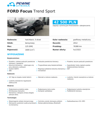 FORD Focus Trend Sport 42 500 PLN Zapytaj o promocyjne finansowanie i ubezpieczenie. Nadwozie: hatchback, 5 drzwi Kolor nadwozia: grafitowy metaliczny Silnik: benzynowy Rocznik: 2012 Moc: 125 [KM] Przebieg: 76386 km Pojemność: 1600 [cm ] Numer oferty: hu13322 3 WYPOSAŻENIE Bezpieczeństwo: Przednie, czołowe poduszki powietrzne (kierowcy i pasażera) Kolumna kierownicy – załamująca się przy zderzeniu czołowym System ISOFIX ABS Poduszka powietrzna kierowcy Przednie, boczne poduszki powietrzne Trzypunktowe pasy bezpieczeństwa Sygnalizator braku zapięcia pasów bezpieczeństwa kierowcy ESP Regulacja położenia kolumny kierownicy Immobilizer Nadwozie: 16" felgi ze stopów metali lekkich Zderzaki w kolorze nadwozia Lusterka i klamki zewnętrzne w kolorze nadwozia Podgrzewana tylna szyba Komputer pokładowy Podgrzewane lusterka zewnętrzne Podłokietnik kierowcy Centralny zamek sterowany pilotem Zestaw głośnomówiący Bluetooth Radioodtwarzacz CD / MP3 Lusterka zewnętrzne regulowane elektrycznie Wnętrze: Podgrzewana przednia szyba Klimatyzacja manualna Kierownica i dźwignia zmiany biegów pokryte skórą Technologia: Wspomaganie układu kierowniczego Sterowanie systemem audio przyciskami na kierownicy FORD Focus Trend Sport DODATKOWE INFORMACJE: Sprzedajemy tylko pewne samochody używane, stan techniczny weryfikujemy w naszym autoryzowanym serwisie Ford / Nissan / Suzuki / Hyundai / Seat Możliwość zakupu dodatkowej gwarancji : Wariant STANDARD Wariant COMFORT Finansowanie -Możliwość finansowania pojazdu poprzez kredyt lub leasing Ubezpieczenia -Pakiety dealerskie ubezpieczeń komunikacyjnych Zapraszamy dosalonu! SALON CZYNNY ODPONIEDZIAŁKU DO PIĄTKU 9-19 W SOBOTY 10-15 Pewne Używane Kraków Jasnogórska 60 ul. Jasnogórska 60, tel.:12 662 00 02 www.blog.pgd.pl Nota prawna Dane zawarte w niniejszej propozycji handlowej mają wyłącznie charakter informacyjny. Podane informacje nie stanowią oferty ani zapewnienia, w szczególności w rozumieniu art. 66 § 1 oraz art. 5561 Kodeksu cywilnego. Wiążące ustalenie ceny, wyposażenia oraz specyfikacji samochodu następuje w pisemnej umowie sprzedaży/zamówienia samochodu. Ze względu na ograniczenia techniczne (np. odwzorowanie kolorów przez monitor lub sposób wydruku), kolory przedstawione w niniejszej propozycji handlowej mogą się różnić od rzeczywistych kolorów nadwozia i tapicerki. Niniejsza propozycja handlowa oraz wszelkie załączniki z nią związane są poufne i nie mogą być przekazywane osobom trzecim. Prezentowane zdjęcia mogą zawierać wyposażenie opcjonalne (akcesoryjne), dodatkowo płatne. Warunki oferty maja charakter orientacyjny i mogą zostać zmienione w momencie uaktualnienia cen lub warunków promocji.