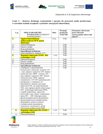 Załącznik nr 2 do Zapytania ofertowego Część 2 – dostawa drobnego wyposażenia i sprzętu do pracowni nauki praktycznej w zawodzie technik urządzeń i systemów energetyki odnawialnej L.p. 1. A. B. C. 2. A. B. C. 3. A. OPIS /PARAMETRY WYMAGANE ELEMNETY WYPOSAŻENIA Ogniwo fotowoltaiczne polikrystaliczne 50 W (panel słoneczny) Oferent/Producent Nazwa i model Kraj pochodzenia Specyfikacja techniczna rama aluminiowa, napięcie 12 V Regulator ładowania 12/24V 30A wyświetlacz LCD Oferent/Producent Nazwa i model Kraj pochodzenia Specyfikacja techniczna współpraca z akumulatorami kwasowymi i żelowymi, systemy 12V - max napięcie wejściowe 24V, bateria słoneczna max 360W ; systemy 24V max napięcie wejściowe 48V, bateria słoneczna max 720W, napięcie znamionowe 12V/24V (automatycznie przełączane w zależności od akumulatora i panela), max prąd ładowania 30A, mx prąd obciążenia 30A, max napięcie panela słonecznego 48V, technologia ładowania PWM, czujnik temperatury, złącza dla przewodów max 16mm2, temperatura pracy10C - +60C Zabezpieczenia: przed przeładowaniem akumulatora, przed nadmiernym rozładowaniem akumulatora, przed zwrotnym rozładowaniem akumulatora, zwarciowe, rozwarciowe, przed odwrotnym podłączeniem kabli Regulator ładowania 20A 12/24V + wyświetlacz LED Oferent/Producent Ilość 4 szt. 1 szt. Wymogi graniczne TAK/NIE Parametry oferowane przez oferenta /proszę podać zakres lub opisać? TAK TAK TAK TAK TAK TAK TAK TAK TAK TAK TAK TAK 1 szt. TAK TAK 1 B. C. 4. A. B. C. 5. A. B. C. Nazwa i model Kraj pochodzenia Specyfikacja techniczna do systemów 12V oraz 24V (automatyczne rozpoznawania), możliwość ładowania dwóch akumulatorów o różnej pojemności (tego samego typu), opcja priorytetu ładowania - wybór ile procent mocy regulator ma skierować do danego akumulatora, wyświetlacz LCD, możliwość wyboru typu akumulatora (żelowy, szczelny, z płynnym elektrolitem), kompensacja temperaturowa, wbudowane zabezpieczenia przed przeładowaniem, przeciążeniem, zwarciem, przeznaczony do niewielkich systemów solarnych o mocy do 340W (12V) lub 680W (24V) Maksymalny prąd 20A Zakres temperatur pracy 35℃ do +55℃ Zabezpieczenia: temperaturowe, przed przeładowaniem przeciwzwarciowe, przed odwróconą 1 szt. Regulator elektrowni wiatrowej sterownik Oferent/Producent Nazwa i model Kraj pochodzenia Specyfikacja techniczna wyświetlacz lcd zasilanie sterownika 12VDC (zakres 10-15VDC), wejście maksymalnie 30VDC, maksymalne obciążenie 30A 30V, obciążenie przekaźników remote, przetwornica i obroty max 2A 230V, wyświetlacz lcd z podświetleniem, menu w języku polskim temperatura pracy 0 do +30C 2 szt. Przetwornica (inwentor) 1300/2000W 12V Oferent/Producent Nazwa i model Kraj pochodzenia Specyfikacja techniczna Zakres napięcia wejściowego: 11-15 VDC Prąd bez obciążenia: < 300mA , moc ciągła do: 1300W, moc chwilowa (impuls): 2000W , napięcie wyjściowe: 220V-240V, częstotliwość: 50Hz±0.5, sprawność TAK TAK TAK TAK TAK TAK TAK TAK TAK TAK TAK TAK TAK TAK TAK 2 6. A. B. C. 7. A. B. C. 8. A. B. C. 9. A. B. C. 10. A. B. C. min 82%, zabezpieczenie przeciążeniowe,· Zabezpieczenie przed zwarciem: (automatyczne wyłączenie) zabezpieczenie przed zbyt niskim napięciem Akumulator żelowy do systemów solarnych pojemność min 26Ah Oferent/Producent Nazwa i model Kraj pochodzenia Specyfikacja techniczna Akumulator żelowy do systemów solarnych pojemność min 33Ah Oferent/Producent Nazwa i model Kraj pochodzenia Specyfikacja techniczna Sterownik trakera Oferent/Producent Nazwa i model Kraj pochodzenia Specyfikacja techniczna do śledzenia słońca w osi w-z zasilanie sterownika 12VDC (1113VDC), pobór prądu w stanie czuwania do 20mA, a w stanie załączonego przekaźnika do 100mA, zasilanie siłowników maksymalnie 50V 4A, hermetyczna obudowa, możliwość kalibracji Siłownik liniowy elektryczny 200mm 12V Oferent/Producent Nazwa i model Kraj pochodzenia Specyfikacja techniczna moc silnika min 50W, prędkość wysuwu min 7,5mm/s, wyłąccnik krańcowy wewnętrzny, obciążenie min 300kg temperatura pracy min 2565 0 Siłownik liniowy elektryczny 460mm 12V Oferent/Producent Nazwa i model Kraj pochodzenia Specyfikacja techniczna 2 szt. TAK TAK TAK TAK TAK 2 szt. TAK TAK TAK TAK TAK 1 szt. TAK TAK TAK TAK TAK 2 szt. TAK TAK TAK TAK TAK 2 szt. TAK TAK TAK TAK 3 11. A. B. C. 12. A. B. C. 13. A. B. C. 14. A. B. C. 15. A. B. C. 16. A. B. C. 17. moc silnika min 50W, prędkość wysuwu min 7,5mm/s, wyłąccnik krańcowy wewnętrzny, obciążenie min 300kg temperatura pracy min 2565 0 Kaseton reklamowy jednostronny led Oferent/Producent Nazwa i model Kraj pochodzenia Specyfikacja techniczna Wymiary 100x50mm z logo (zgodnie z projektem uzgodnionym z Zamawiającym ) z czujnikiem zmierzchu do kasetonu Kabel solarny czerwony BCSUN PV1-F 50 mb Oferent/Producent Nazwa i model Kraj pochodzenia Specyfikacja techniczna średnica 4mm2 Wtyki przyłączeniowe MC4 kpl Oferent/Producent Nazwa i model Kraj pochodzenia Specyfikacja techniczna do 4mm2 Wtyki przyłączeniowe do łączenia równoległego MC4 męski Oferent/Producent Nazwa i model Kraj pochodzenia Specyfikacja techniczna do 4mm2 Wtyki przyłączeniowe do łączenia równoległego MC4 żeński Oferent/Producent Nazwa i model Kraj pochodzenia Specyfikacja techniczna do 4mm2 Kabel solarny czarny 4mm BCSUN PV1-F 50 mb Oferent/Producent Nazwa i model Kraj pochodzenia Specyfikacja techniczna średnica 4mm2 Oświetlacz zewnętrzny LED 50W TAK 1 szt. TAK TAK TAK TAK TAK 1 szt. TAK TAK TAK TAK TAK 12 szt. TAK TAK TAK TAK TAK 12 szt. TAK TAK TAK TAK TAK 12 szt. TAK TAK TAK TAK TAK 1 szt. TAK TAK TAK TAK TAK 5 szt. 4 A. B. C. 18. A. B. C. 19. A. B. C. 20. A. B. C. 21. A. B. C. 12V Oferent/Producent Nazwa i model Kraj pochodzenia Specyfikacja techniczna Matryca diodowa o mocy 20W Jasność: 1550 - 1650 lm, Napięcie zasilania: 12V DC, barwa światła: zimno biała (5000-6000K), obudowa metalowa kolor czarny Ster