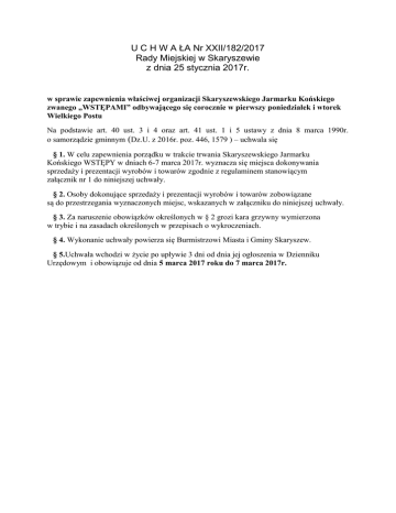 U C H W A ŁA Nr XXII/182/2017 Rady Miejskiej w Skaryszewie z dnia 25 stycznia 2017r. w sprawie zapewnienia właściwej organizacji Skaryszewskiego Jarmarku Końskiego zwanego „WSTĘPAMI” odbywającego się corocznie w pierwszy poniedziałek i wtorek Wielkiego Postu Na podstawie art. 40 ust. 3 i 4 oraz art. 41 ust. 1 i 5 ustawy z dnia 8 marca 1990r. o samorządzie gminnym (Dz.U. z 2016r. poz. 446, 1579 ) – uchwala się § 1. W celu zapewnienia porządku w trakcie trwania Skaryszewskiego Jarmarku Końskiego WSTĘPY w dniach 6-7 marca 2017r. wyznacza się miejsca dokonywania sprzedaży i prezentacji wyrobów i towarów zgodnie z regulaminem stanowiącym załącznik nr 1 do niniejszej uchwały. § 2. Osoby dokonujące sprzedaży i prezentacji wyrobów i towarów zobowiązane są do przestrzegania wyznaczonych miejsc, wskazanych w załączniku do niniejszej uchwały. § 3. Za naruszenie obowiązków określonych w § 2 grozi kara grzywny wymierzona w trybie i na zasadach określonych w przepisach o wykroczeniach. § 4. Wykonanie uchwały powierza się Burmistrzowi Miasta i Gminy Skaryszew. § 5.Uchwała wchodzi w życie po upływie 3 dni od dnia jej ogłoszenia w Dzienniku Urzędowym i obowiązuje od dnia 5 marca 2017 roku do 7 marca 2017r. Załącznik Nr 1 do uchwały Nr XXII/182/2017 Rady Miejskiej w Skaryszewie z dnia 25 stycznia 2017r. REGULAMIN SKARYSZEWSKIEGO JARMARKU KOŃSKIEGO ZWANEGO „WSTĘPAMI” w dniach 6 i 7 marca 2017r. § 1. Jarmark odbywał się będzie: 1) Na ulicy Mickiewicza – sprzedaż wyrobów z drewna, wikliny i rękodzieł ludowych – miejsca rezerwowane wyłącznie przez organizatora jarmarku. 2) Na ulicy Partyzantów i Wyszyńskiego – sprzedaż artykułów do produkcji rolnej, wyrobów rymarskich, artykułów przemysłowych i spożywczych oraz mała gastronomia. 3) Opłatę targową od osób handlujących pobierał będzie inkasent. 4) Uchylanie się od wniesienia należnej opłaty targowej, wyliczonej na podstawie długości stoiska wzdłuż alei handlowej i obowiązującej stawki za 1 m bieżący, skutkować będzie zablokowaniem lub jego usunięciem. § 2. 1. Wokół estrady, na skrzyżowaniu ulic Wyszyńskiego i Partyzantów obowiązuje całkowity zakaz ruchu i handlu. 2. Na ulicy Młynarskiej obowiązuje całkowity zakaz ruchu z wyłączeniem samochodów wjeżdżających na targowisko. 3. Miejsce postoju – ul. Sienkiewicza. służb medycznych oraz zabezpieczenia przeciwpożarowego § 3. Pokazy koni odbywać się będą na wygrodzonym parkingu przy ulicy Zachodniej (przy cmentarzu). § 4. Prezentacja koni - Miejsko – Gminne Targowisko przy ul. Krasickiego 13. § 5. 1. Wjazd z końmi na teren Miejsko-Gminnego Targowiska w Skaryszewie rozpocznie się od godziny 5 00 dnia 06 marca 2017r. 2. Dzień pierwszy 6 marca 2017 r. / poniedziałek / - od godz. 500: 1) Klacze, ogiery, wałachy i źrebięta ras zimnokrwistych oraz wszystkie konie w typie zimnokrwistym i pogrubionym hodowane na terenie Polski zgodnie z informacją o rasie i typie rasowym zawartą w paszporcie koni. 2) Wszystkie konie zagranicznych ras zimnokrwistych dla których PZHK nie prowadzi ksiąg hodowlanych. 3. Dzień drugi 7 marca 2017 r. /wtorek/ - od godz. 500: 1) Klacze, ogiery, wałachy i źrebięta ras szlachetnych (małopolska, wielkopolska szlachetnej półkrwi, śląska). 2) Klacze ogiery, wałachy i źrebięta rasy huculskiej i konik polski. 3) Klacze , ogiery, wałachy i źrebięta wszystkich ras kuców i koni małych. 4) Wszystkie konie w typie szlachetnym, typie prymitywnym, typie kuca zgodnie z informacją o typie rasowym zawartą w paszporcie konia. 5) Wszystkie konie rasy czystej krwi arabskiej i pełnej krwi angielskiej. 6) Wszystkie konie ras szlachetnych, prymitywnych i kuców, dla których PZHK nie prowadzi ksiąg hodowlanych. 7) Osły , muły , osłomuły. § 6.1. Wszystkie koniowate muszą być zaopatrzone w paszport, a te zidentyfikowane od 1 lipca 2009 roku muszą posiadać transponder. 2.Paszporty będą sprawdzane przez Inspektorów ds. kontroli paszportów i lekarzy weterynarii w specjalnej strefie weterynaryjnej, odprawy koni, kontroli paszportów i chipów. 3.Zwierzęta nie posiadające paszportów nie będą wpuszczone na teren jarmarku. 4.Kontroli zwierząt dokonują tylko i wyłącznie osoby do tego uprawnione. § 7.Wyładunek i załadunek koni odbywał się będzie tylko w miejscach wyznaczonych do tego celu, na rampach załadowczych na terenie Miejsko-Gminnego Targowiska przy ul. Krasickiego 13. § 8.Punkt weterynaryjny zlokalizowany będzie przy wjeździe na Miejsko-Gminne Targowisko w Skaryszewie przy ul. Krasickiego 13. W punkcie weterynaryjnym oprócz ochrony mogą znajdować się tylko i wyłącznie osoby uprawione do kontroli. § 9.Opłata od wwiezionego jednego konia lub źrebaka wynosi – 40 zł. Powyższa opłata pobierana będzie przez inkasentów w specjalnej strefie weterynaryjnej. § 10.Zabrania się prezentacji i pokazów zwierząt poza wyznaczonym terenem. § 11.Zobowiązuje się wszystkich do należytego traktowania zwierząt, szczególnie w trakcie ich załadunku i transportu. §12.Zobowiązuje się wszystkich do reagowania na złe traktowanie zwierząt, poprzez przekazanie informacji Powiatowemu Lekarzowi Weterynarii (48 362 78 49), Komisariatowi Policji w Skaryszewie (48 345 37 20, 48 345 37 21), organizatorowi (48 610 30 89) i do punktu weterynarii na Miejsko-Gminnym Targowisku przy ul. Krasickiego 13. §13.Samochody pozostawione w miejscach innych niż wyznaczone lub z naruszeniem powszechnie obowiązujących przepisów kodeksu drogowego zostaną odholowane na wyznaczony do tego parking. §14.Zobowiązuje się wszystkich uczestników targu do przestrzegania regulaminu i do utrzymania porządku i ładu publicznego.