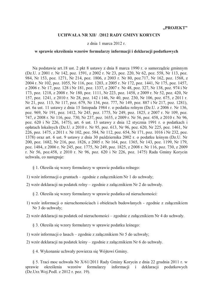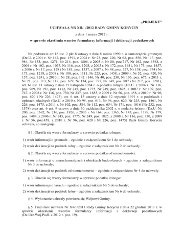 „PROJEKT” UCHWAŁA NR XII/ /2012 RADY GMINY KORYCIN z dnia 1 marca 2012 r. w sprawie określenia wzorów formularzy informacji i deklaracji podatkowych Na podstawie art.18 ust. 2 pkt 8 ustawy z dnia 8 marca 1990 r. o samorządzie gminnym (Dz.U. z 2001 r. Nr 142, poz. 1591, z 2002 r. Nr 23, poz. 220, Nr 62, poz. 558, Nr 113, poz. 984, Nr 153, poz. 1271, Nr 214, poz. 1806, z 2003 r. Nr 80, poz.717, Nr 162, poz. 1568, z 2004 r. Nr 102, poz. 1055, Nr 116, poz. 1203, z 2005 r. Nr 172, poz. 1441, Nr 175, poz. 1457, z 2006 r. Nr 17, poz. 128 i Nr 181, poz. 1337, z 2007 r. Nr 48, poz. 327, Nr 138, poz. 974 i Nr 173, poz. 1218, z 2008 r. Nr 180, poz. 1111, Nr 223, poz. 1458, z 2009 r. Nr 52, poz. 420, Nr 157, poz. 1241, z 2010 r. Nr 28, poz. 142 i 146, Nr 40, poz. 230, Nr 106, poz. 675, z 2011 r. Nr 21, poz. 113, Nr 117, poz. 679, Nr 134, poz. 777, Nr 149, poz. 887 i Nr 217, poz. 1281), art. 6a ust. 11 ustawy z dnia 15 listopada 1984 r. o podatku rolnym (Dz.U. z 2006 r. Nr 136, poz. 969, Nr 191, poz. 1412, Nr 245, poz. 1775, Nr 249, poz. 1825, z 2007 r. Nr 109, poz. 747, z 2008 r. Nr 116, poz. 730, Nr 237, poz. 1655, z 2009 r. Nr 56, poz. 458, z 2010 r. Nr 96, poz. 620 i Nr 226, 1475), art. 6 ust. 13 ustawy z dnia 12 stycznia 1991 r. o podatkach i opłatach lokalnych (Dz.U. z 2010 r. Nr 95, poz. 613, Nr 96, poz. 620, Nr 225, poz. 1461, Nr 226, poz. 1475, z 2011 r. Nr 102, poz. 584, Nr 112, poz. 654, Nr 171, poz. 1016 i Nr 232, poz. 1378) oraz art. 6 ust. 9 ustawy z dnia 30 października 2002 r. o podatku leśnym (Dz.U. Nr 200, poz. 1682, Nr 216, poz. 1826, z 2005 r. Nr 164, poz. 1365, Nr 143, poz. 1199, Nr 179, poz. 1484, z 2006 r. Nr 245, poz. 1775, Nr 249, poz. 1825, z 2008 r. Nr 116, poz. 730, z 2009 r. Nr 56, poz.458, z 2010 r. Nr 96, poz. 620 i Nr 226, poz. 1475) Rada Gminy Korycin uchwala, co następuje: § 1. Określa się wzory formularzy w sprawie podatku rolnego: 1) wzór informacji o gruntach – zgodnie z załącznikiem Nr 1 do uchwały; 2) wzór deklaracji na podatek rolny – zgodnie z załącznikiem Nr 2 do uchwały. § 2. Określa się wzory formularzy w sprawie podatku od nieruchomości: 1) wzór informacji o nieruchomościach i obiektach budowlanych - zgodnie z załącznikiem Nr 3 do uchwały; 2) wzór deklaracji na podatek od nieruchomości – zgodnie z załącznikiem Nr 4 do uchwały. § 3. Określa się wzory formularzy w sprawie podatku leśnego: 1) wzór informacji o lasach – zgodnie z załącznikiem Nr 5 do uchwały; 2) wzór deklaracji na podatek leśny – zgodnie z załącznikiem Nr 6 do uchwały. § 4. Wykonanie uchwały powierza się Wójtowi Gminy. § 5. Traci moc uchwała Nr X/61/2011 Rady Gminy Korycin z dnia 22 grudnia 2011 r. w sprawie określenia wzorów formularzy informacji i deklaracji podatkowych (Dz.Urz.Woj.Podl. z 2012 r. poz. 19). 2 § 6. Uchwała wchodzi w życie po upływie 14 dni od dnia ogłoszenia w Dzienniku Urzędowym Województwa Podlaskiego. Załącznik Nr 1 do uchwały Nr XII/ /2012 Rady Gminy Korycin z dnia 1 marca 2012r. 1. Identyfikator Podatkowy (NIP lub PESEL) składającego informację IG – 1 INFORMACJA O GRUNTACH Podstawa prawna: Ustawa z dnia 15 listopada 1984 r. o podatku rolnym ( Dz.U. z 2006 r. Nr 136, poz. 969 z późn. zm.) Składający: Formularz przeznaczony dla osób fizycznych będących właścicielami gruntów, posiadaczami samoistnymi gruntów, użytkownikami wieczystymi gruntów, posiadaczami gruntów na podstawie umowy zawartej stosownie do przepisów o ubezpieczeniu społecznym rolników oraz posiadaczami gruntów stanowiących własność Skarbu Państwa lub jednostki samorządu terytorialnego. Termin składania: W terminie 14 dni od dnia zaistnienia okoliczności mających wpływ na powstanie, albo wygaśnięcie obowiązku podatkowego lub zaistnienia zdarzenia mającego wpływ na wysokość podatku. Organ podatkowy właściwy ze względu na miejsce położenia gruntów – Wójt Gminy Korycin A. MIEJSCE SKŁADANIA INFORMACJI 3. Wójt Gminy Korycin Adres : 16-140 Korycin ul. Knyszyńska 2a B. DANE IDENTYFIKACYJNE SKŁADAJĄCEGO INFORMACJĘ 4. Rodzaj własności, posiadania (zaznaczyć właściwy kwadrat) q 1. właściciel q 2. współwłaściciel q 3. posiadacz samoistny q 4. współposiadacz samoistny q 6. współużytkownik wieczysty q 7. posiadacz q 8. współposiadacz 5. Miejsce/a (adres/y) położenia przedmiotów opodatkowania oraz numer/y działek q 5. użytkownik wieczysty 6. Numer/y księgi wieczystej lub zbioru/ów dokumentów 7. Nazwisko, pierwsze imię, data urodzenia 8. Imię ojca, imię matki 9. Numer PESEL B.1 ADRES ZAMIESZKANIA Tel. kontaktowy 10. Kraj 11. Województwo 12. Powiat 13. Gmina 14. Ulica 15. Numer domu / Numer lokalu 16. Miejscowość 17. Kod pocztowy 18. Poczta C. OKOLICZNOŚCI POWODUJĄCE KONIECZNOŚĆ ZŁOŻENIA INFORMACJI 19. Okoliczności (zaznaczyć właściwy kwadrat) q 1. informacja składana po raz pierwszy na dany rok q 2. korekta uprzednio złożonej informacji D. DANE DOTYCZĄCE PRZEDMIOTÓW OPODATKOWANIA (włącznie ze zwolnionymi) Klasy użytków wynikające z Powierzchnia gruntu w hektarach fizycznych ewidencji gruntów i budynków Grunty orne I II IIIa IIIb IVa IVb V VI VIz Sady I II III IIIa IIIb Strona 1 z 3 IV IVa IVb V VI VIz Użytki zielone (łąki i pastwiska) I II III IV V VI VIz Grunty rolne zabudowane I II III IIIa IIIb IV IVa IVb V VI VIz Grunty pod stawami a) zarybione, łososiem, trocią, głowacicą, palią i pstrągiem b) zarybione innymi gatunkami ryb niż w poz. a) c) grunty pod stawami niezarybionymi Rowy Grunty zadrzewione i zakrzewione położone na UR I II III IIIa IIIb IV IVa IVb V VI VIz Razem E. INFORMACJA O PRZEDMIOTACH ZWOLNIONYCH (podać rodzaj, klasę i powierzchnię gruntów zwolnionych oraz przepis prawa - z jakiego tytułu występuje zwolnienie) ......................................................................................................................................................................................................