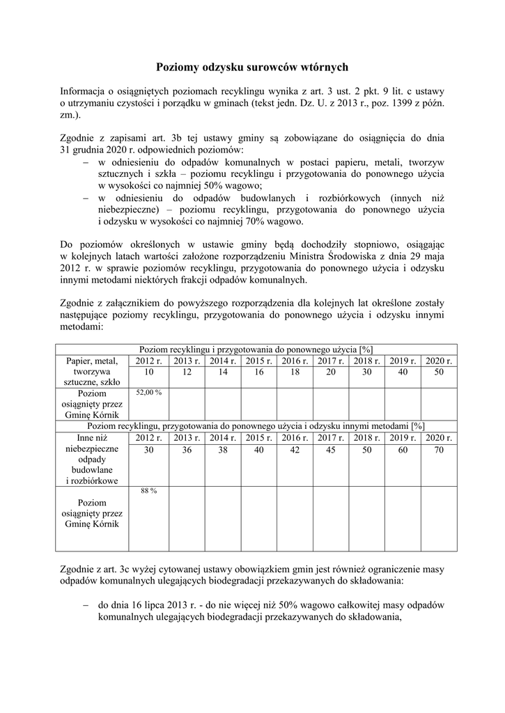 Poziomy odzysku surowców wtórnych Informacja o osiągniętych poziomach recyklingu wynika z art. 3 ust. 2 pkt. 9 lit. c ustawy o utrzymaniu czystości i porządku w gminach (tekst jedn. Dz. U. z 2013 r., poz. 1399 z późn. zm.). Zgodnie z zapisami art. 3b tej ustawy gminy są zobowiązane do osiągnięcia do dnia 31 grudnia 2020 r. odpowiednich poziomów: w odniesieniu do odpadów komunalnych w postaci papieru, metali, tworzyw sztucznych i szkła – poziomu recyklingu i przygotowania do ponownego użycia w wysokości co najmniej 50% wagowo; w odniesieniu do odpadów budowlanych i rozbiórkowych (innych niż niebezpieczne) – poziomu recyklingu, przygotowania do ponownego użycia i odzysku w wysokości co najmniej 70% wagowo. Do poziomów określonych w ustawie gminy będą dochodziły stopniowo, osiągając w kolejnych latach wartości założone rozporządzeniu Ministra Środowiska z dnia 29 maja 2012 r. w sprawie poziomów recyklingu, przygotowania do ponownego użycia i odzysku innymi metodami niektórych frakcji odpadów komunalnych. Zgodnie z załącznikiem do powyższego rozporządzenia dla kolejnych lat określone zostały następujące poziomy recyklingu, przygotowania do ponownego użycia i odzysku innymi metodami: Poziom recyklingu i przygotowania do ponownego użycia [%] Papier, metal, 2012 r. 2013 r. 2014 r. 2015 r. 2016 r. 2017 r. 2018 r. 2019 r. 2020 r. tworzywa 10 12 14 16 18 20 30 40 50 sztuczne, szkło 52,00 % Poziom osiągnięty przez Gminę Kórnik Poziom recyklingu, przygotowania do ponownego użycia i odzysku innymi metodami [%] Inne niż 2012 r. 2013 r. 2014 r. 2015 r. 2016 r. 2017 r. 2018 r. 2019 r. 2020 r. niebezpieczne 30 36 38 40 42 45 50 60 70 odpady budowlane i rozbiórkowe 88 % Poziom osiągnięty przez Gminę Kórnik Zgodnie z art. 3c wyżej cytowanej ustawy obowiązkiem gmin jest również ograniczenie masy odpadów komunalnych ulegających biodegradacji przekazywanych do składowania: do dnia 16 lipca 2013 r. - do nie więcej niż 50% wagowo całkowitej masy odpadów komunalnych ulegających biodegradacji przekazywanych do składowania, do dnia 16 lipca 2020 r. - do nie więcej niż 35% wagowo całkowitej masy odpadów komunalnych ulegających biodegradacji przekazywanych do składowania w stosunku do masy tych odpadów wytworzonych w 1995 r. Poziomy do osiągnięcia w poszczególnych latach, a także sposoby ich obliczania zostały określone w rozporządzeniu Ministra Środowiska z dnia 25 maja 2012 r. w sprawie poziomów ograniczenia masy odpadów komunalnych ulegających biodegradacji przekazywanych do składowania oraz sposobu obliczania poziomu ograniczania masy tych odpadów. Zgodnie z załącznikiem do powyższego rozporządzenia dla kolejnych lat określone zostały następujące poziomy: 2012 Rok 75 Dopuszczalny poziom masy odpadów komunalnych ulegających biodegradacji przekazywanych do składowania w stosunku do masy tych odpadów wytworzonych w 1995 r. [%] Poziom osiągnięty przez Gminę Kórnik 5,20 % do 16 lipca 2013 50 2014 2015 2016 2017 2018 2019 50 50 45 45 40 40 do 16 lipca 2020 35